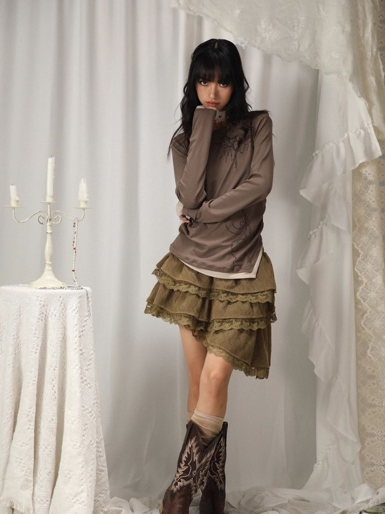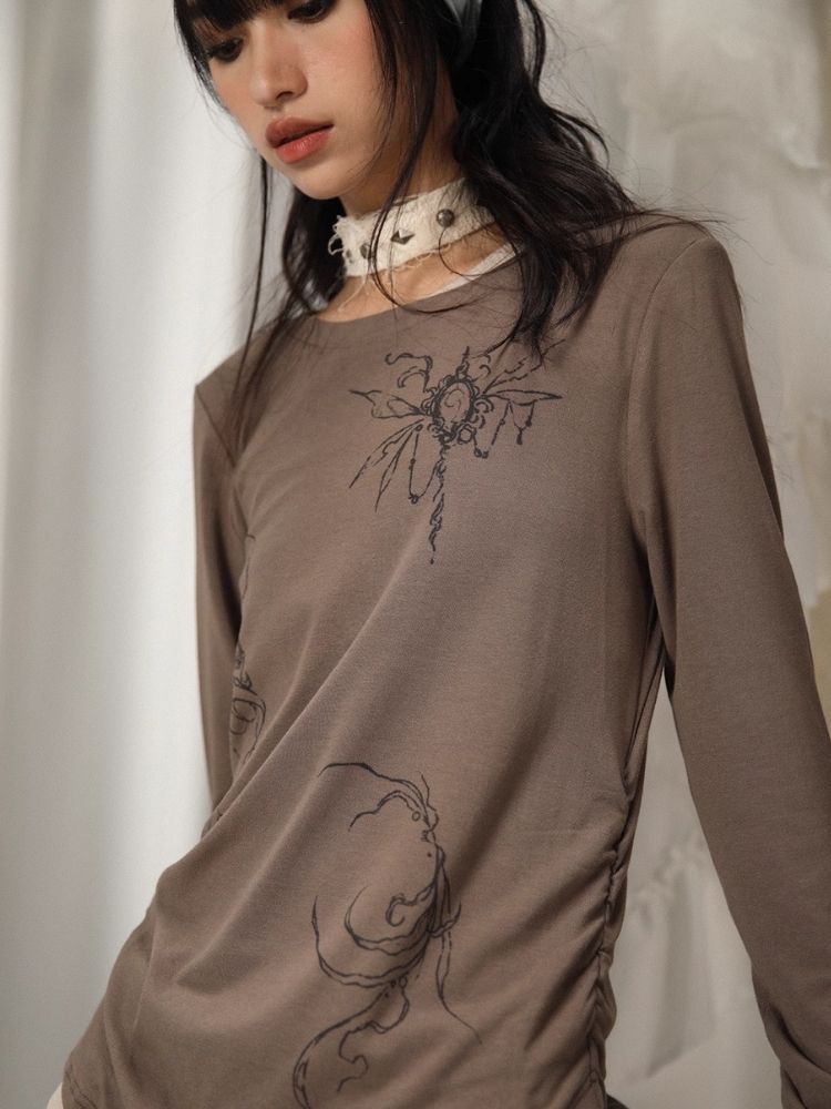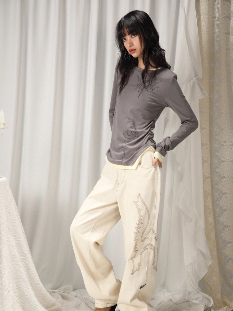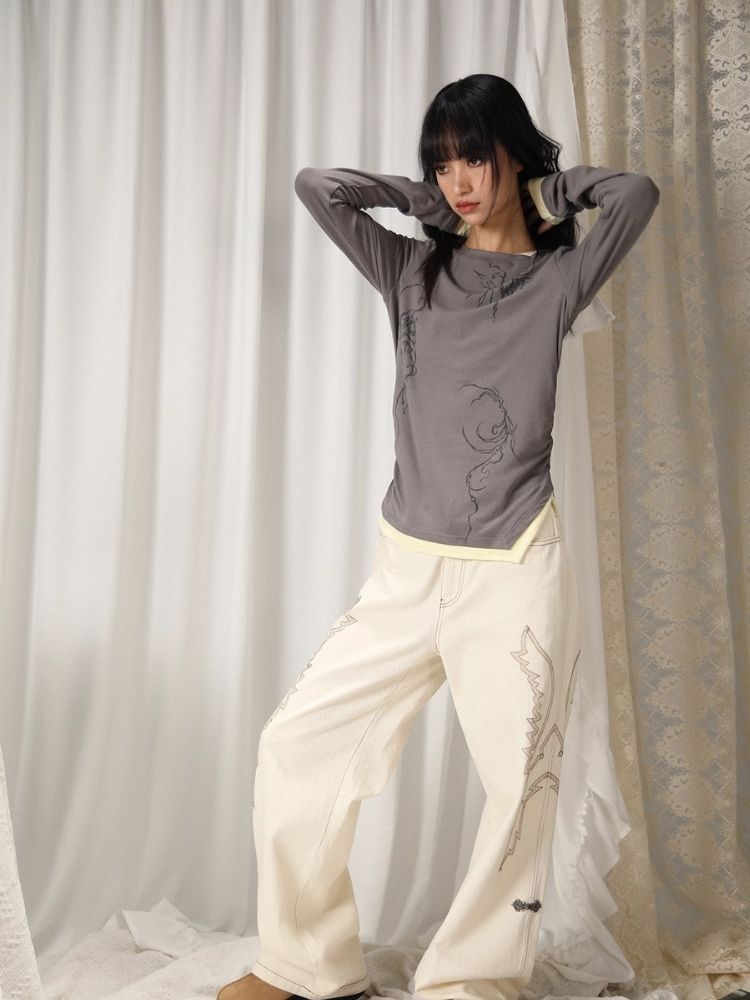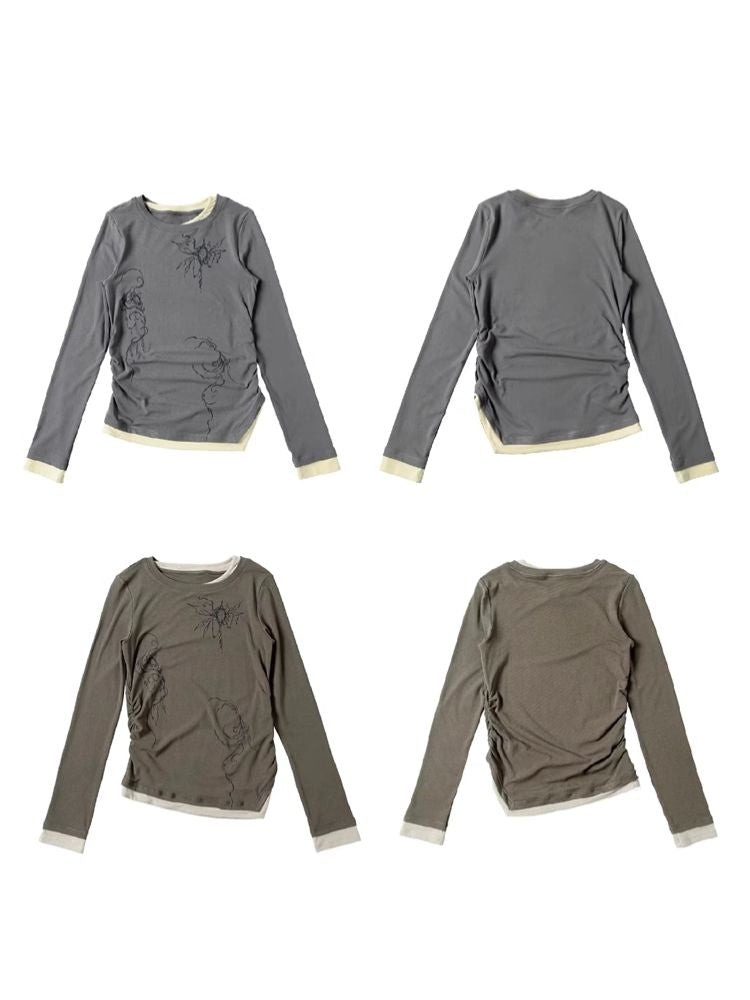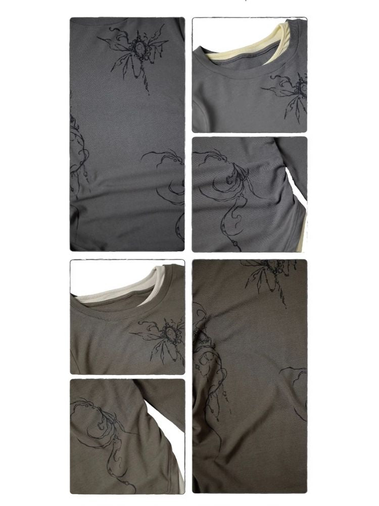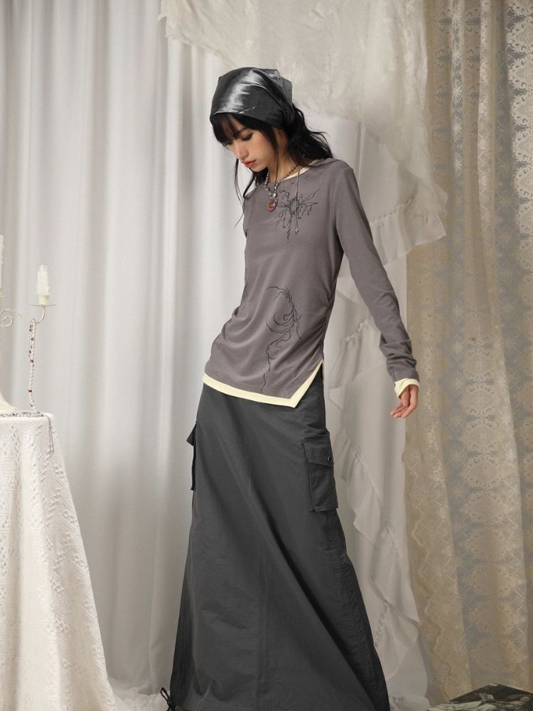 Fake Two Irregular Hem Printed Long Sleeve T-Shirt【s0000005746】