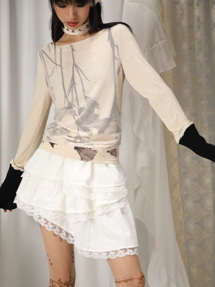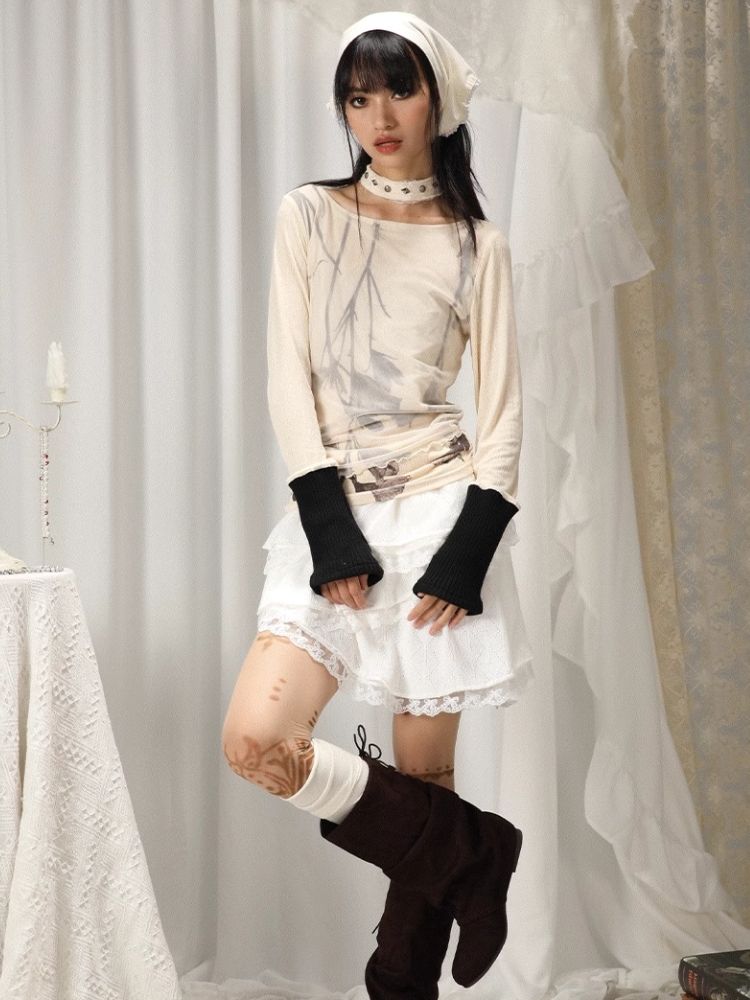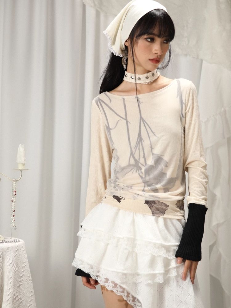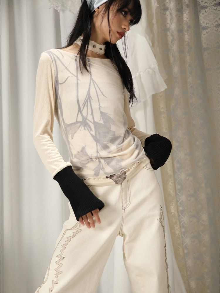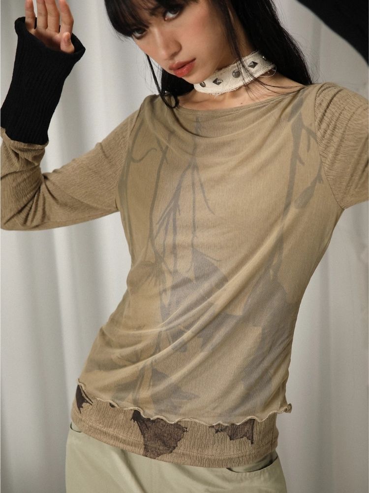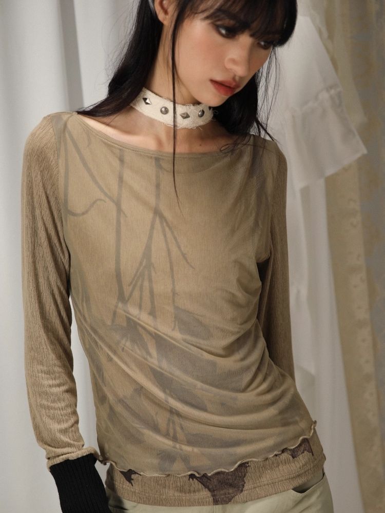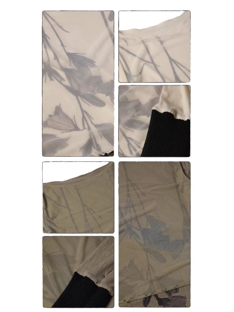 Printed Mesh Fake Two Piece Long Sleeve T-Shirt【s0000005749】