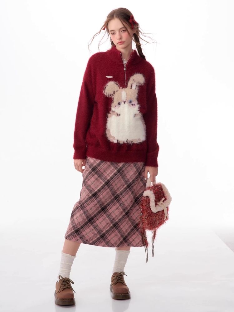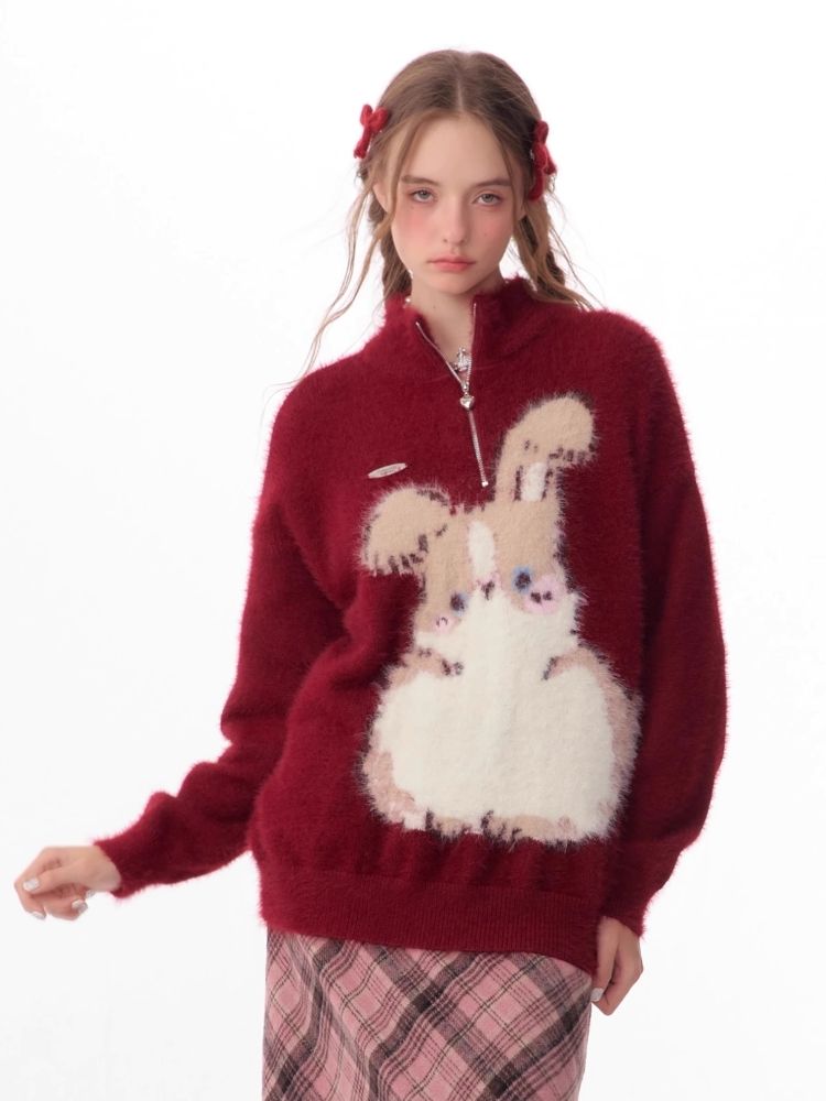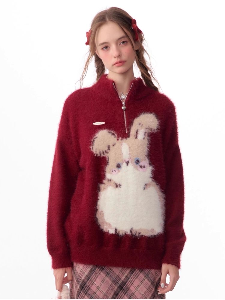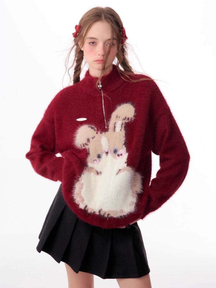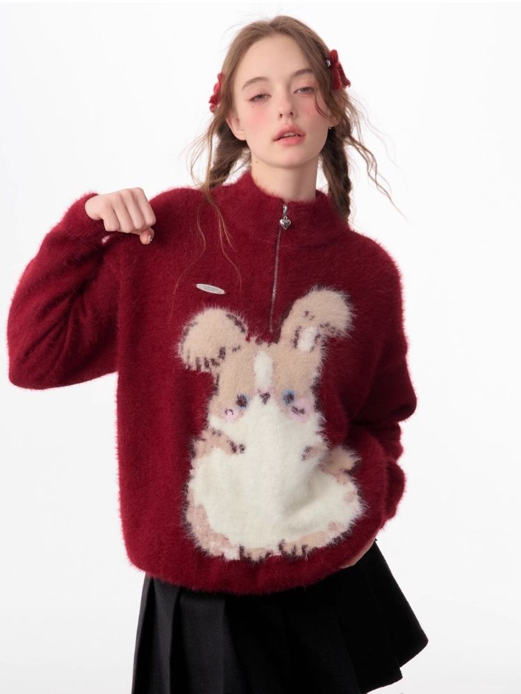 Half High Neck Plush Rabbit Red Sweater【s0000006166】