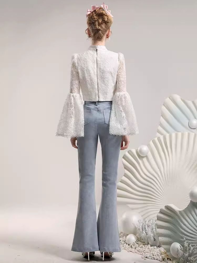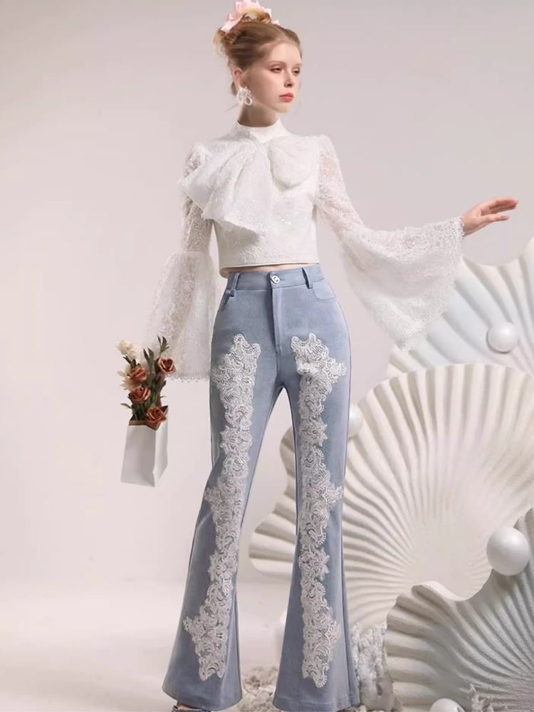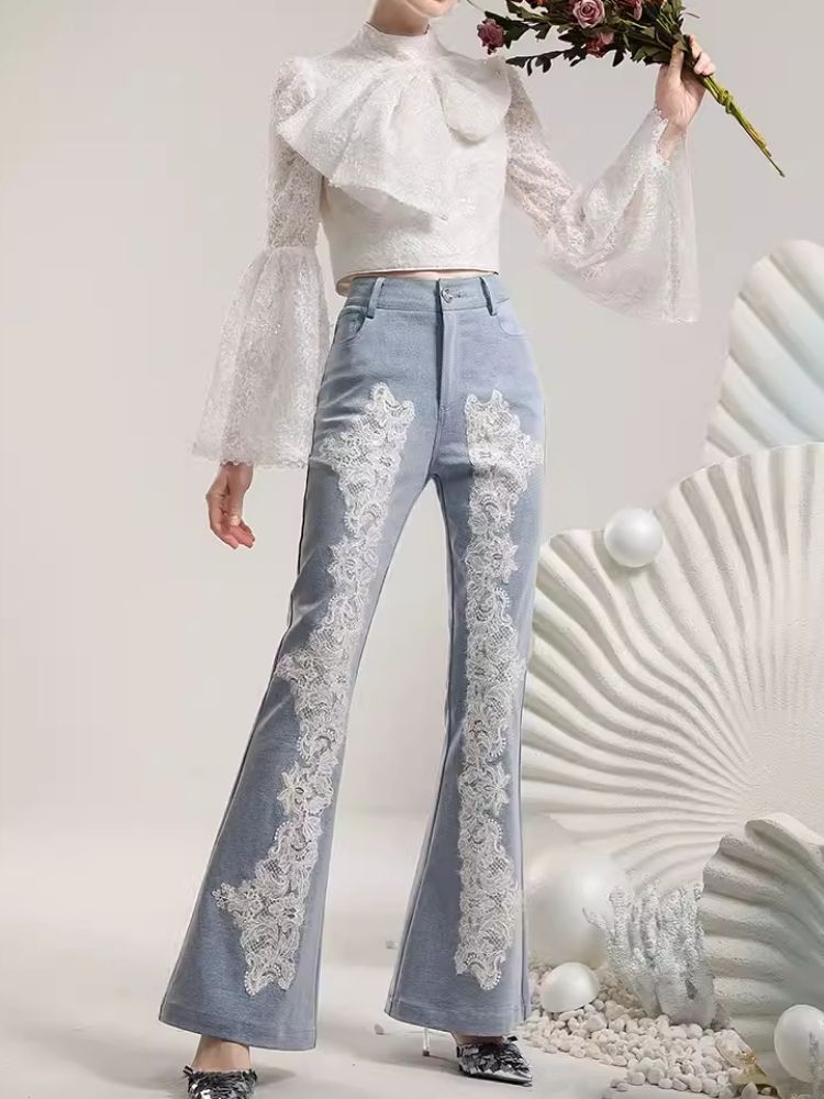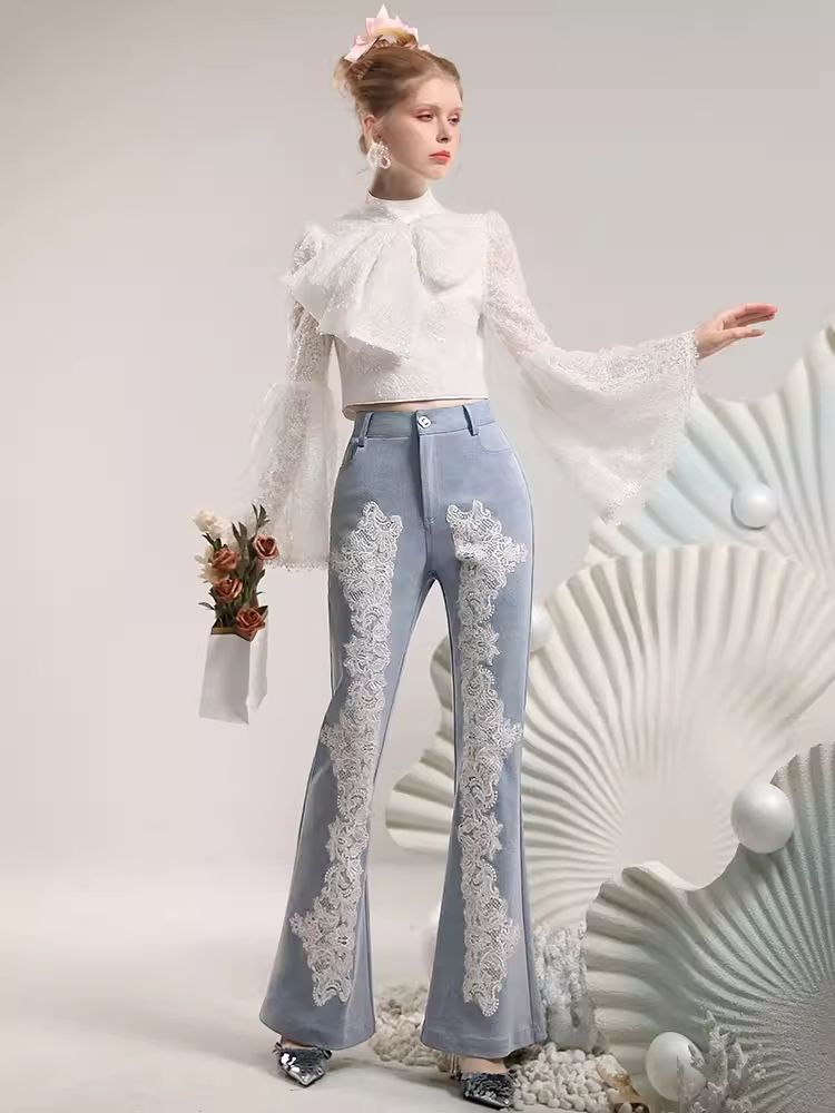 Heavy Lace Flower Waisted Slim Flared Pants【s0000006835】