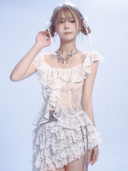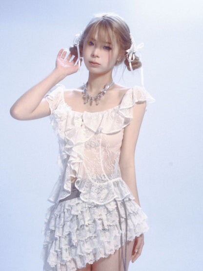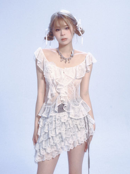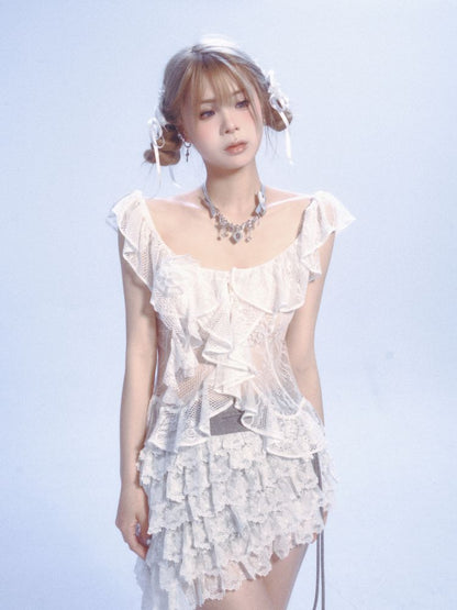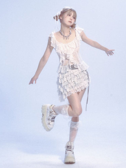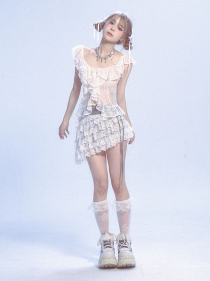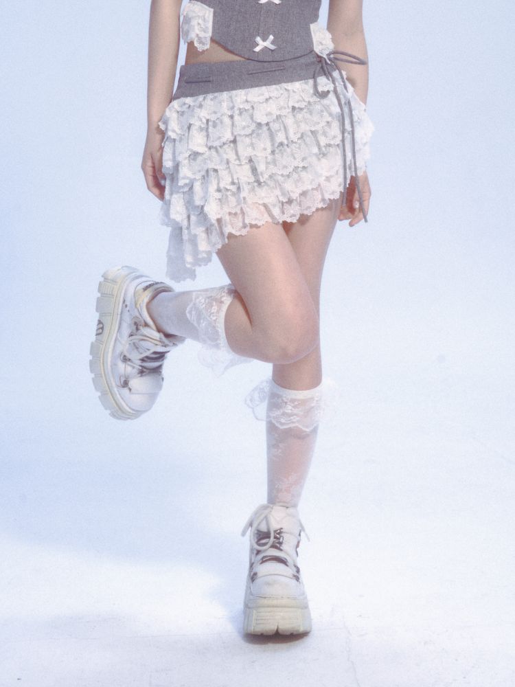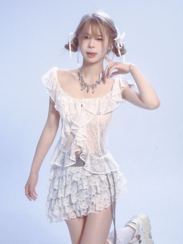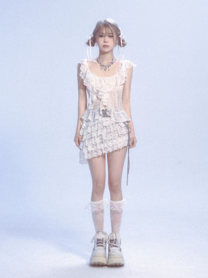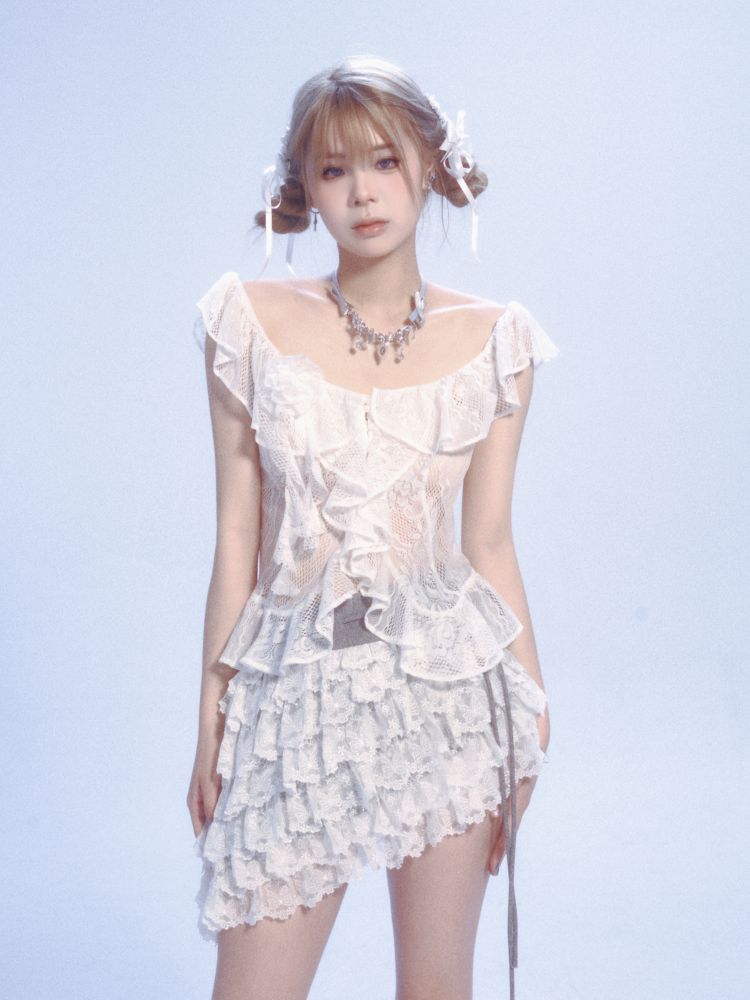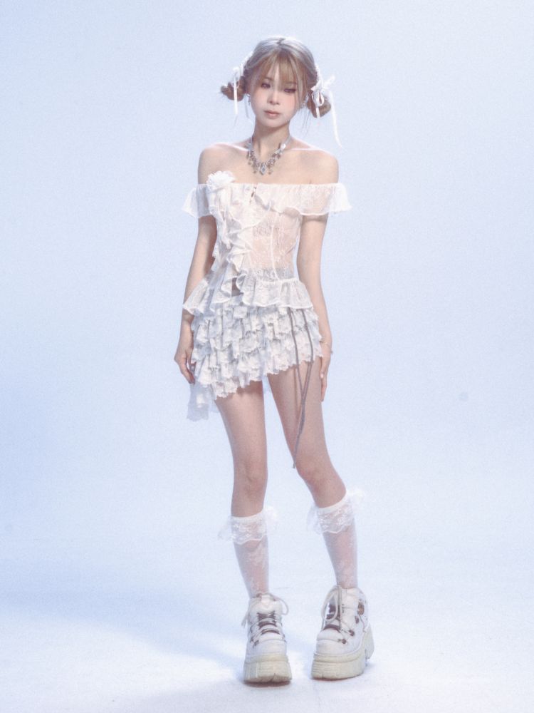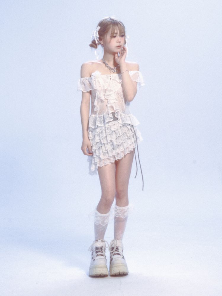 Lace Draw Pleat Patchwork Halter Skirt【s0000007444】