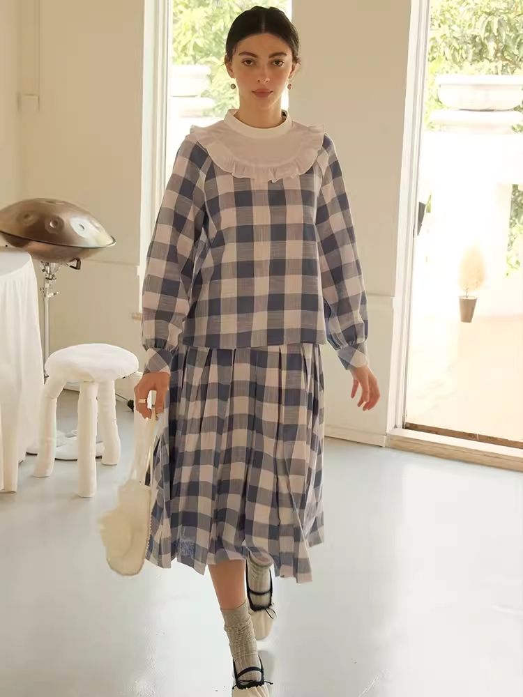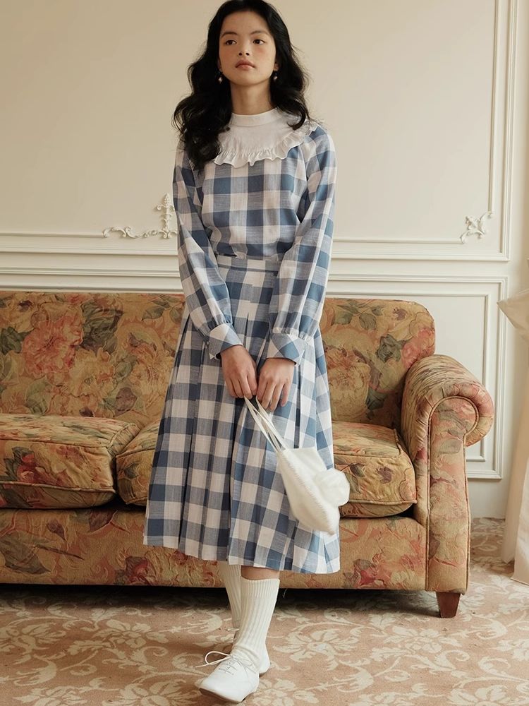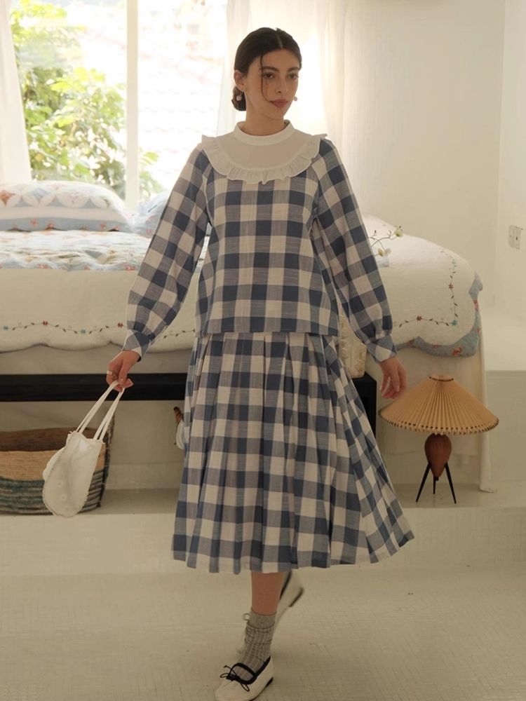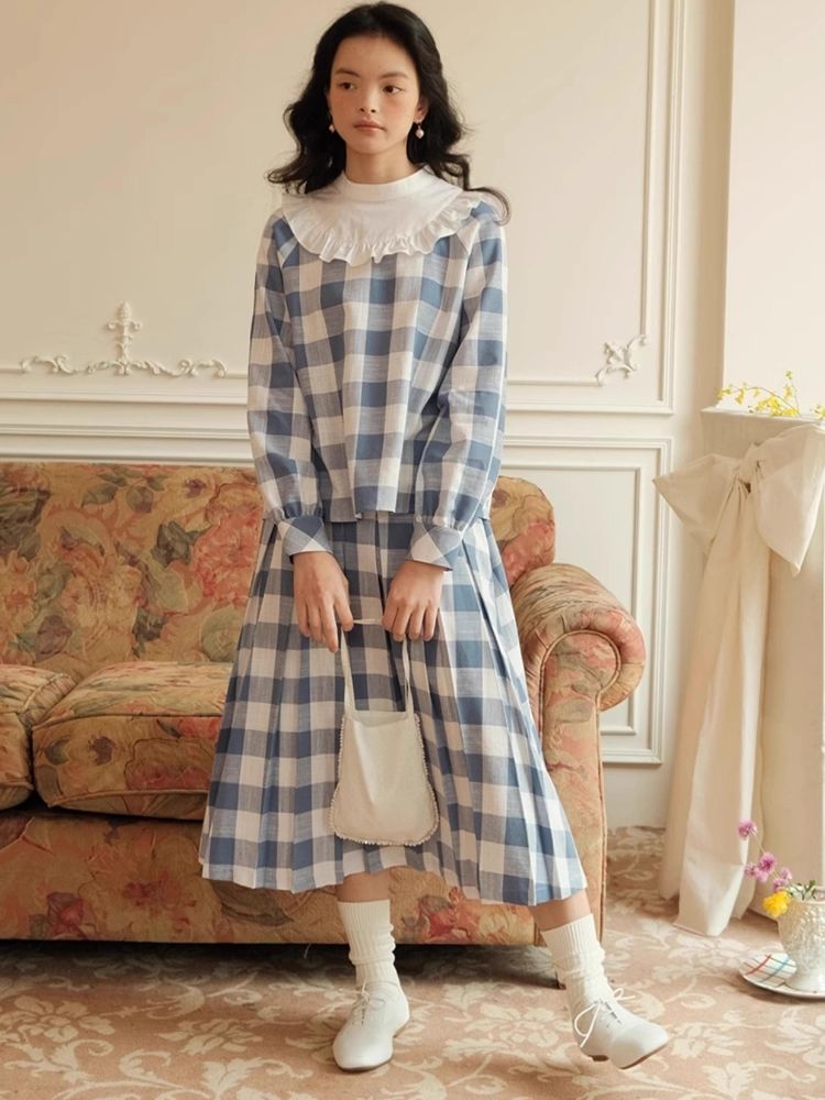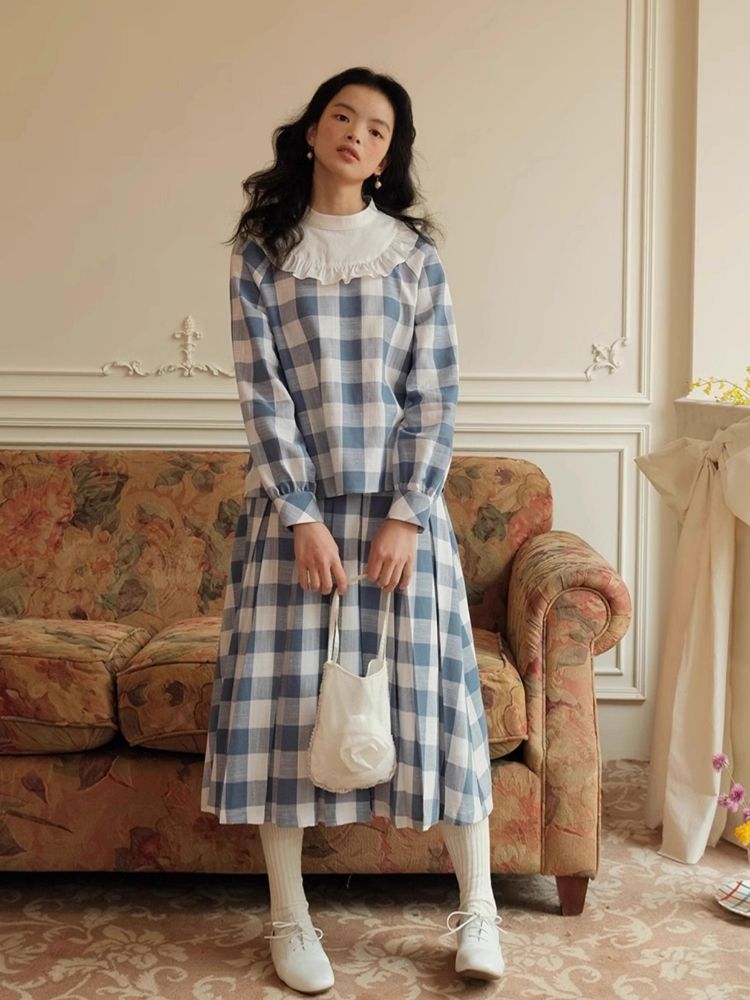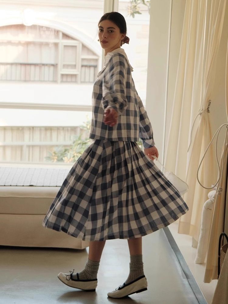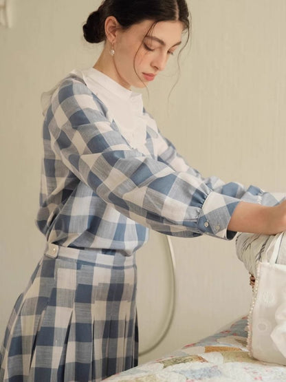 Standing Collar Check Linen Cotton Shirt/Pleated Skirt Set【s0000007483】