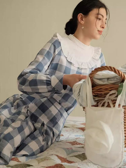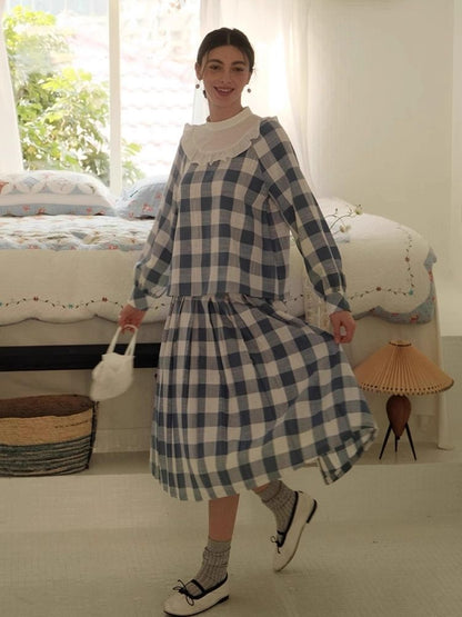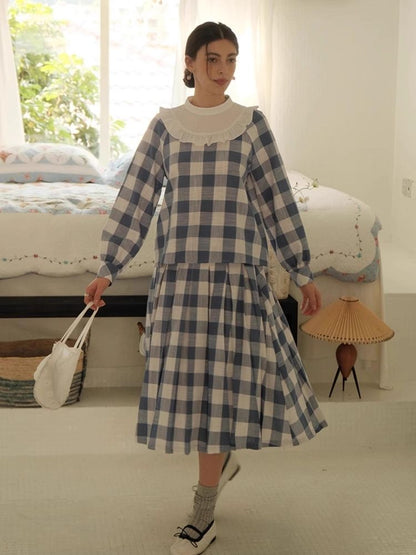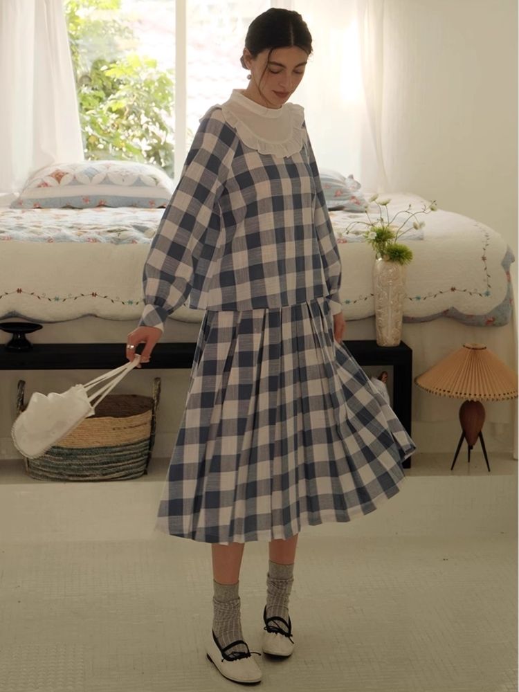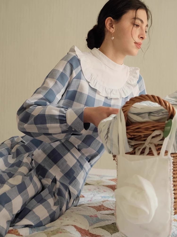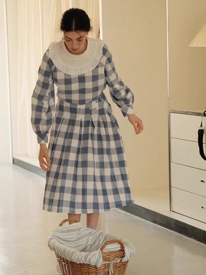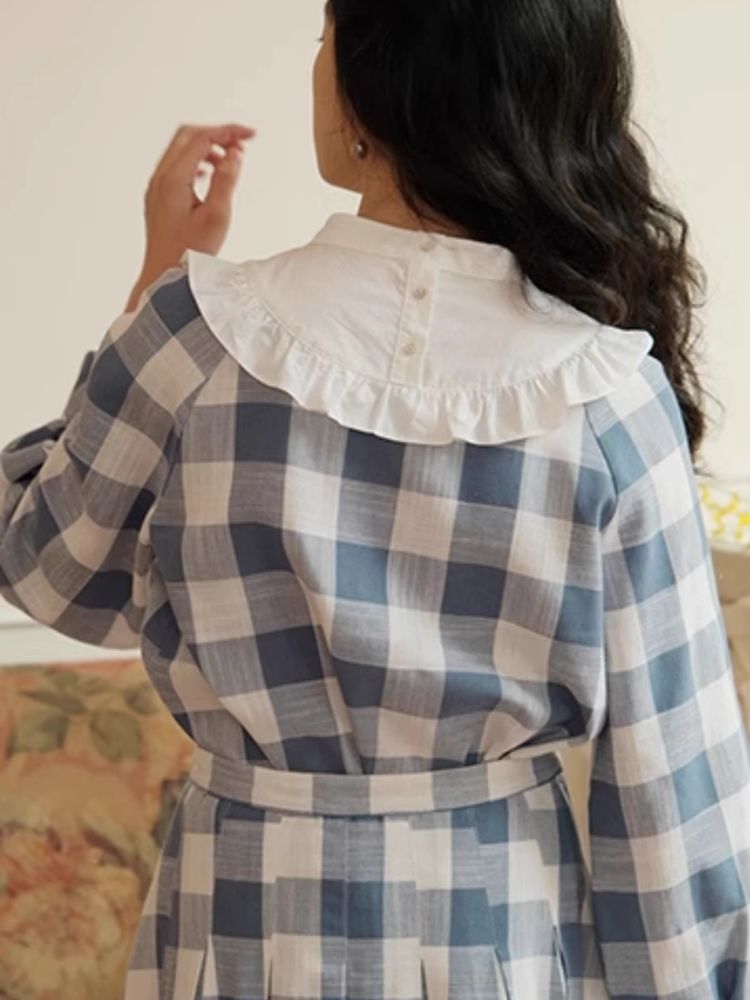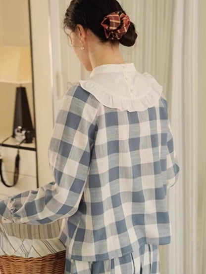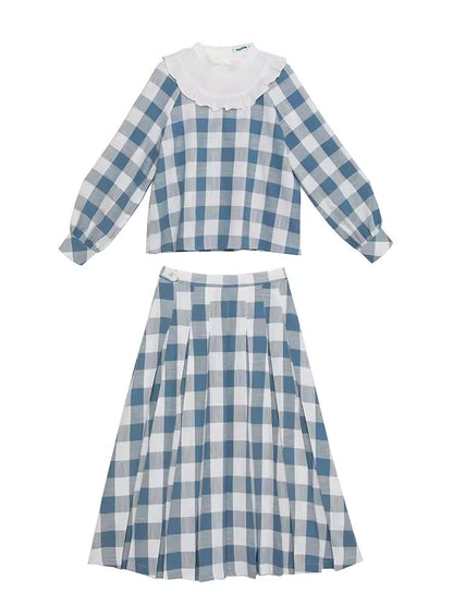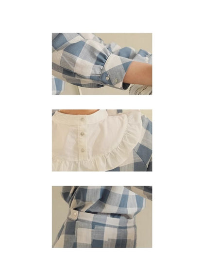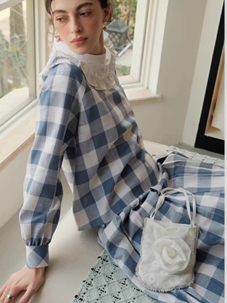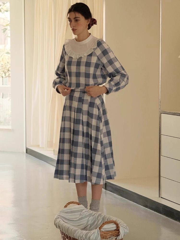 Standing Collar Check Linen Cotton Shirt/Pleated Skirt Set【s0000007483】