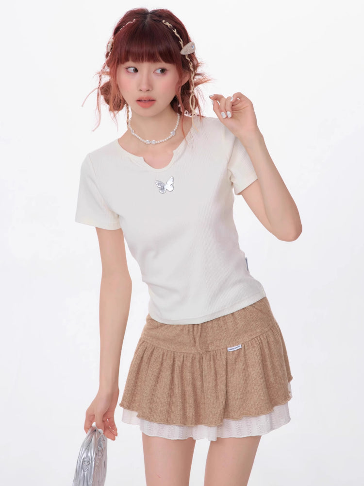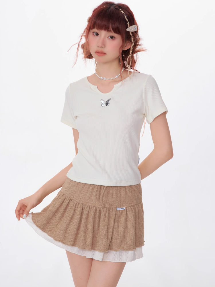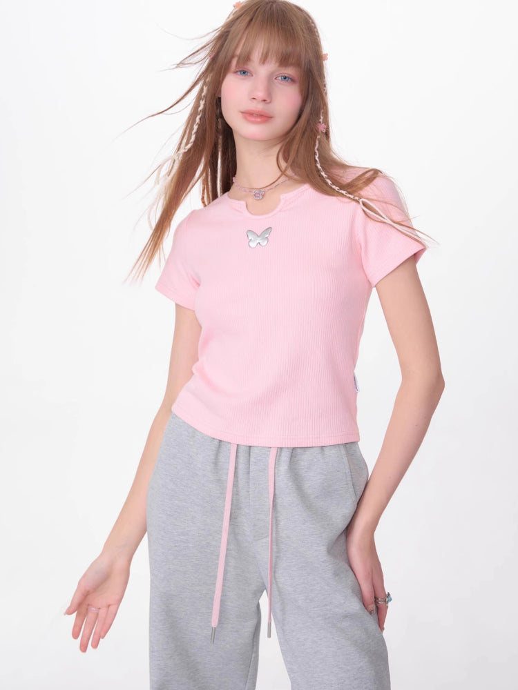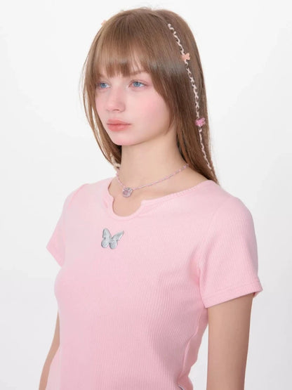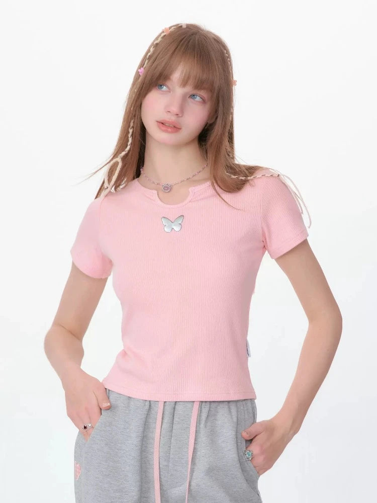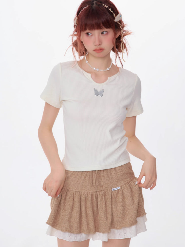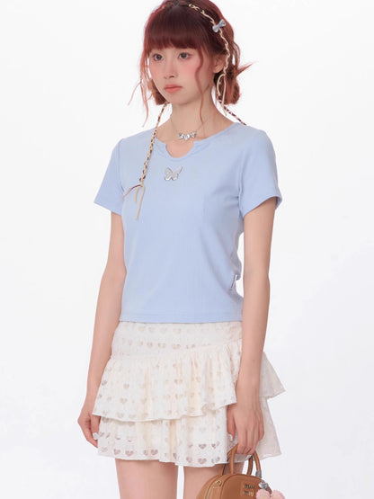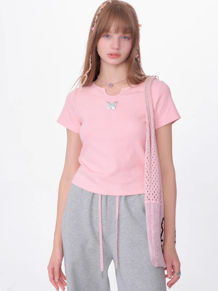 U-neck butterfly short sleeve T-shirt【s0000007536】