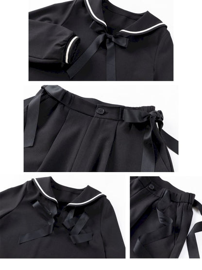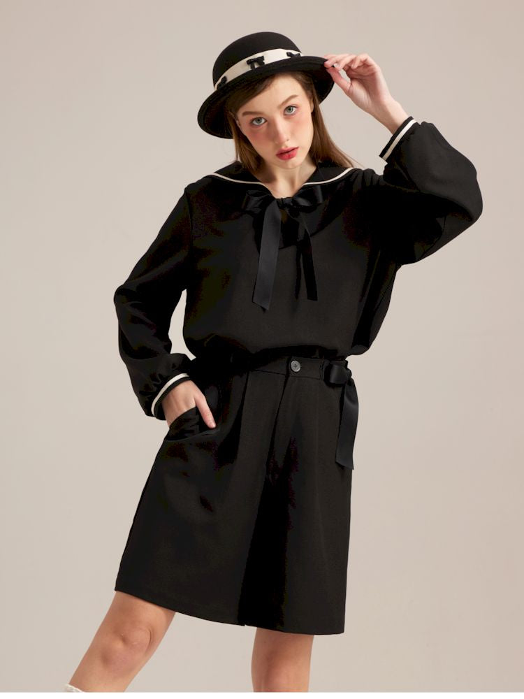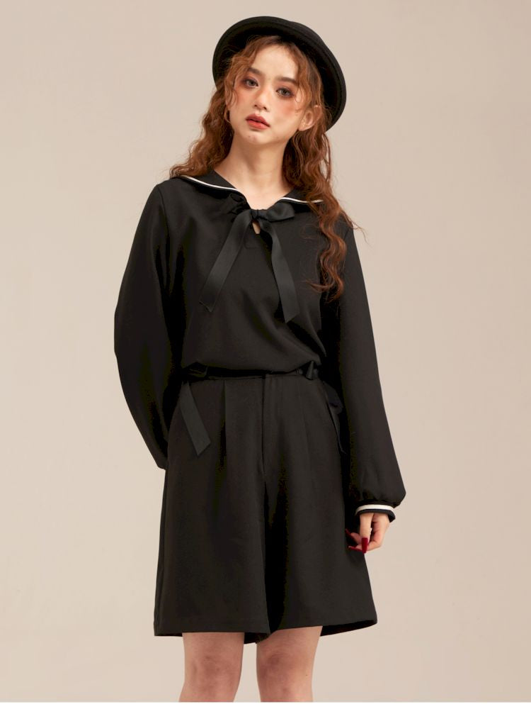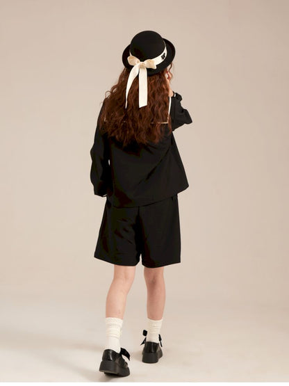 Navy Neck Long Sleeve Top Loose Shorts Customized Set【s0000007660】