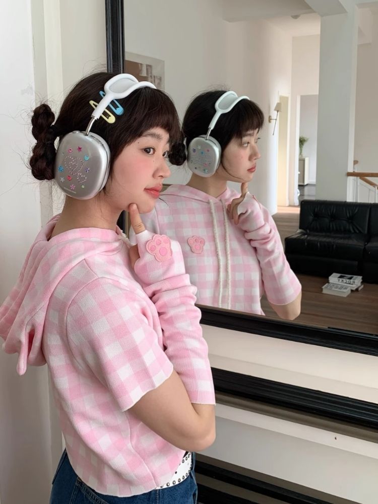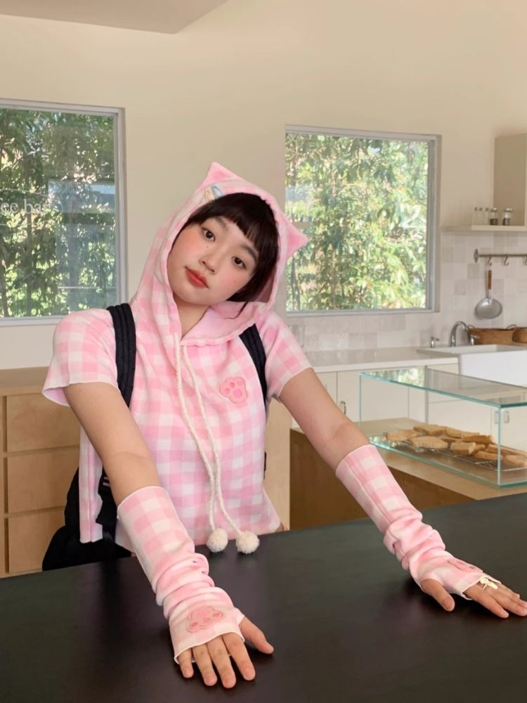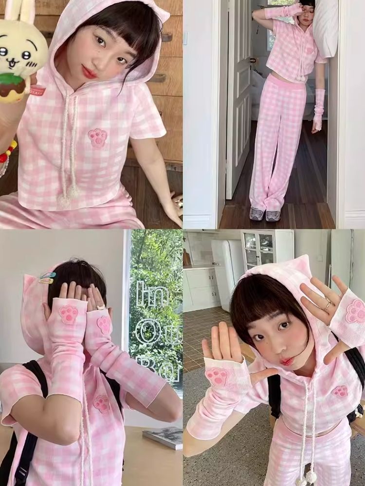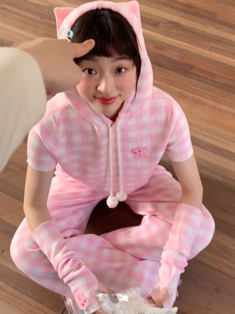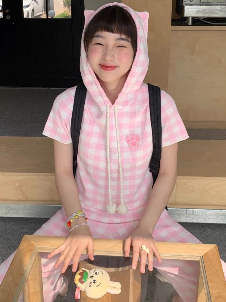 Cat Ears Hooded Short Sleeve Creamy Pink Plaid Knit Pants【s0000007708】