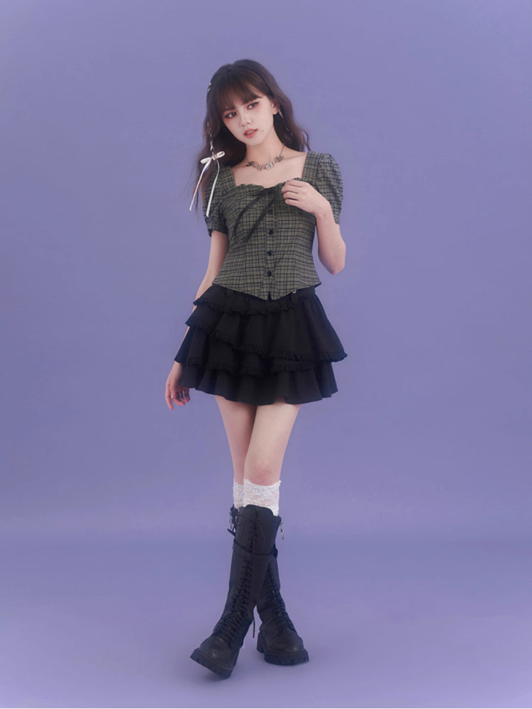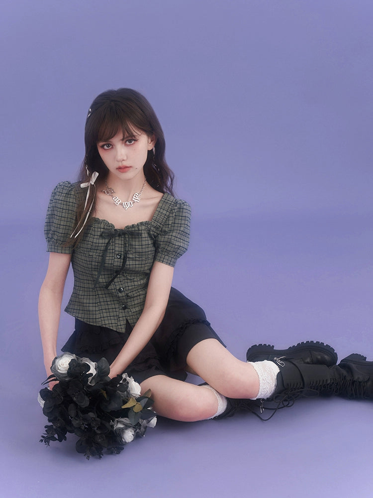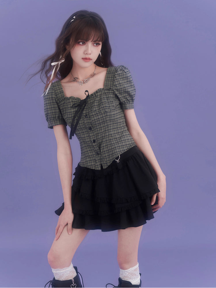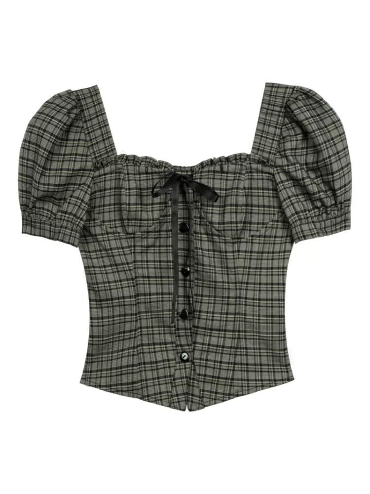 Puff sleeve plaid short sleeve shirt【s0000007845】