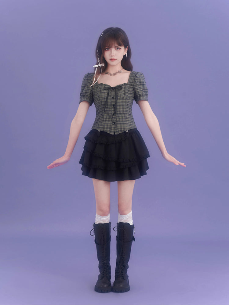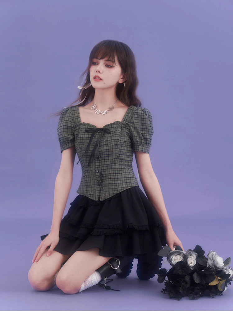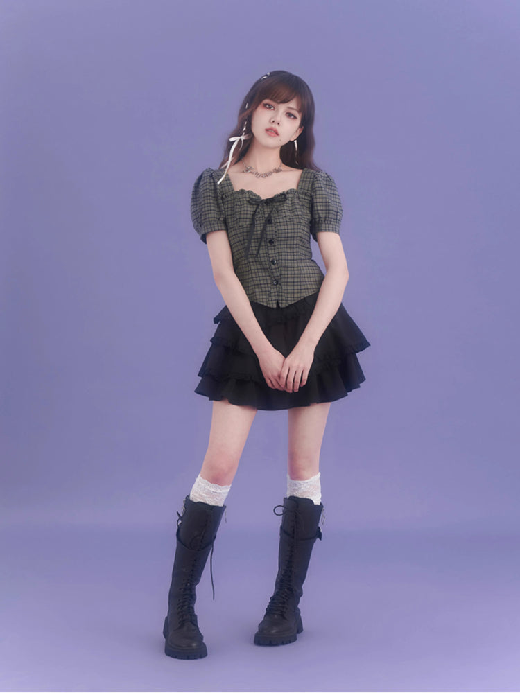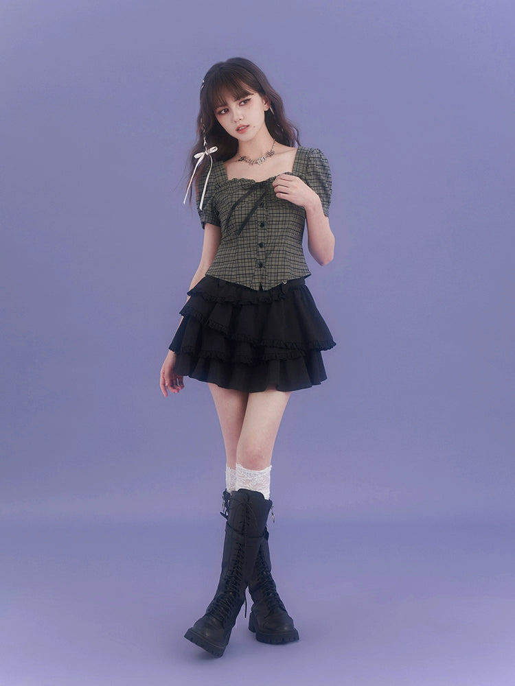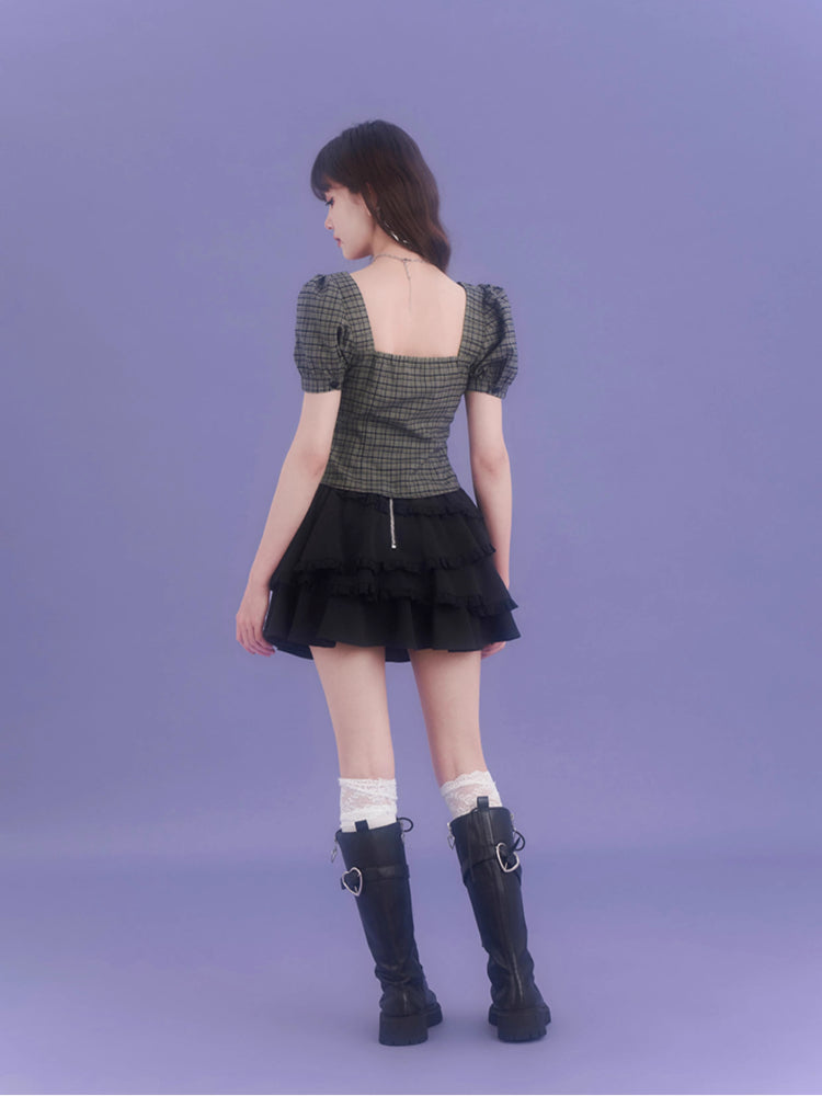 Puff sleeve plaid short sleeve shirt【s0000007845】