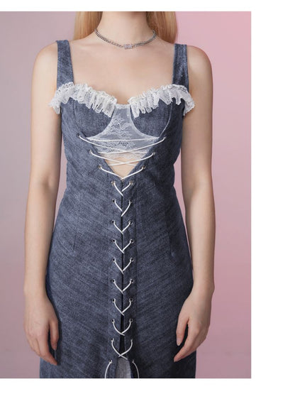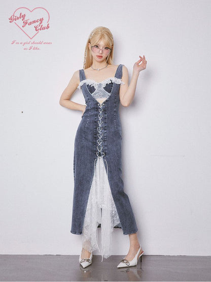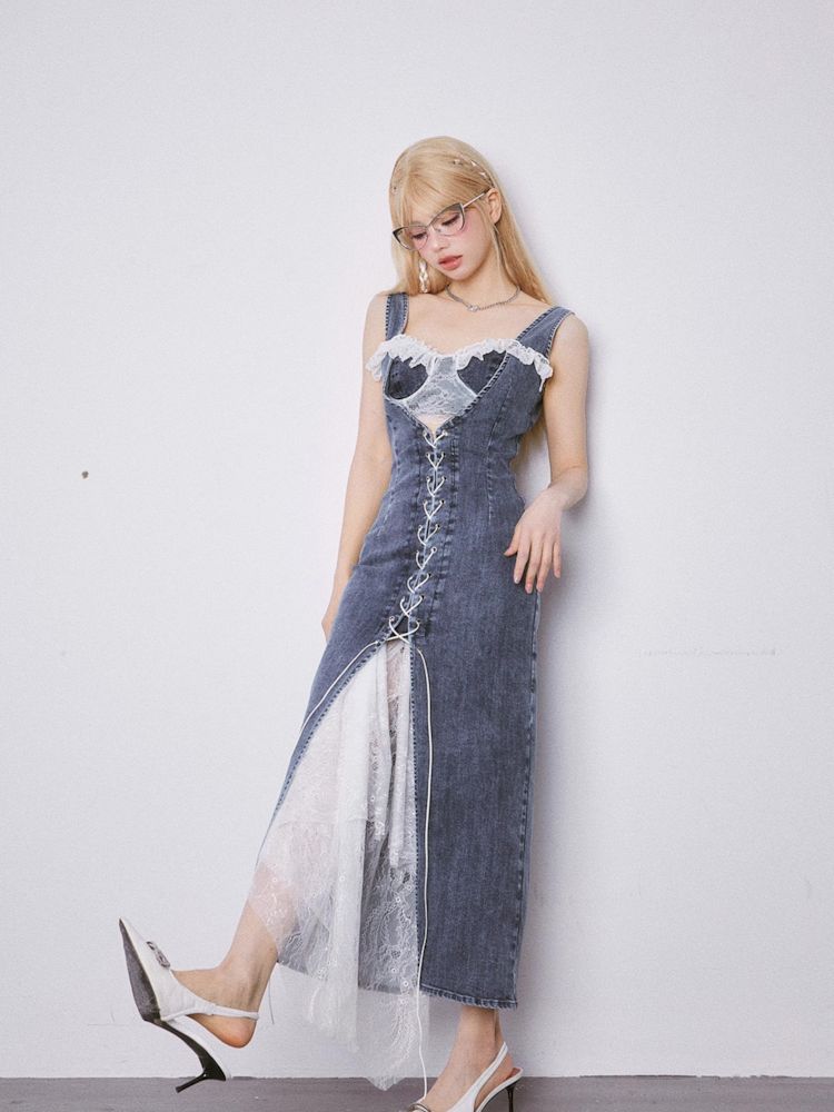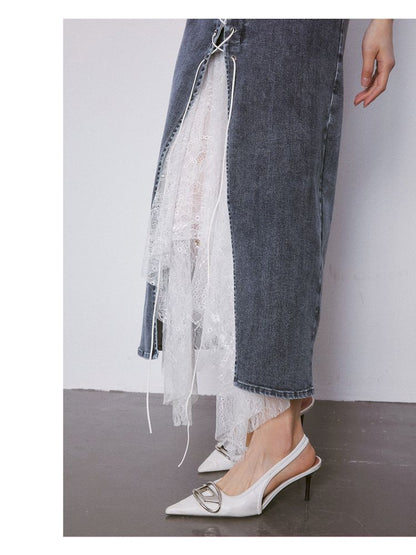 Lace Splicing Lace Tie Slim Split Denim Long Skirt【s0000007851】