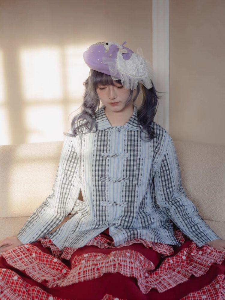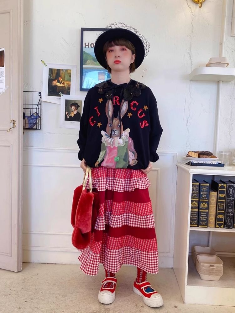 Red embroidery patchwork plaid hem half skirt【s0000007941】