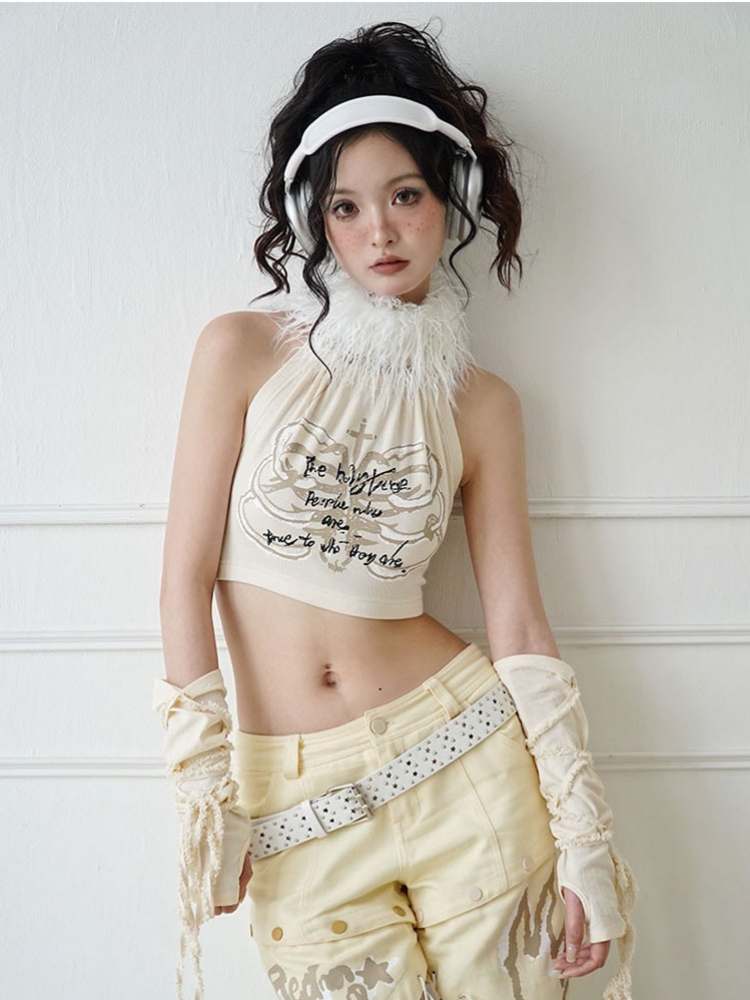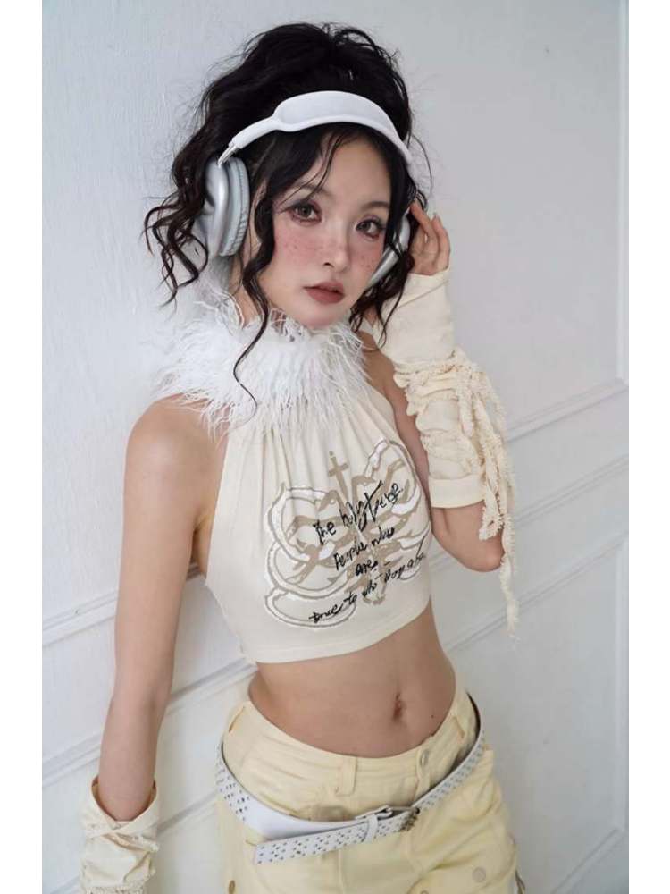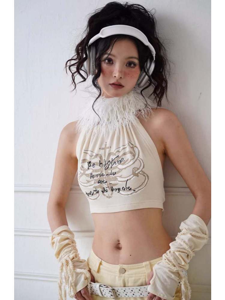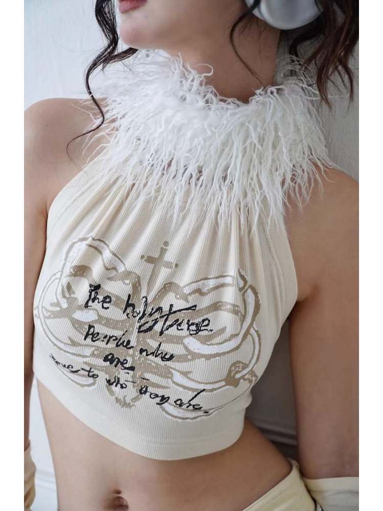 Original Printed Open Back Removable Fur Collar Tube Top Vest【s0000008142】