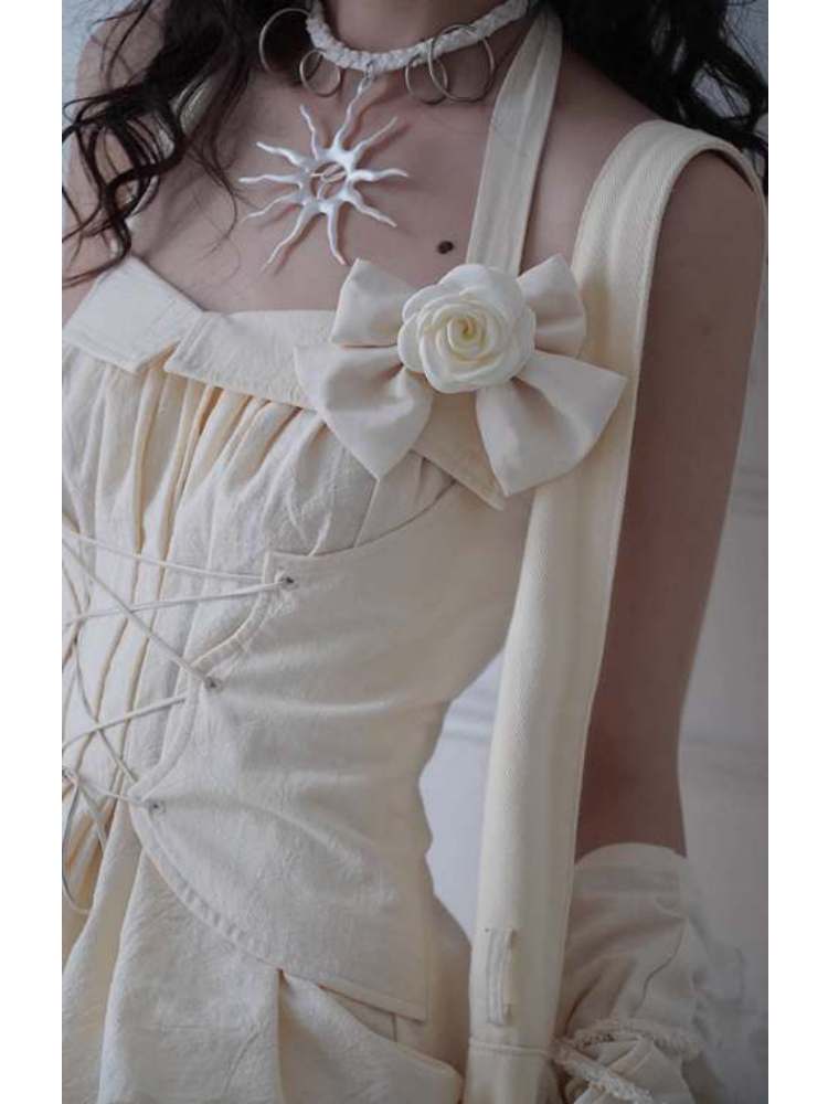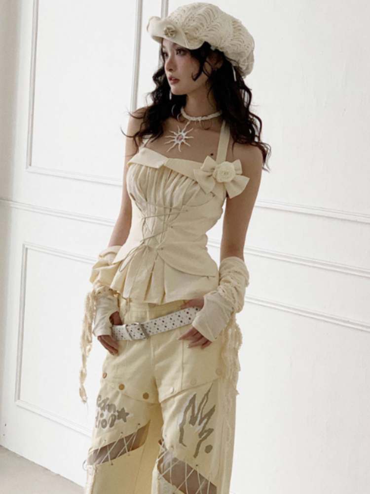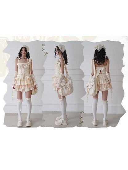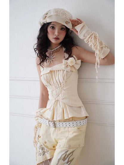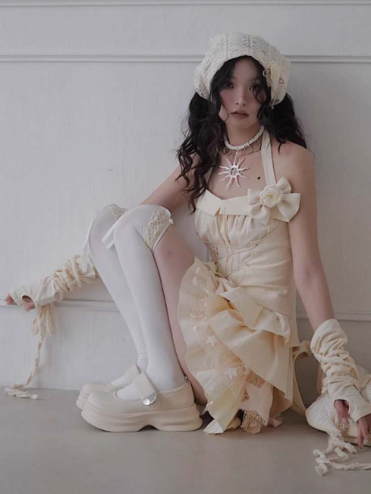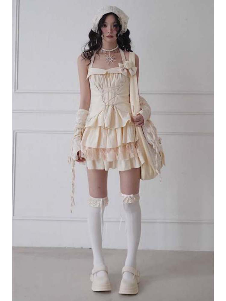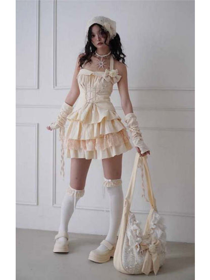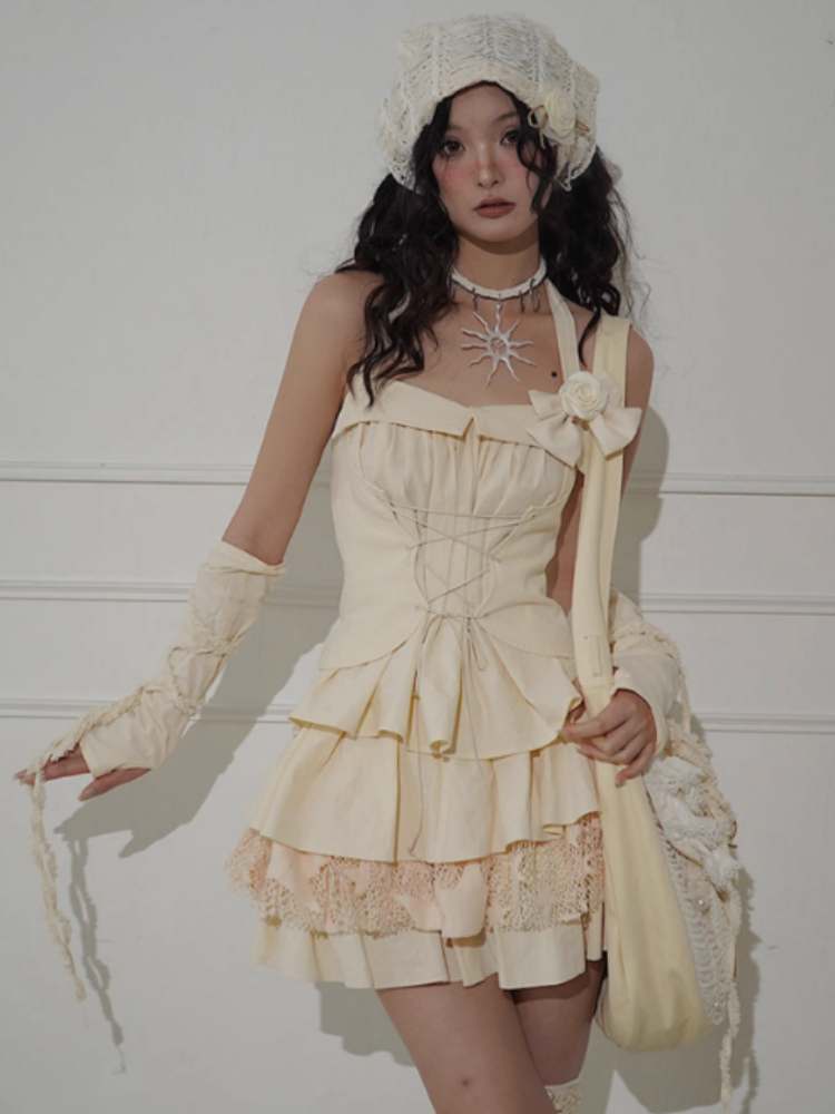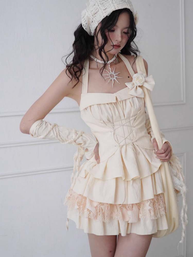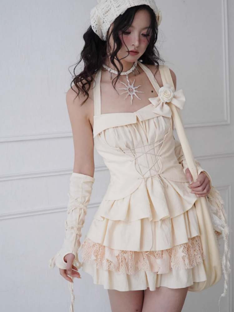 Lace-Up Halter Neck Tops & Shirring Waist Tiered Skirt【s0000008148】