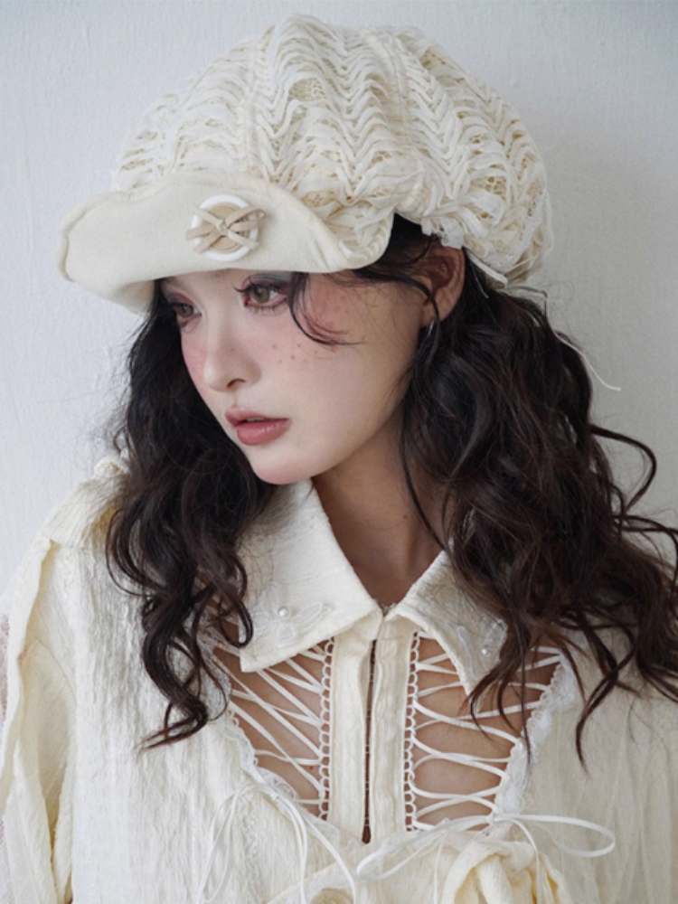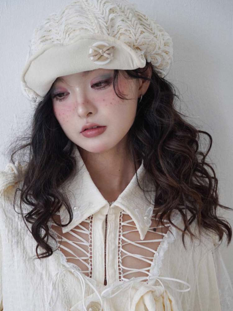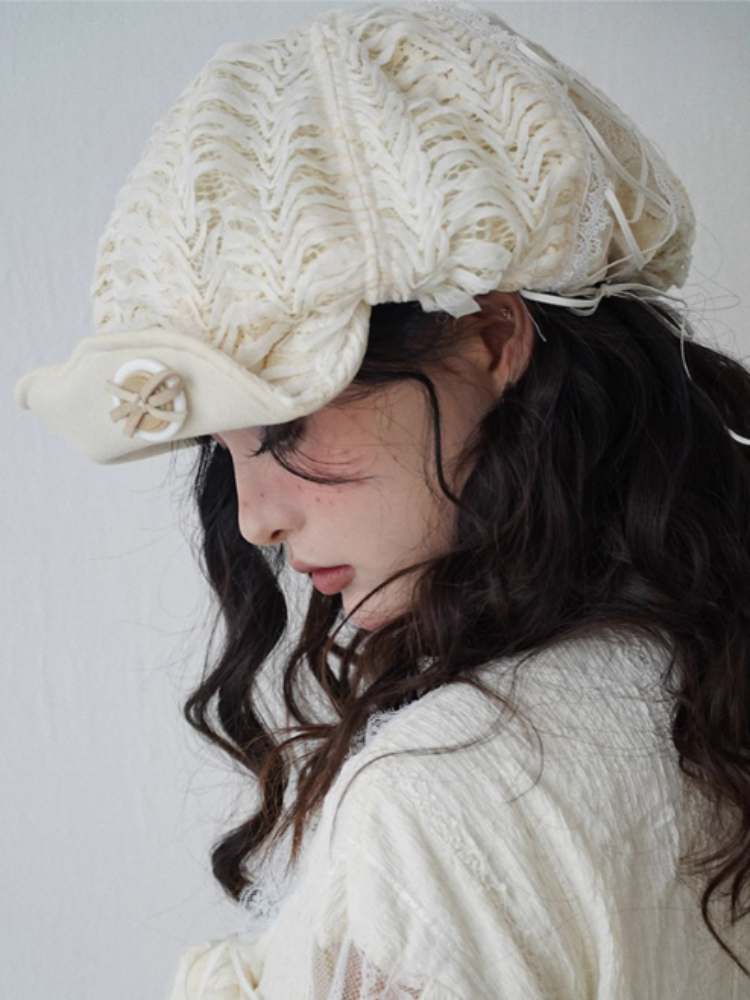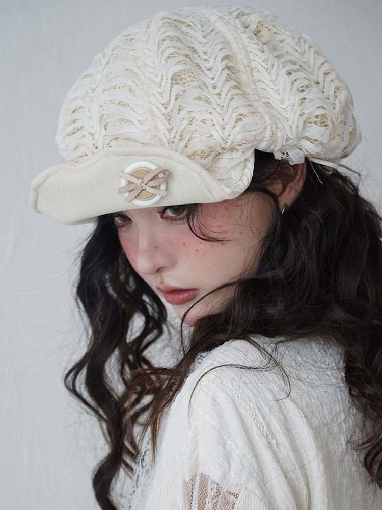 Lace-Up Bowknot & Button Beret Hat【s0000008153】