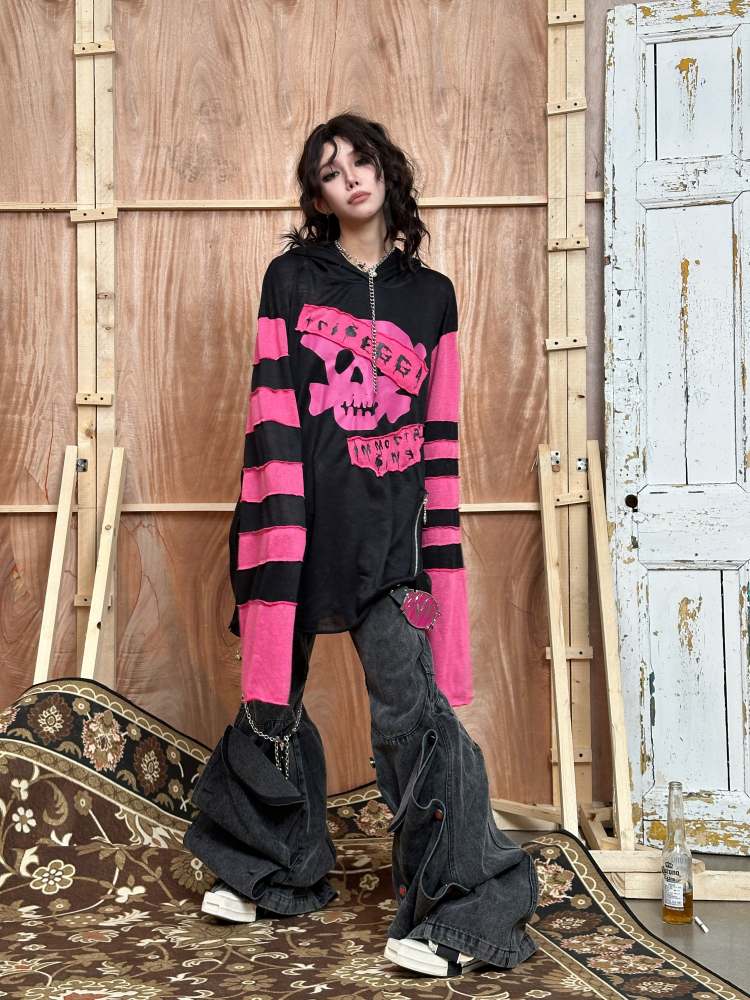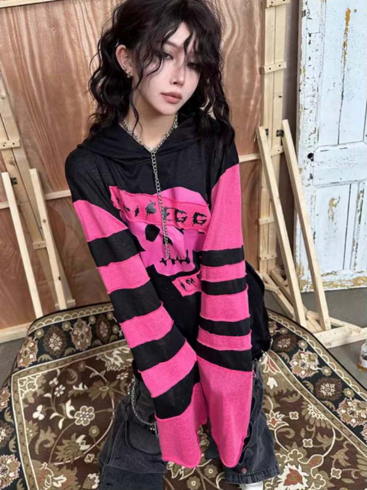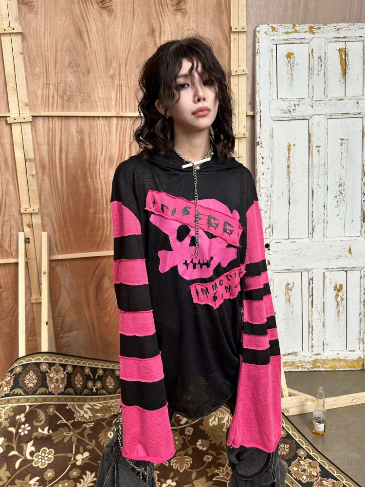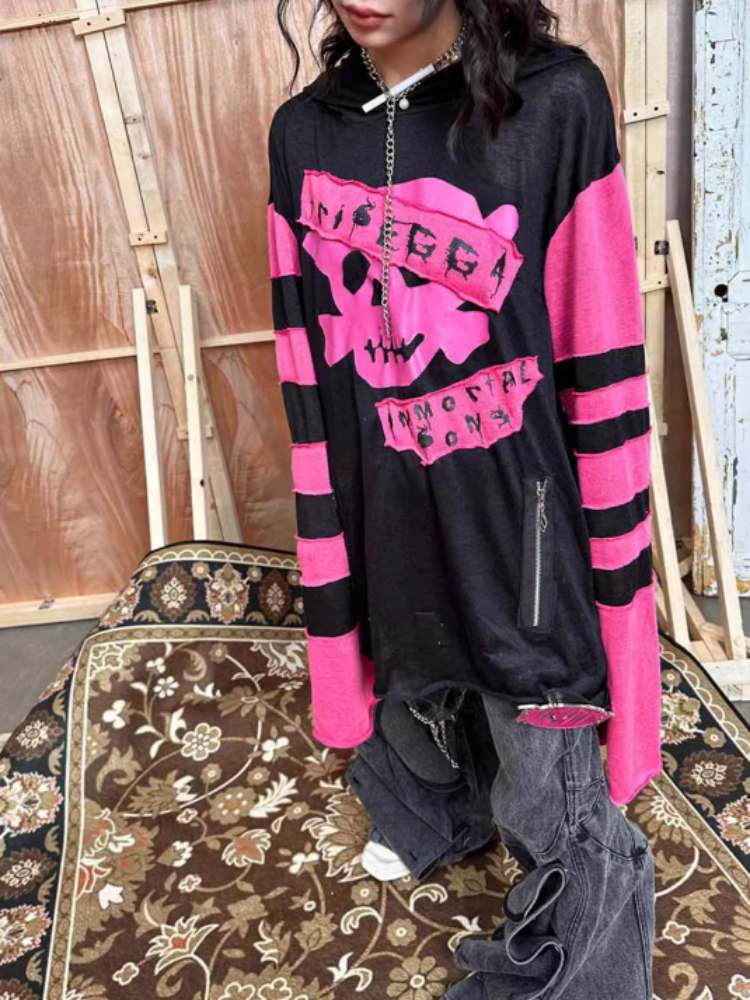 Rock Punk Skull Print Striped Sleeve Hoodie【s0000008314】