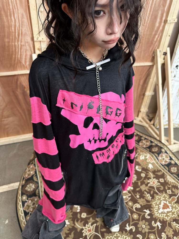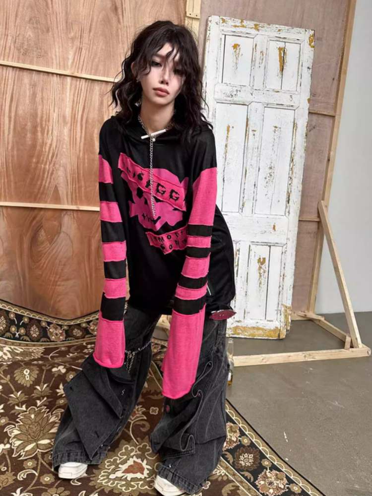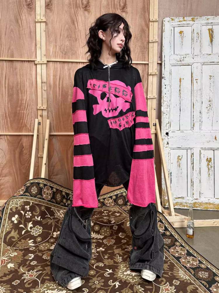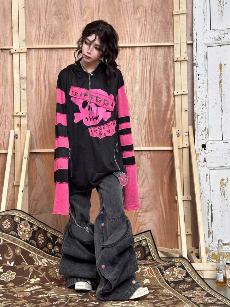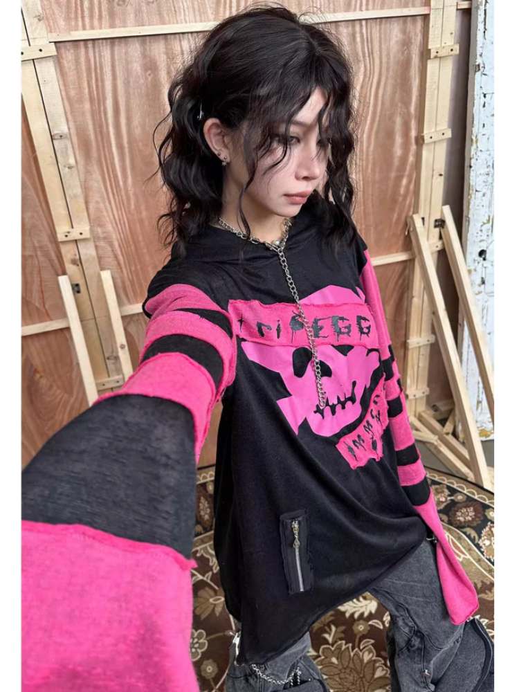 Rock Punk Skull Print Striped Sleeve Hoodie【s0000008314】