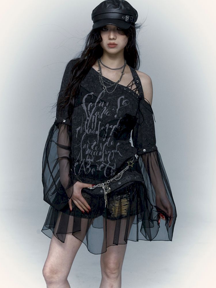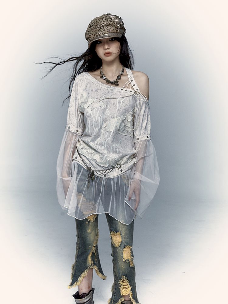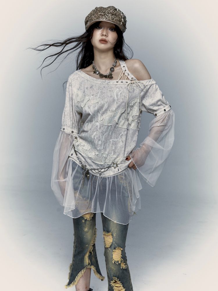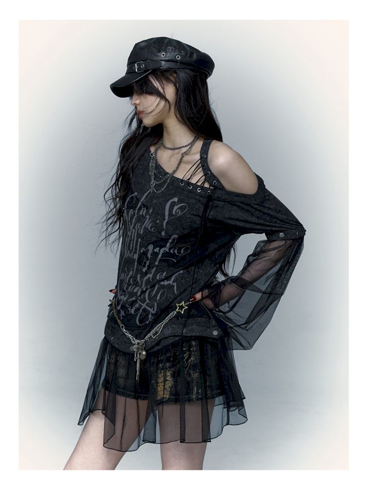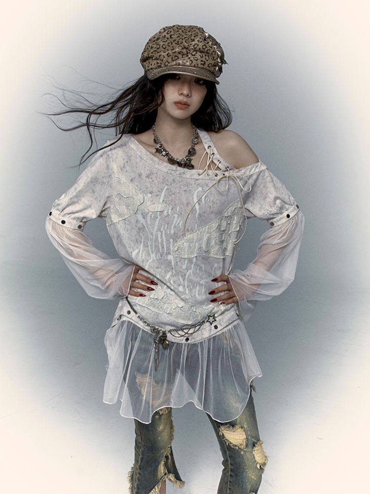 Spliced Mesh Removable Sleeve Strapless T-Shirt【s0000008399】
