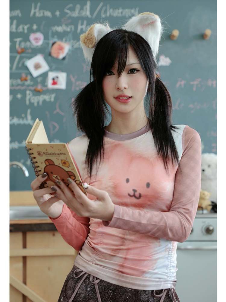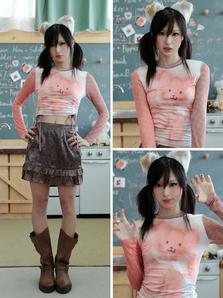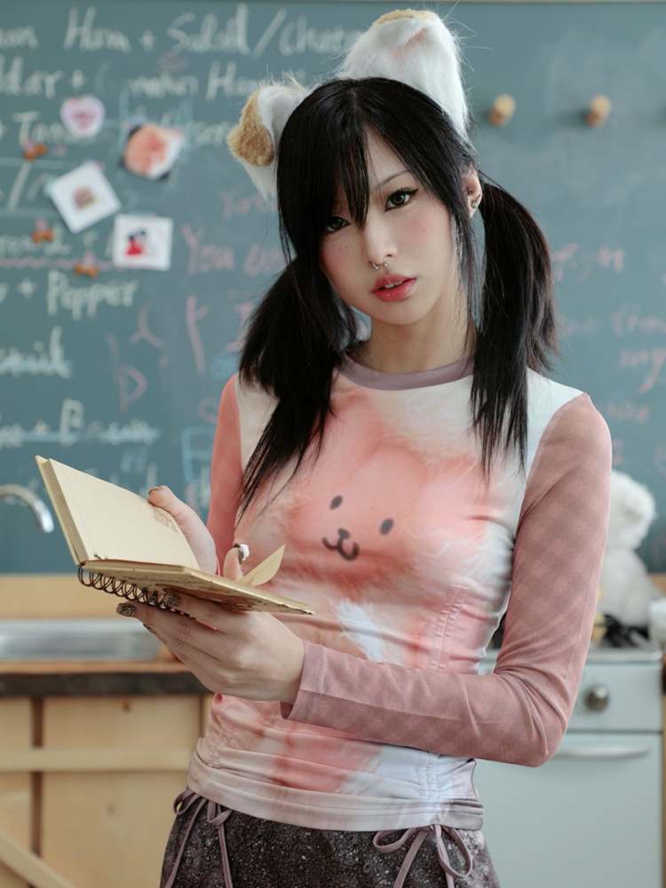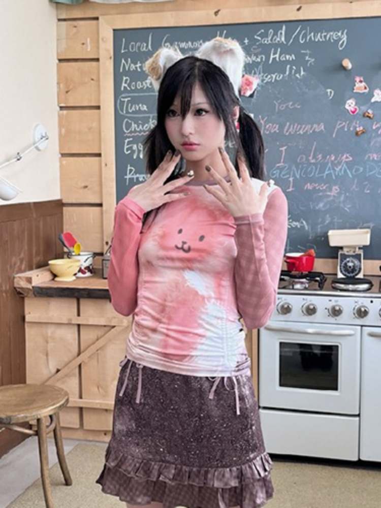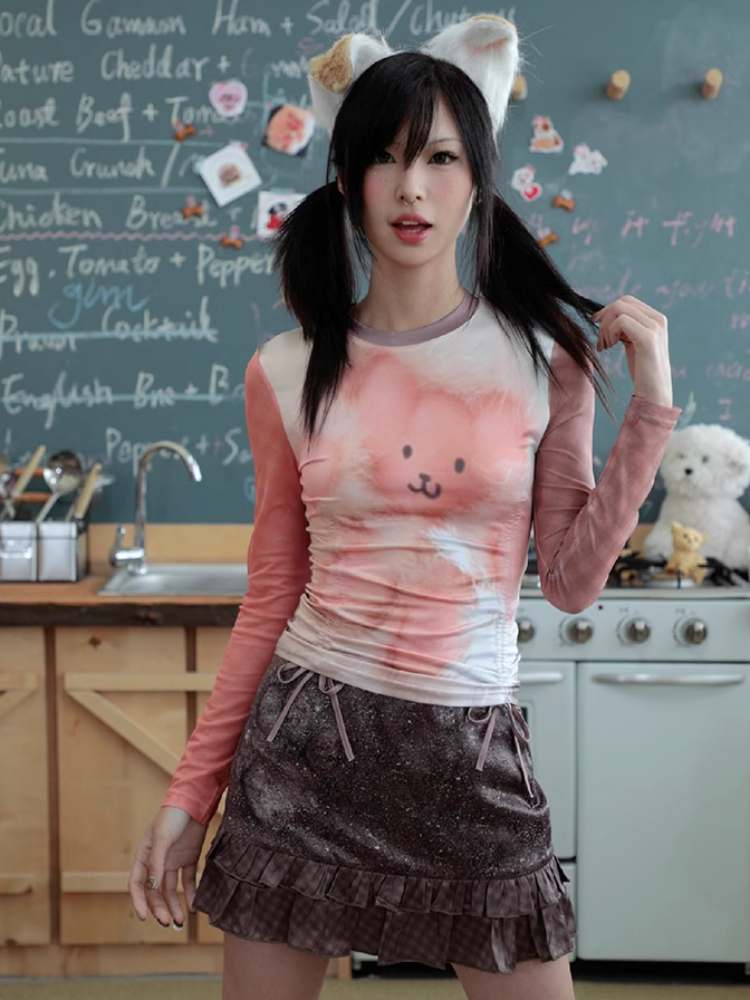 Cute Side Shirring Ribbon Bear Print Long Sleeve Tee【s0000008552】