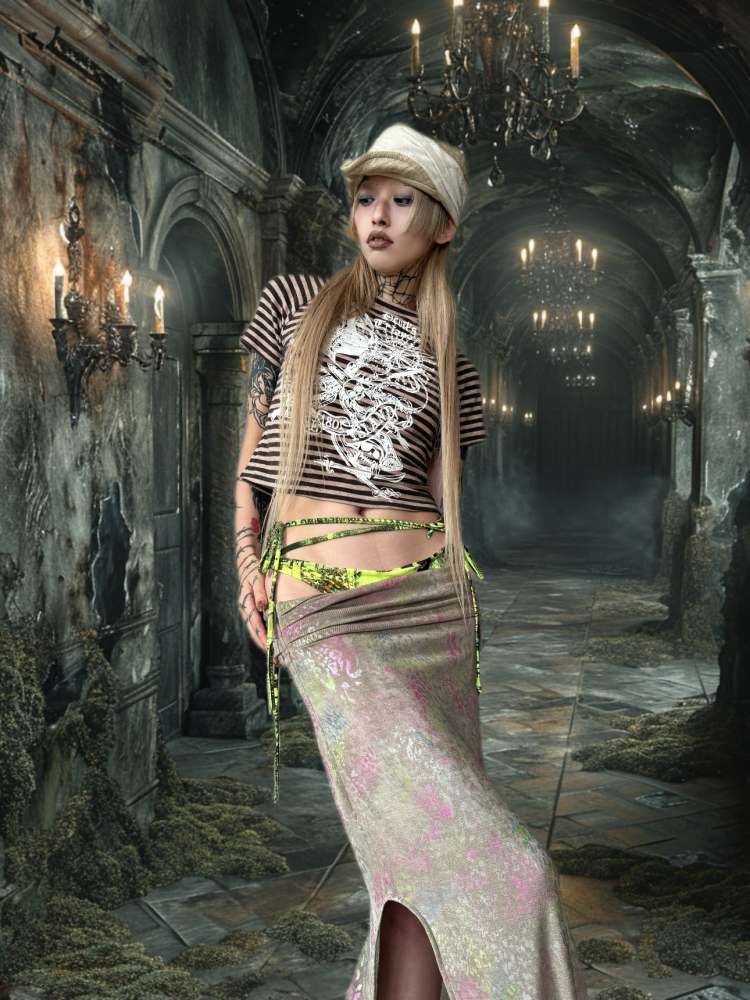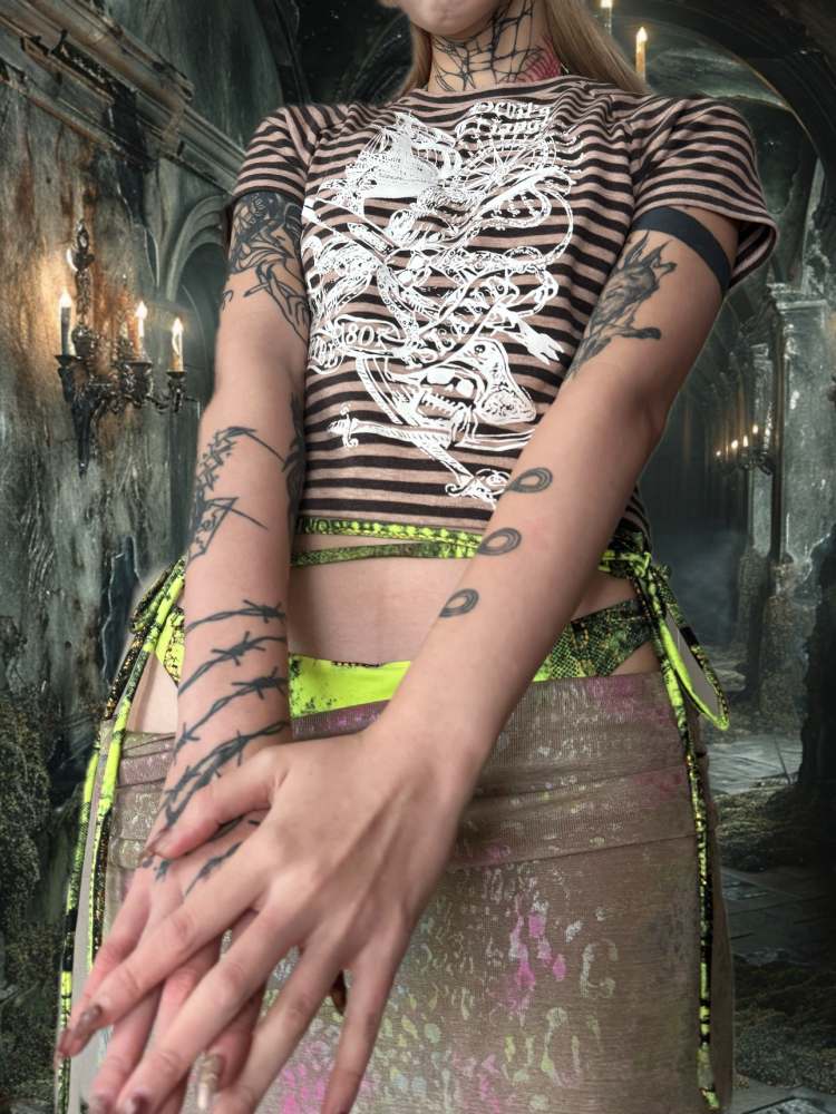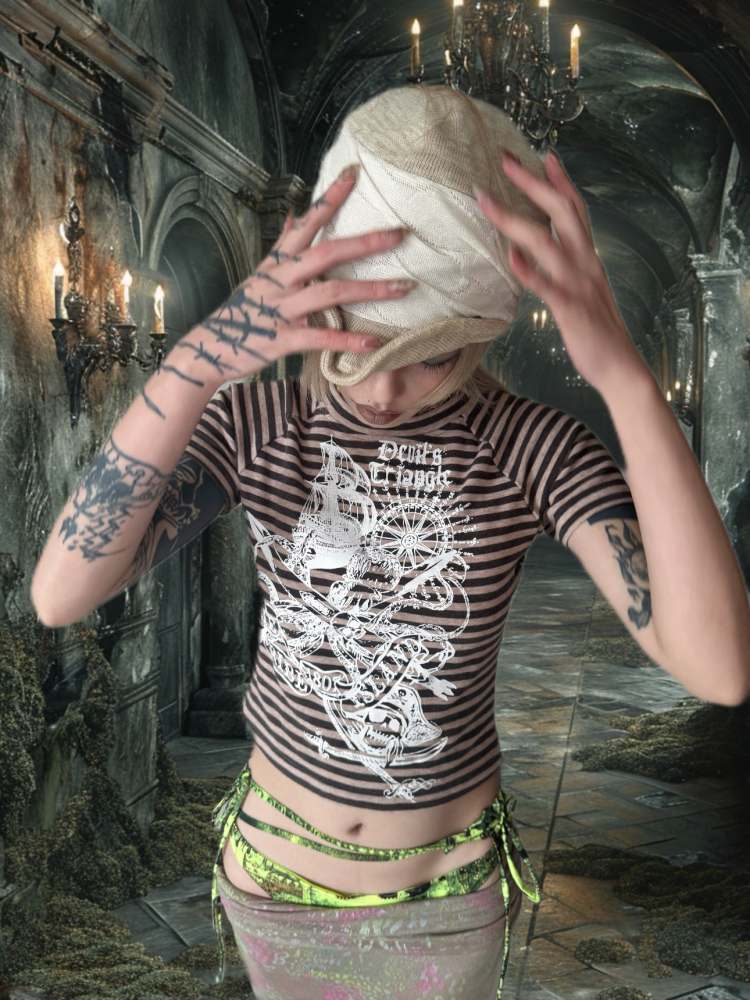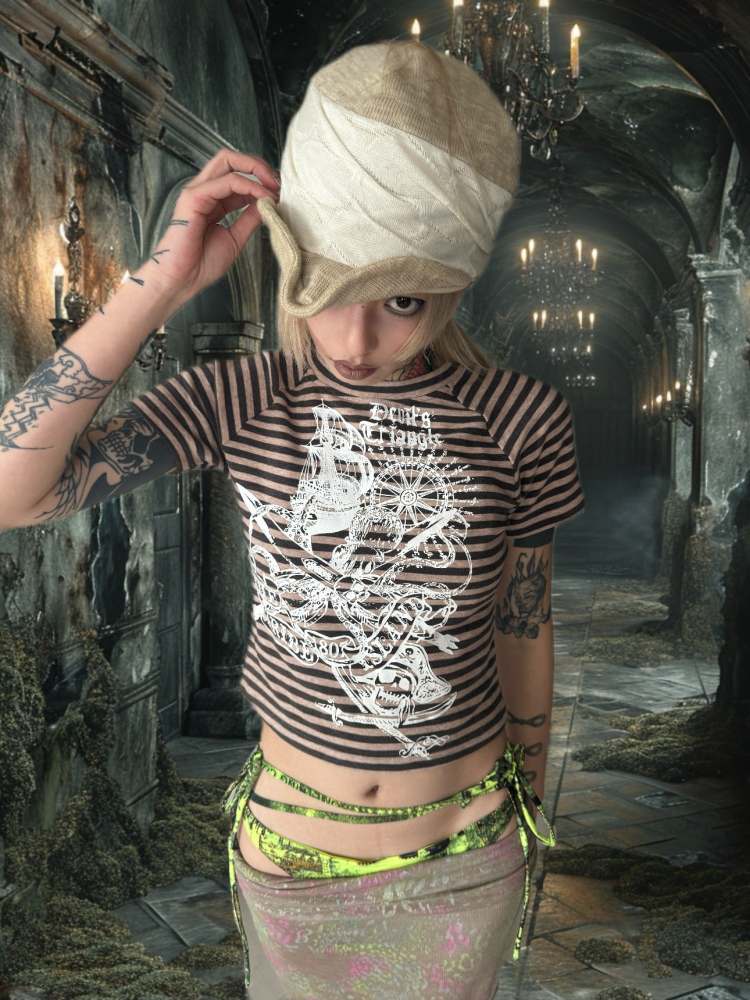 "Confused Captain" Print Striped Short Sleeve T-Shirt【s0000008570】
