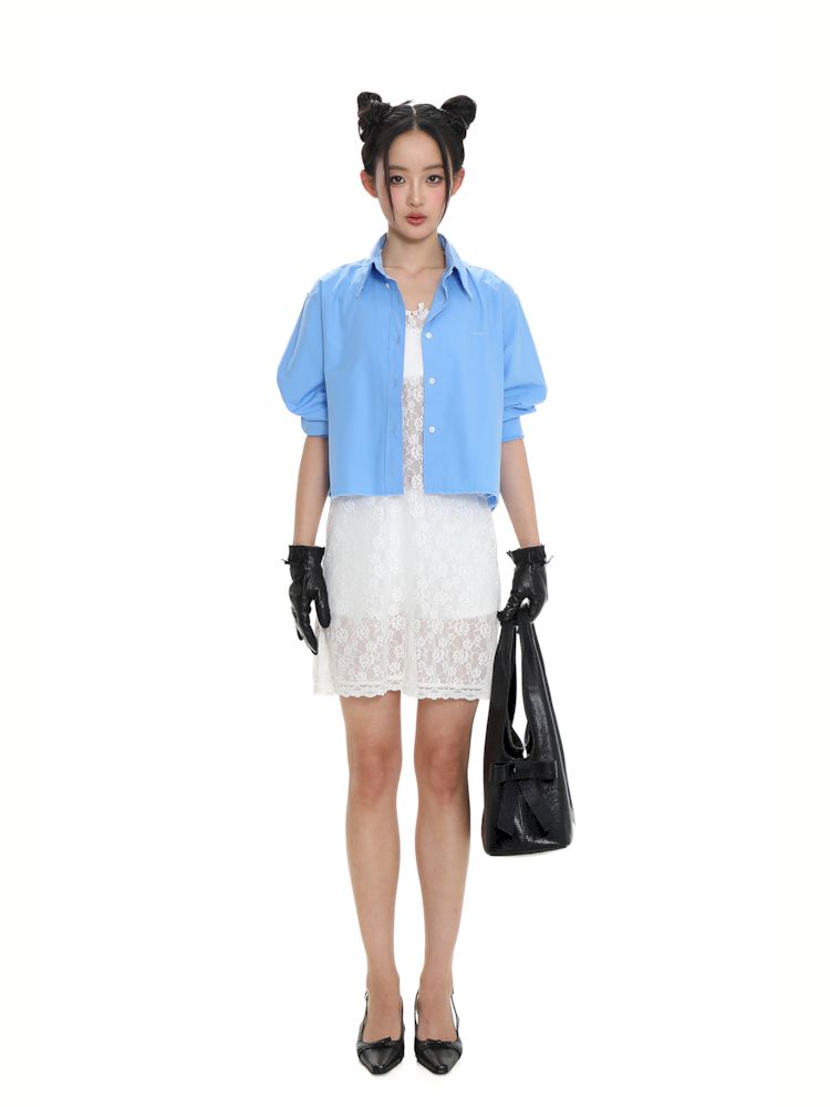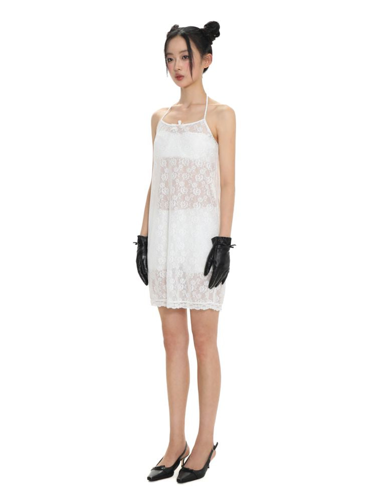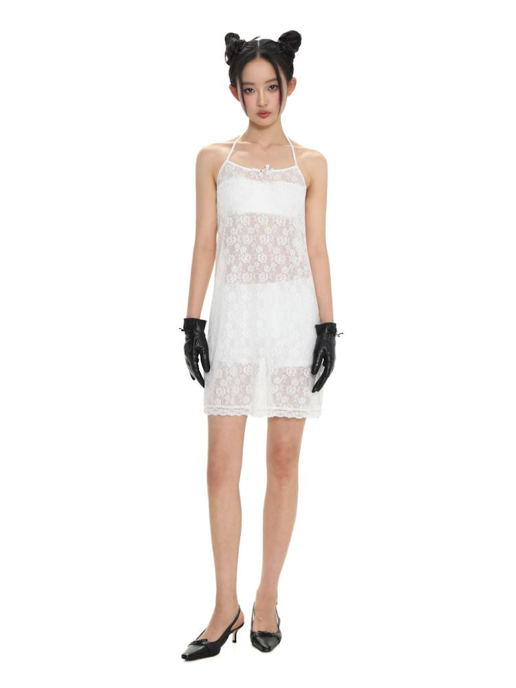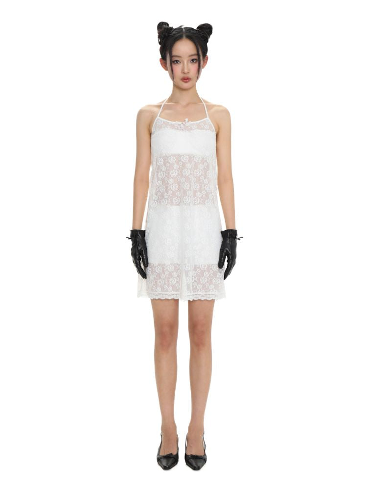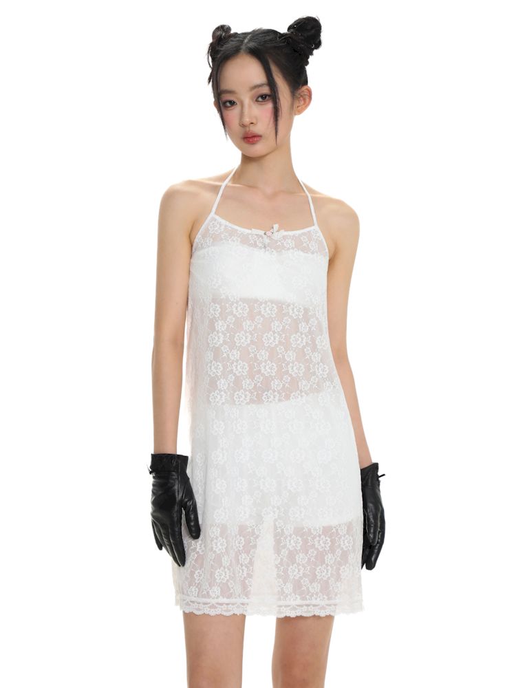 Lace bow thin white neck halter dress【s0000008692】