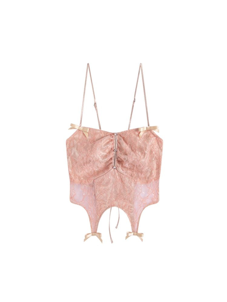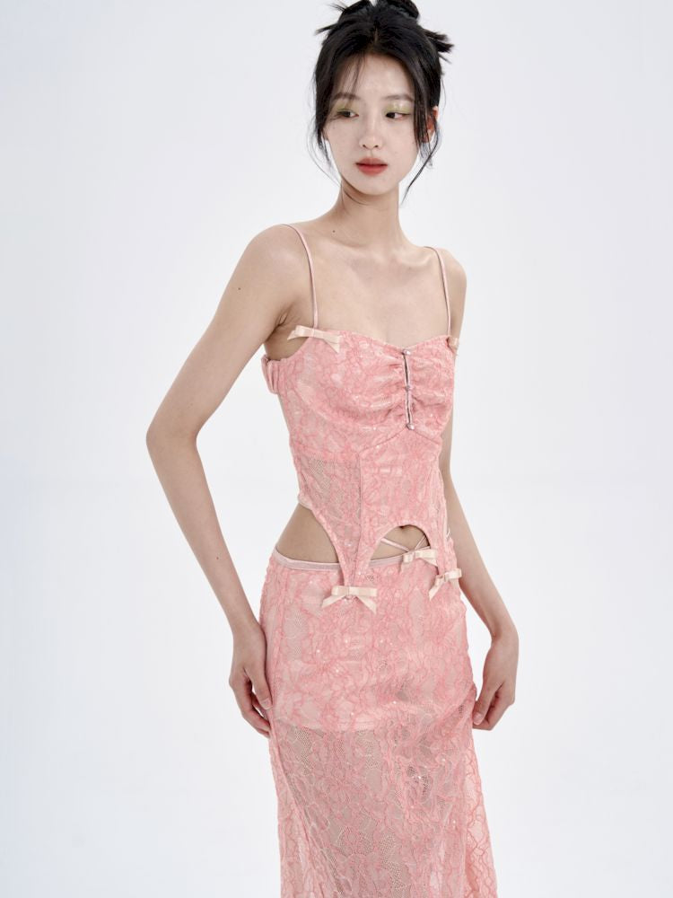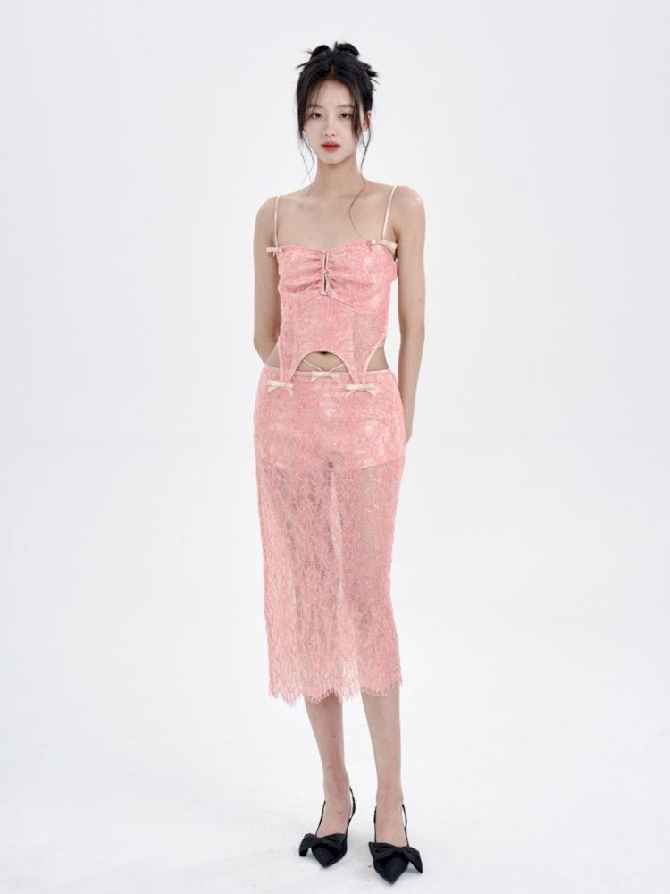 Peach Lace Camisole + Low Waist Lace Half Skirt Set【s0000008775】