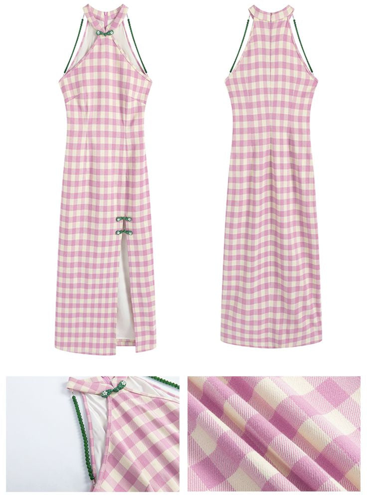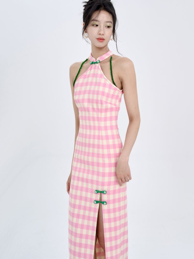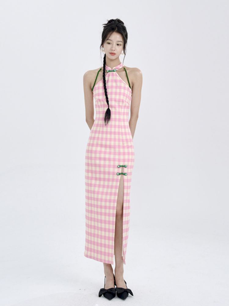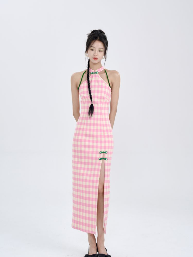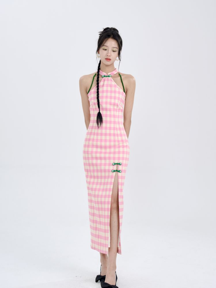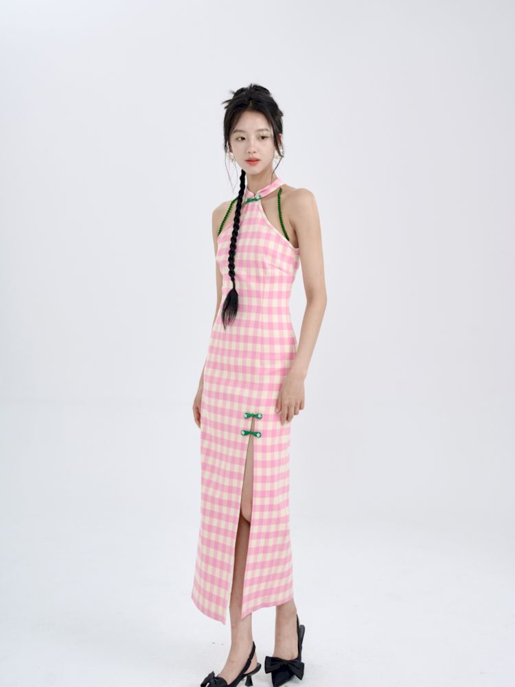 Pink Check Slim Long Cheongsam Dress【s0000008783】