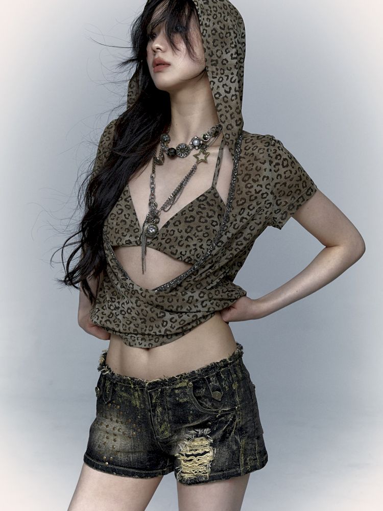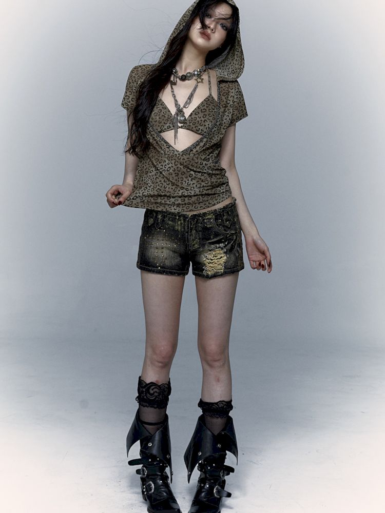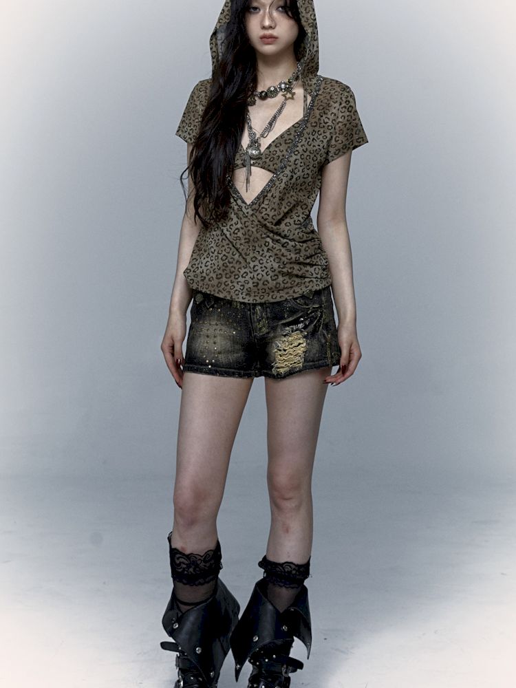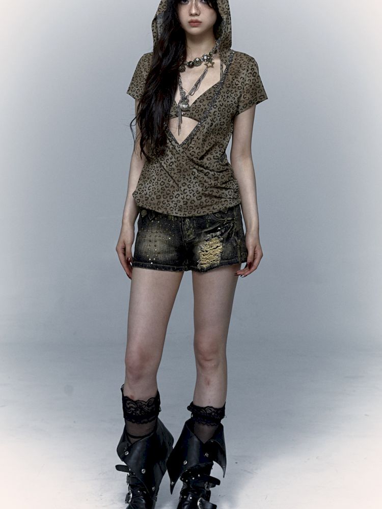 Metallic Leopard Mesh Hooded Hottie Short Sleeve T-Shirt【s0000008998】