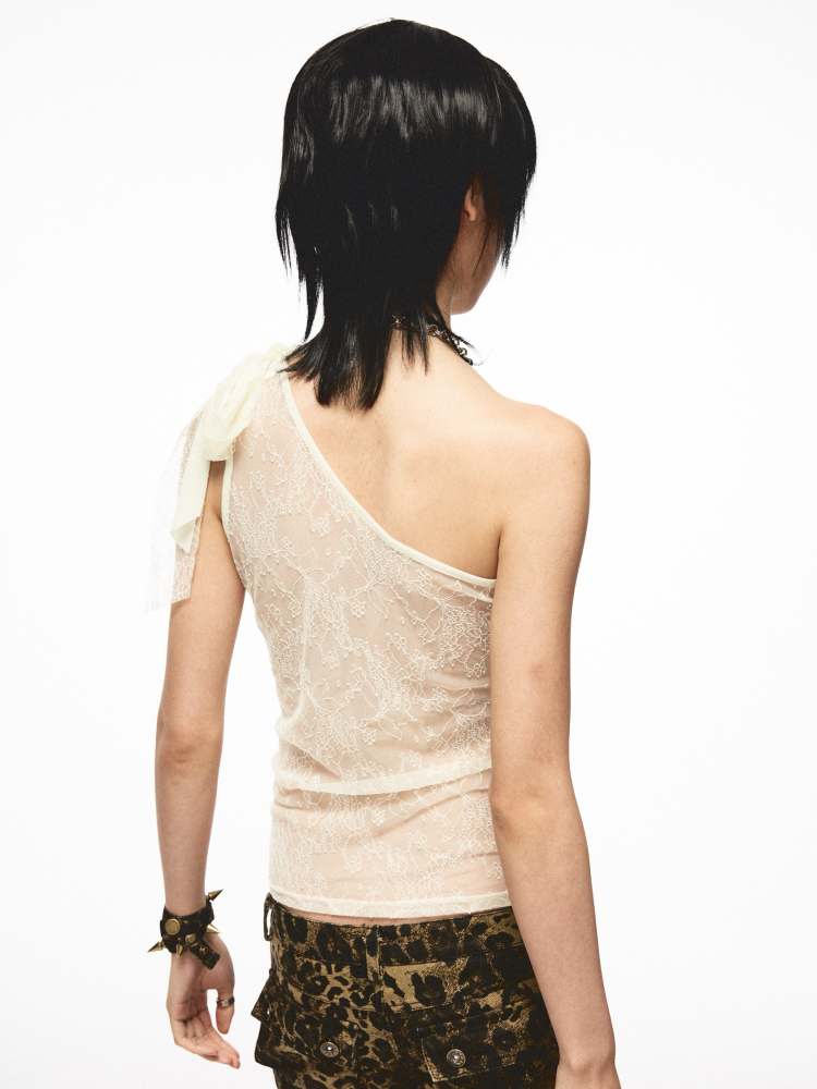 Back Flower Stitched Lace One-Shoulder Print Tops【s0000009011】