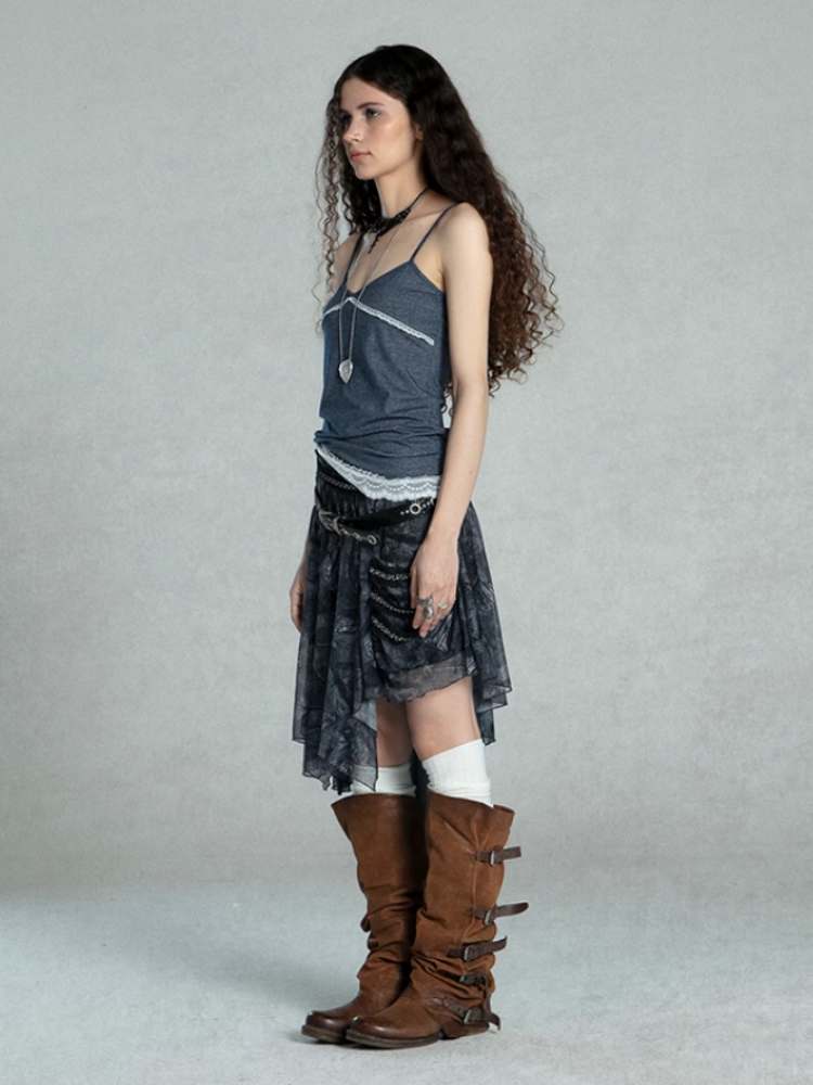 Irregular Hem Pleats Mesh Print Skirt【s0000009015】