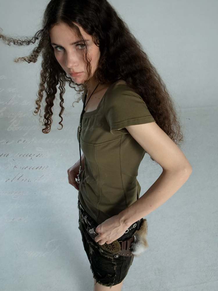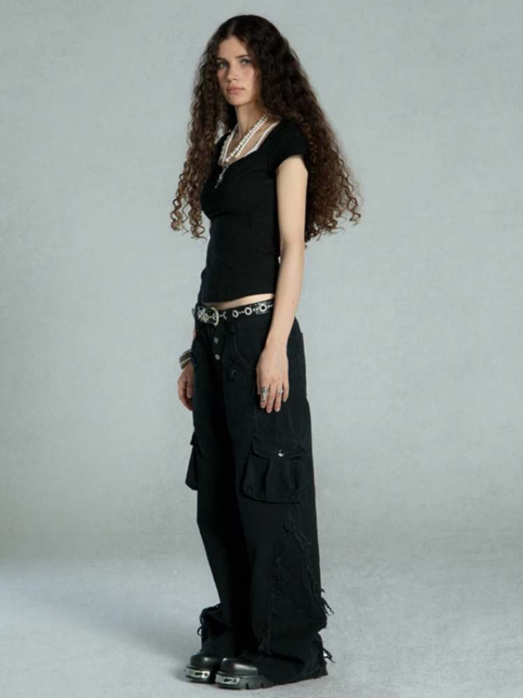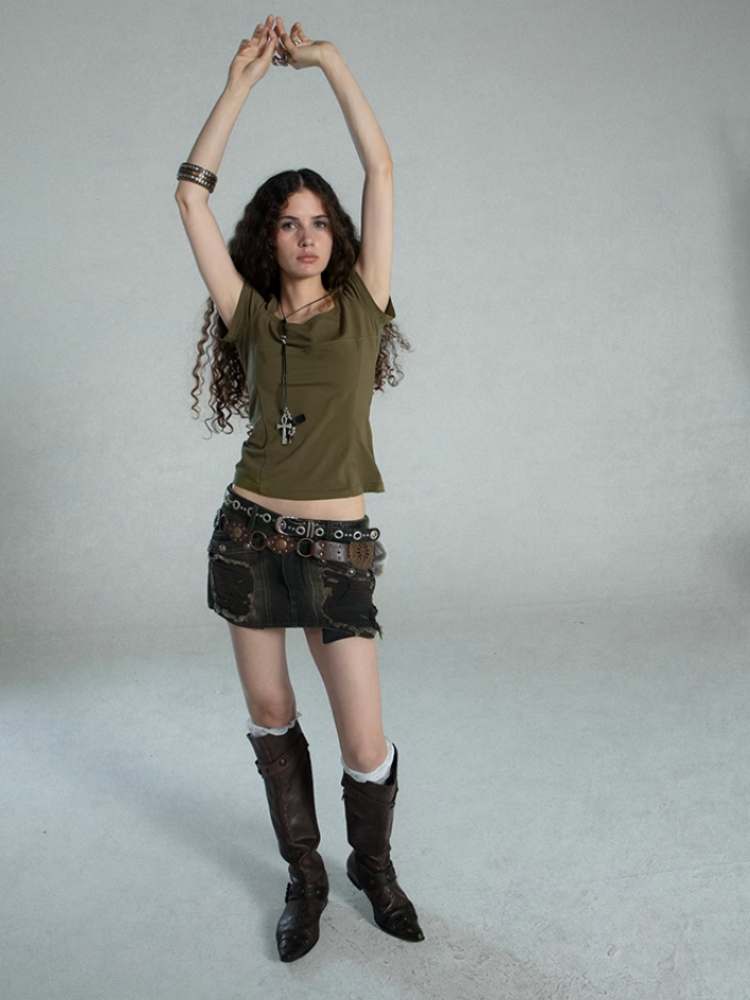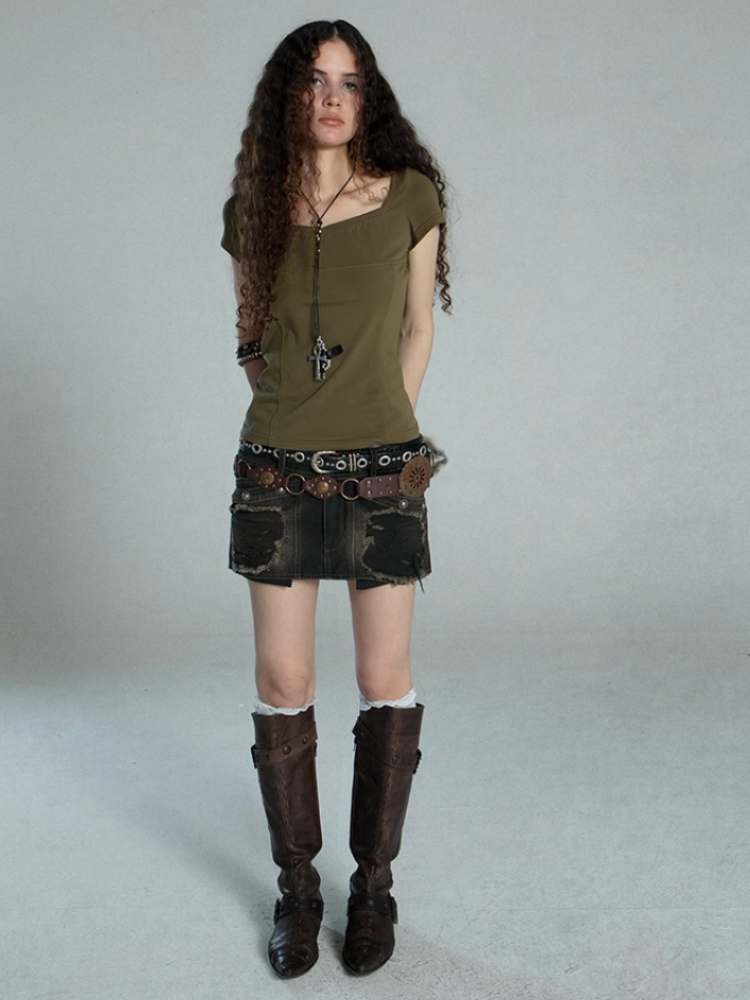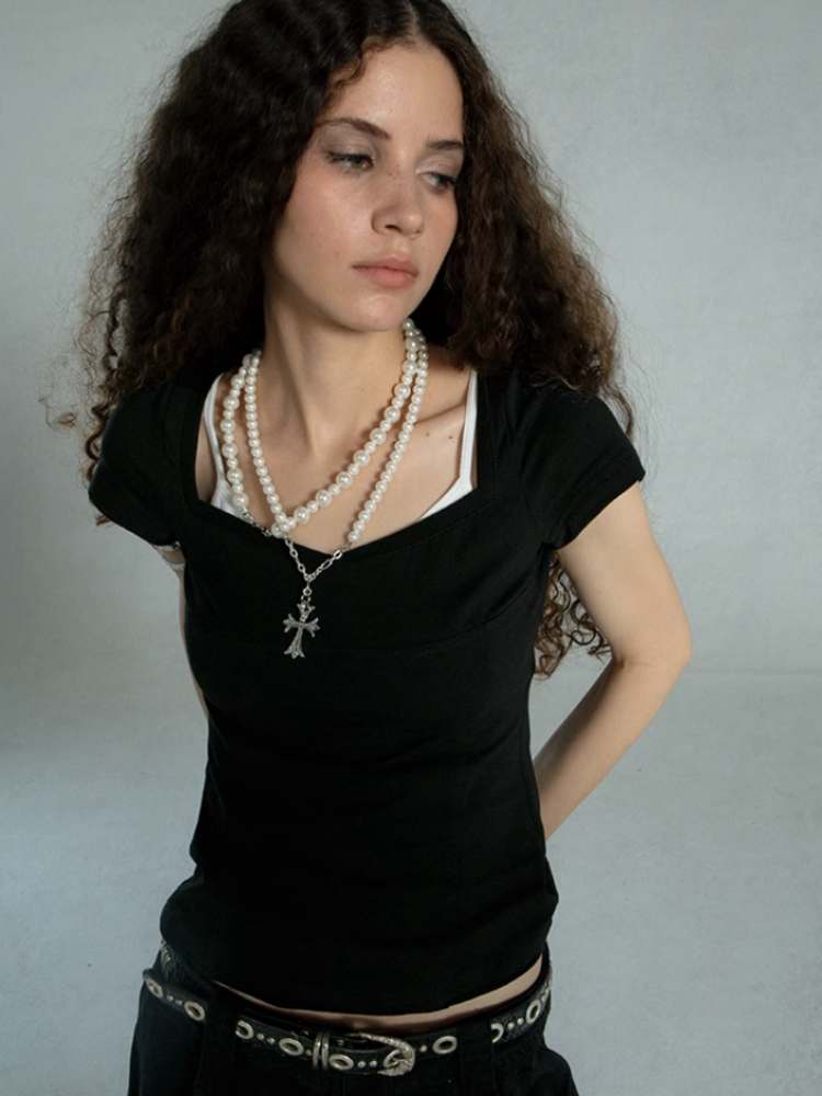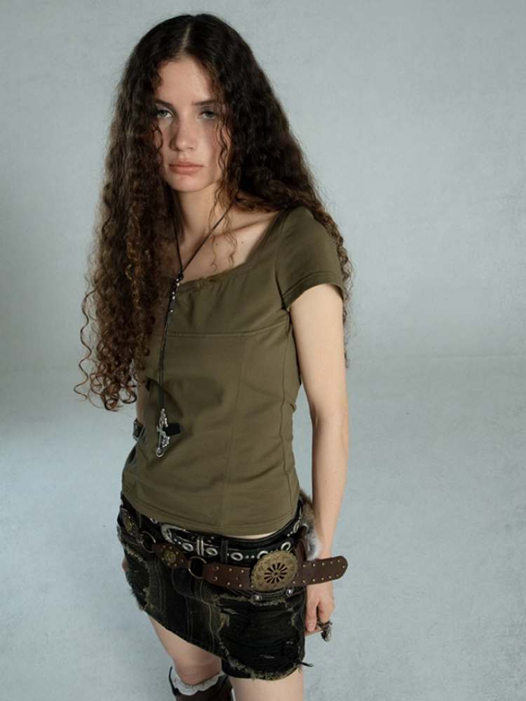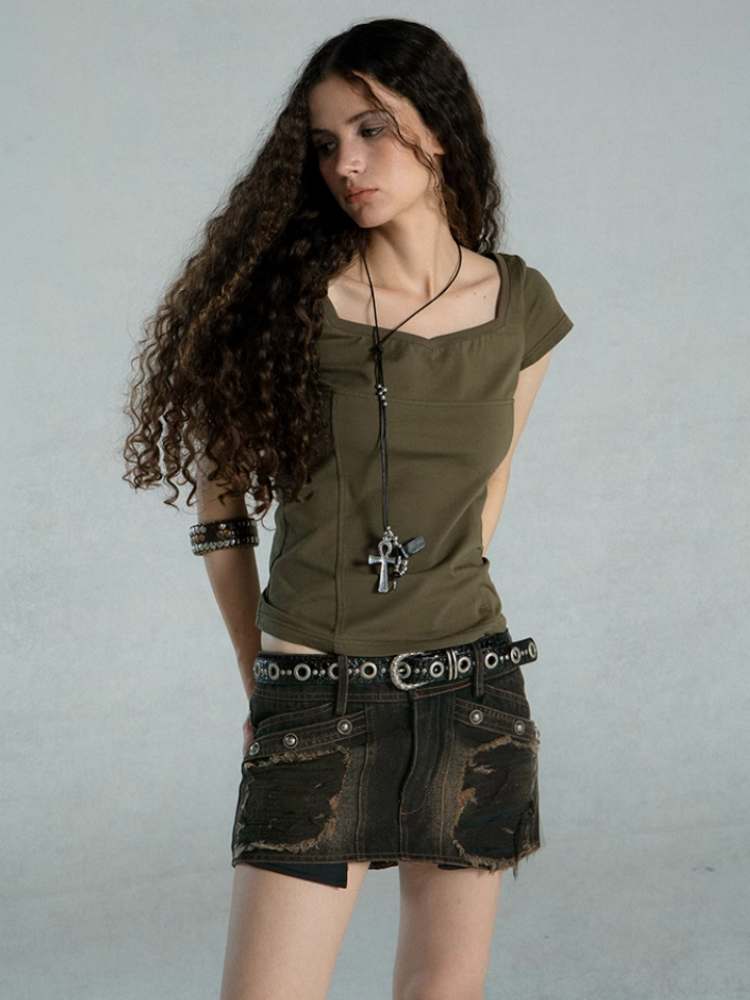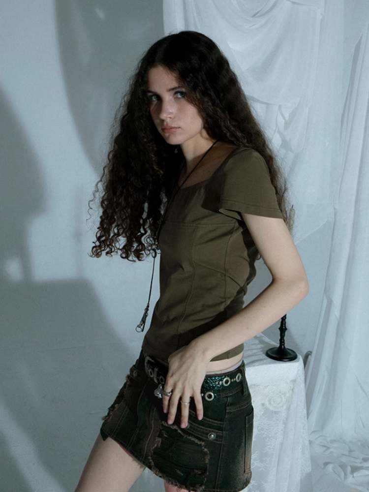 Split Line Square Collar Pinch Waist T-Shirt【s0000009020】