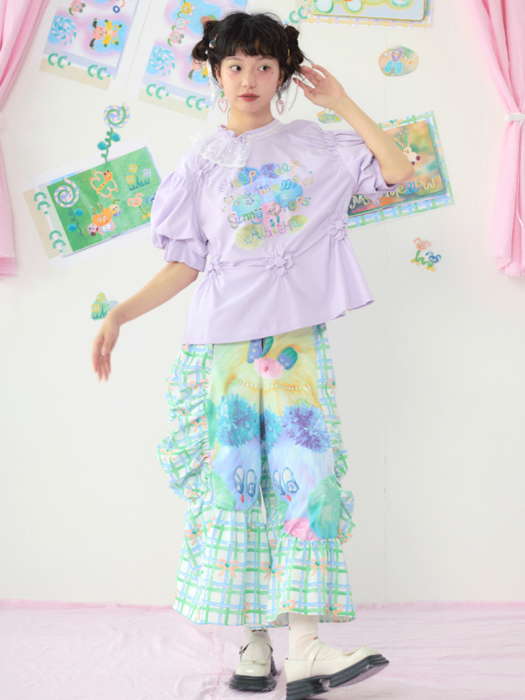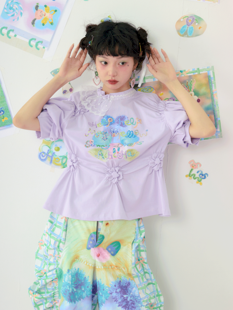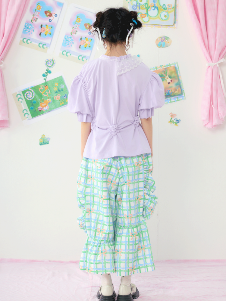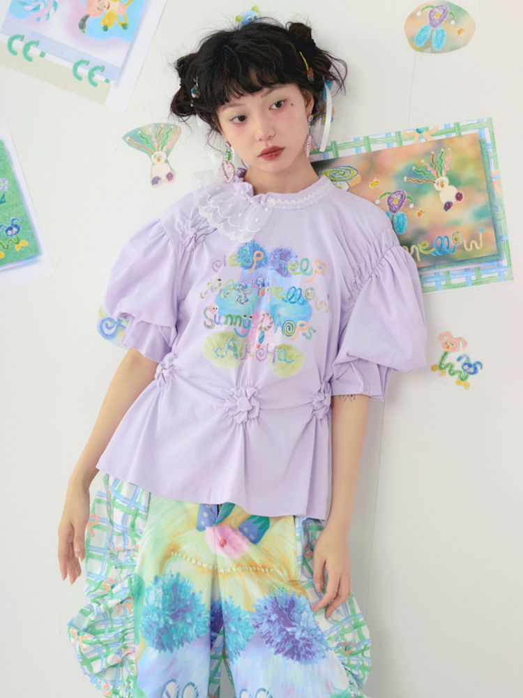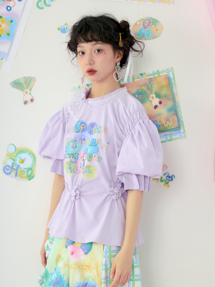 Lace Bubble Sleeve Cute Purple Tee【s0000009078】