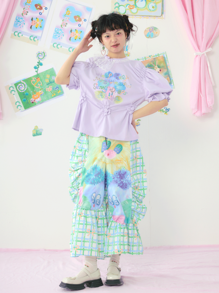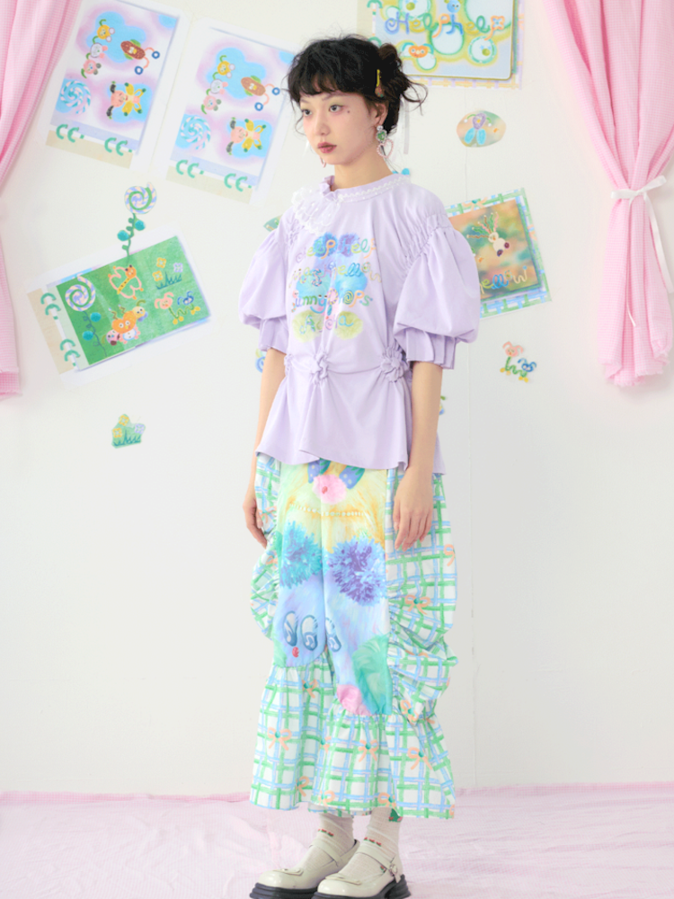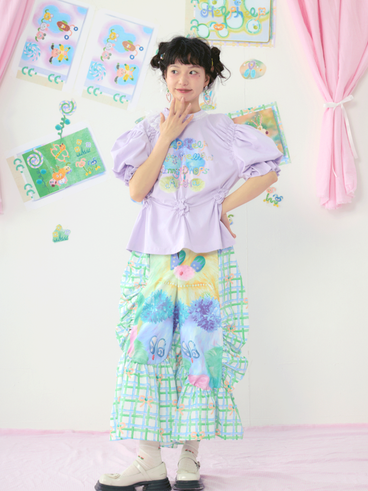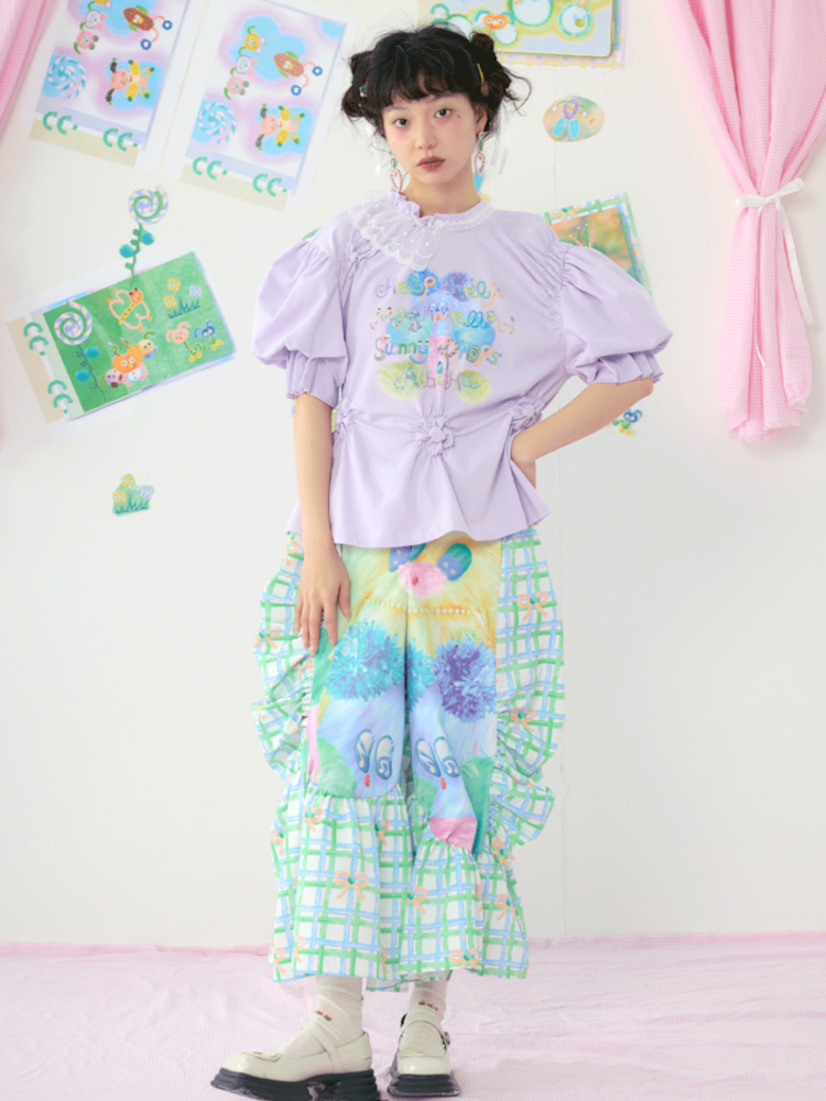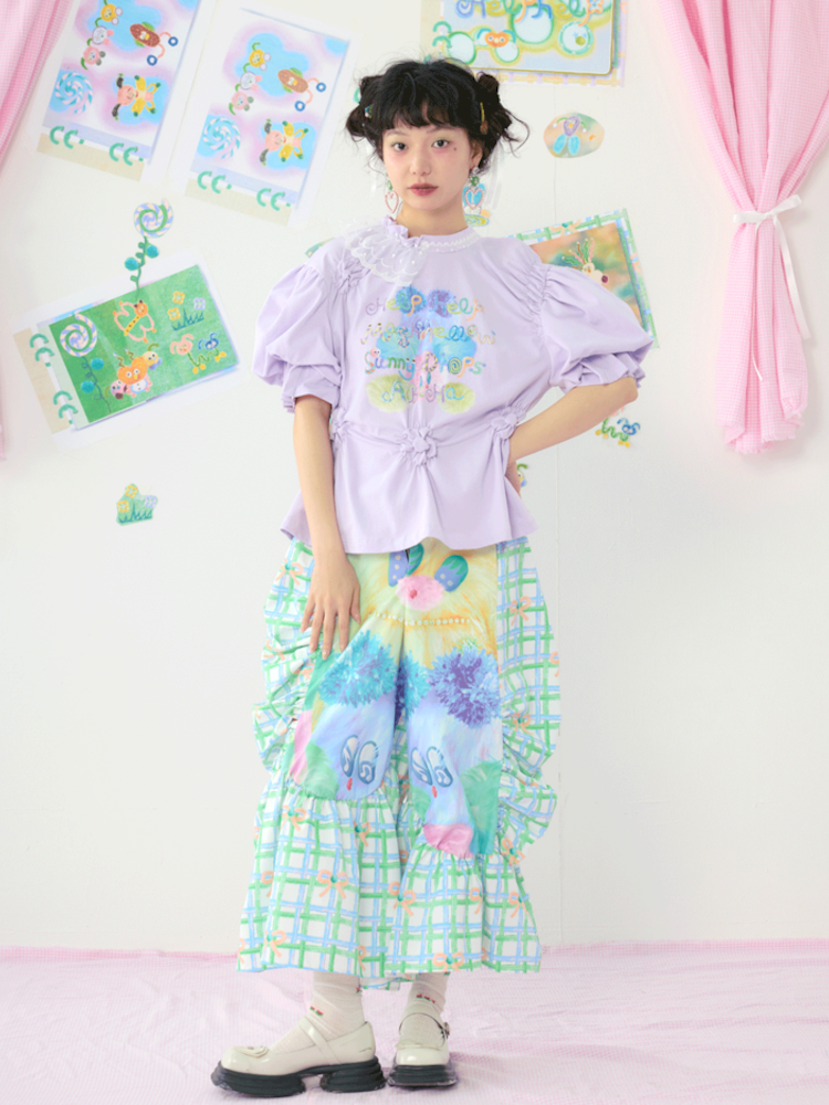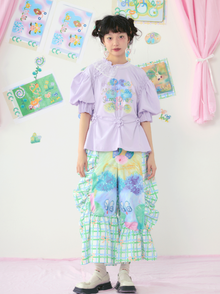 Lace Bubble Sleeve Cute Purple Tee【s0000009078】