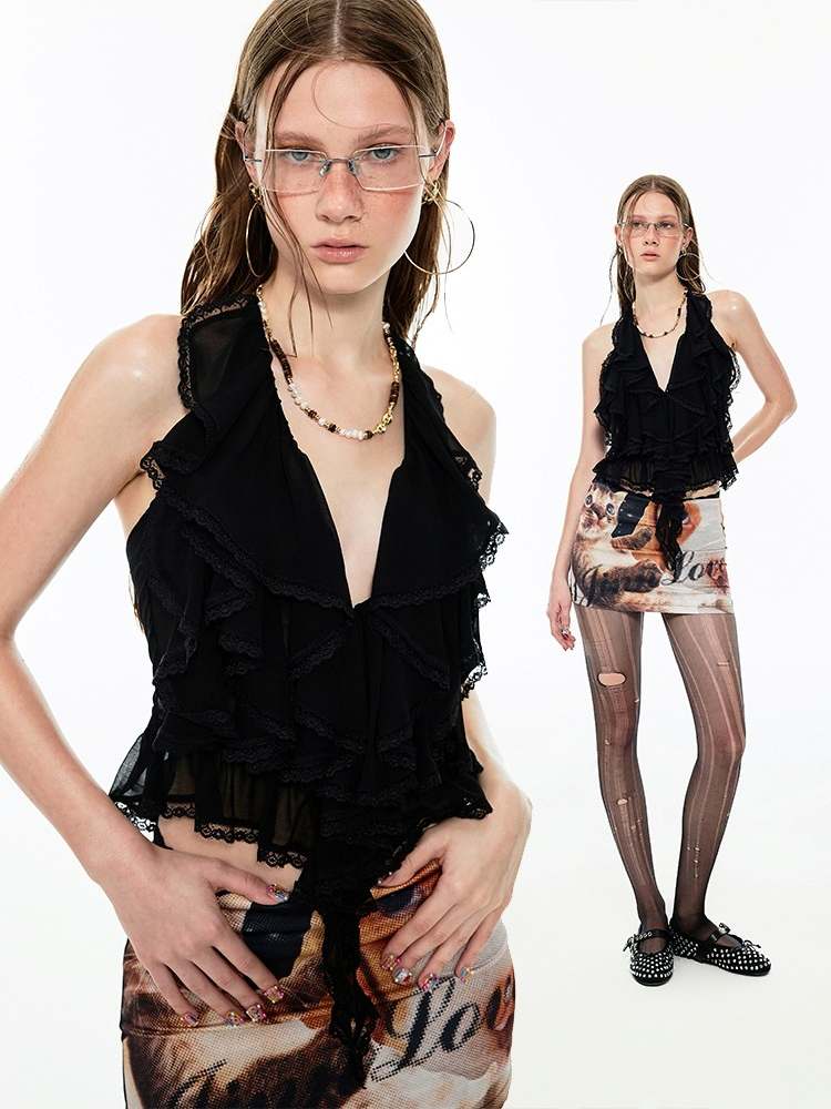 Halter Neck Ruffle Lace Backless Tops【s0000009159】
