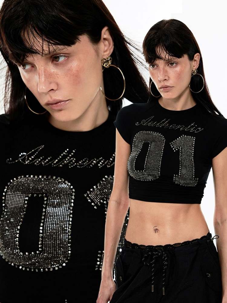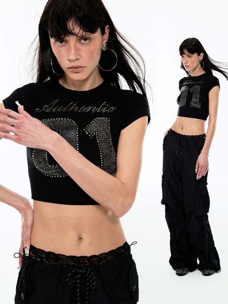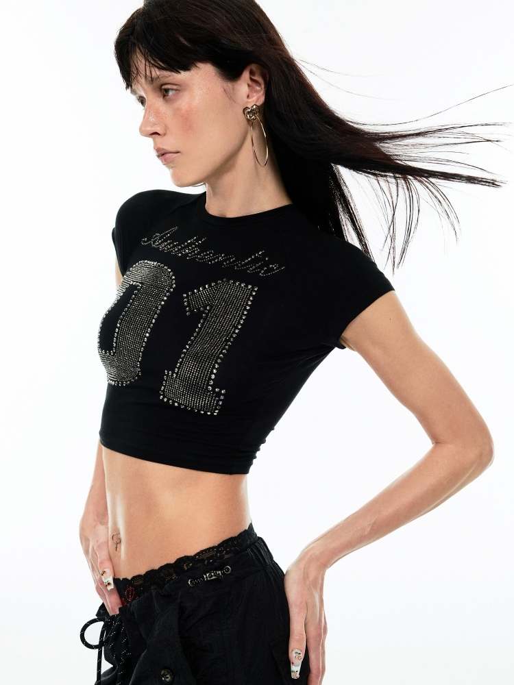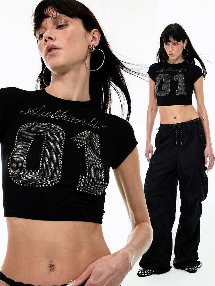 Rhinestone Numbers Cropped Tee【s0000009162】