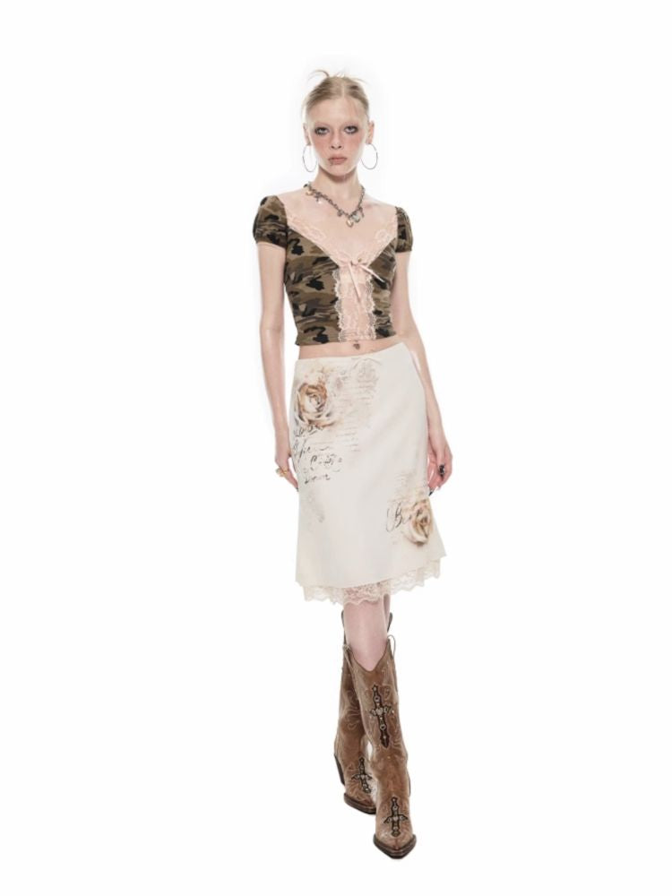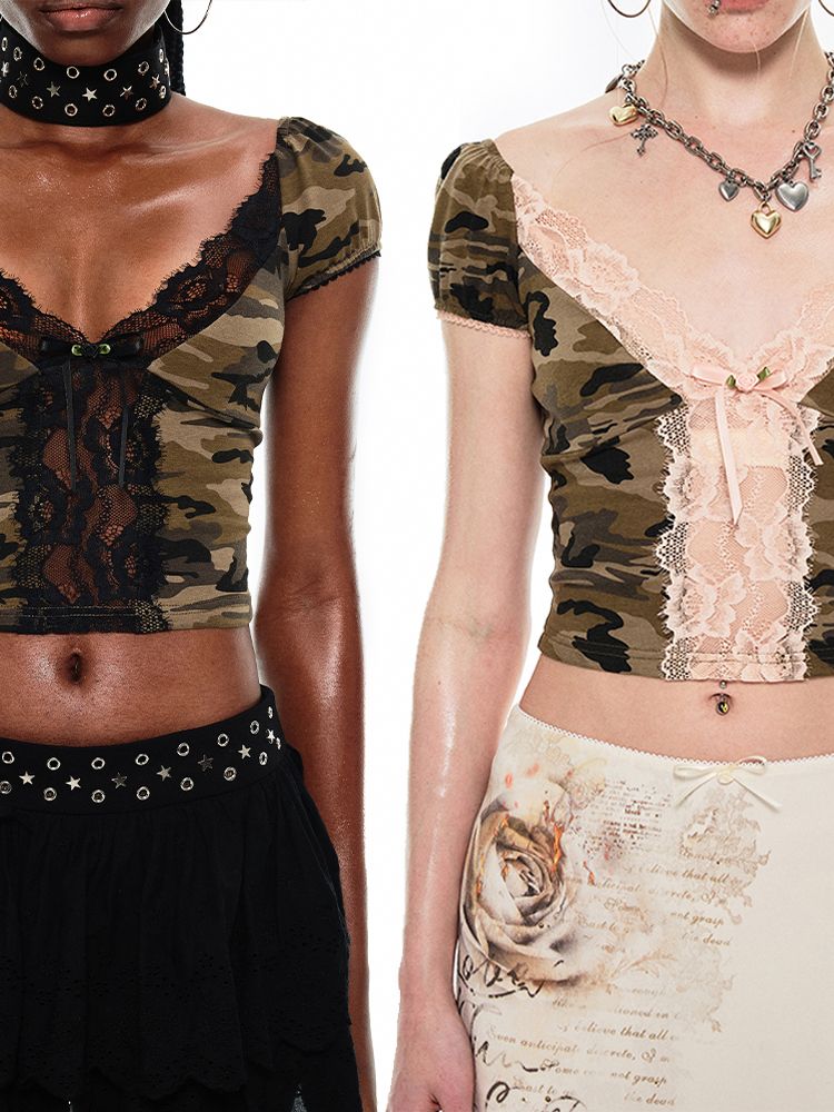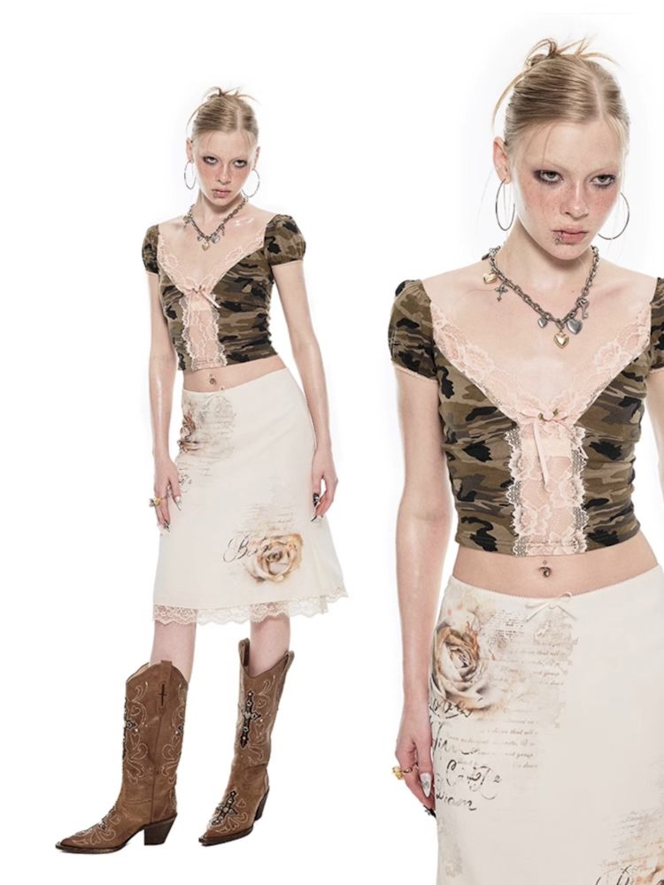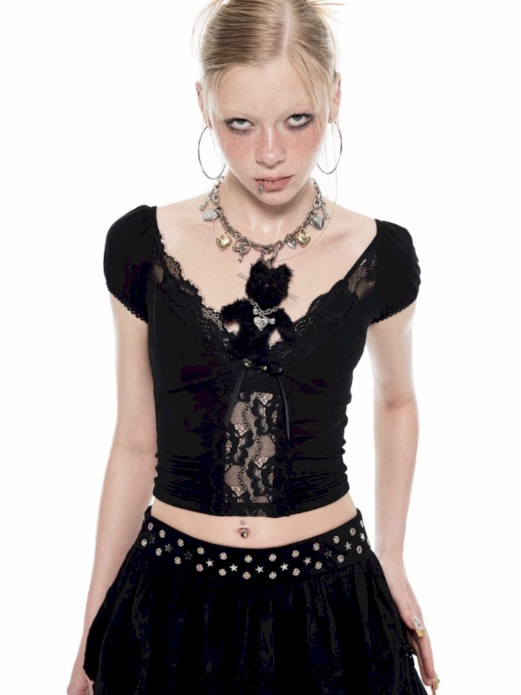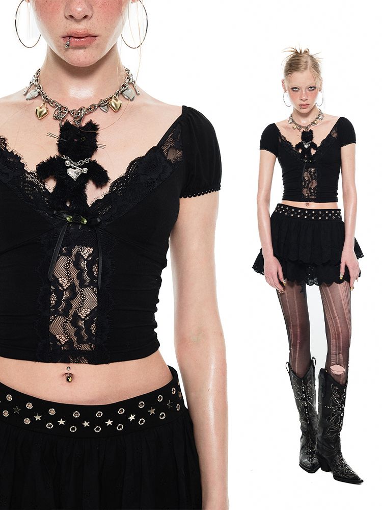 Heart Micro See Through Lace V-Neck Short Sleeve Tee【s0000009423】