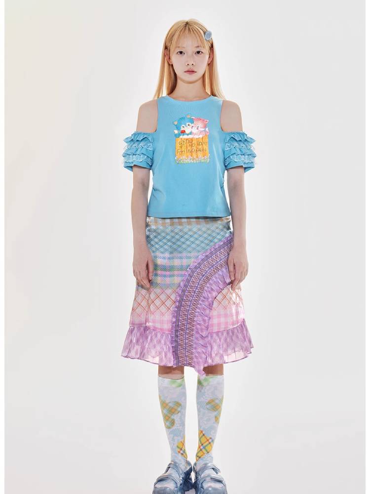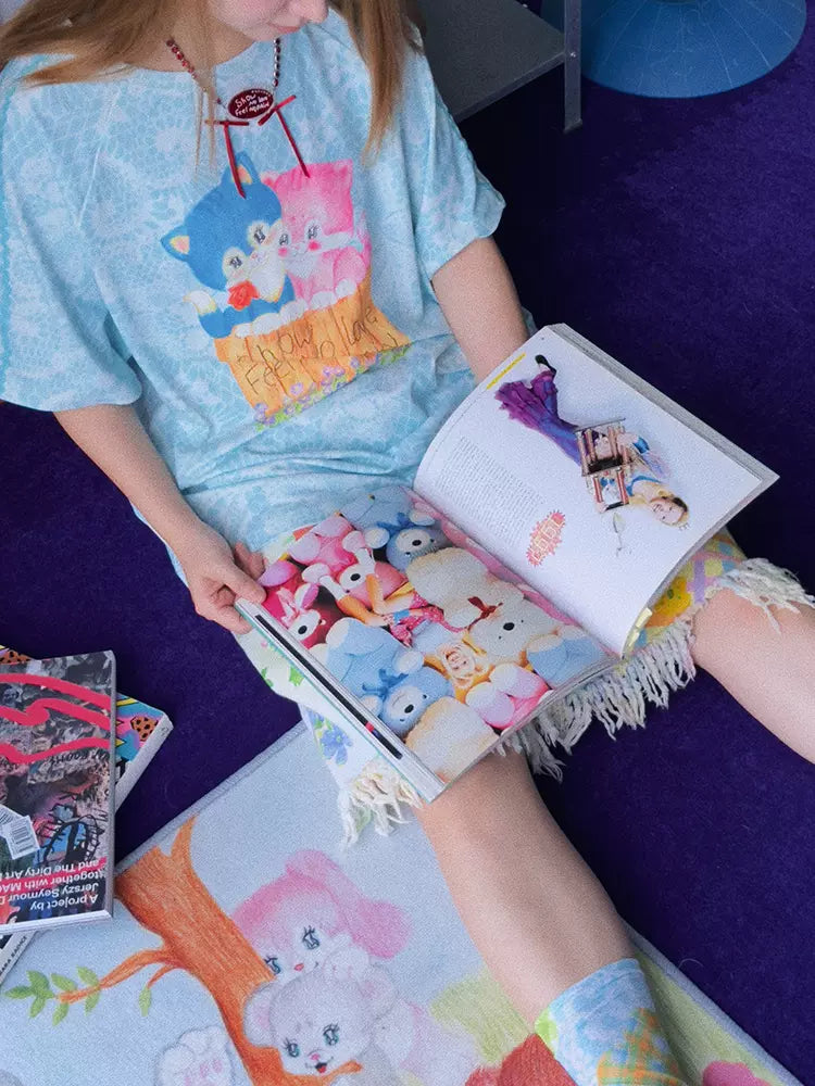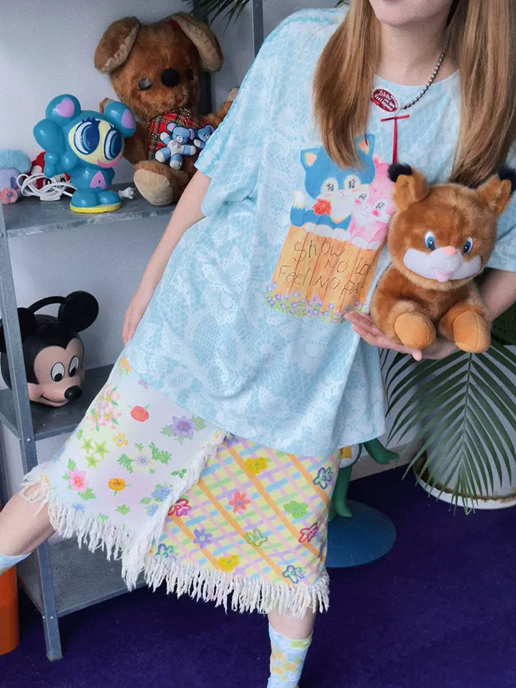 Kitten print off-shoulder tops and oversized loose T-shirt【s0000009524】