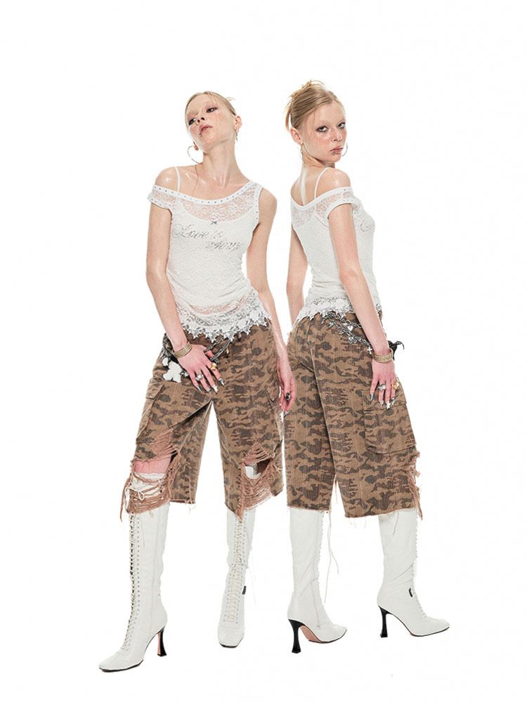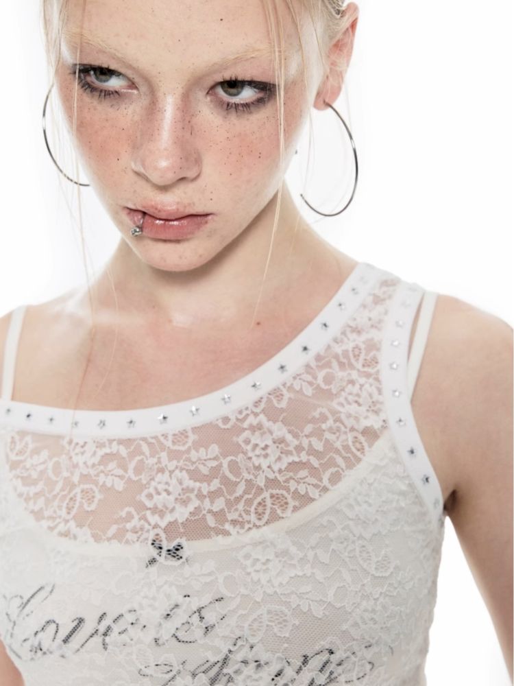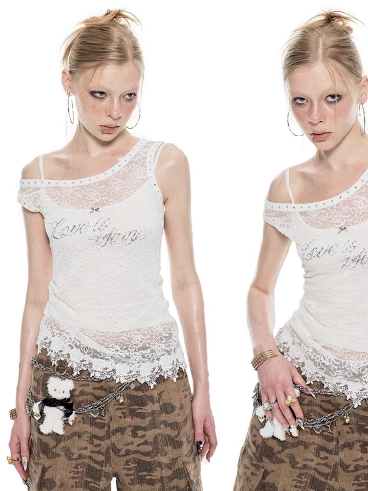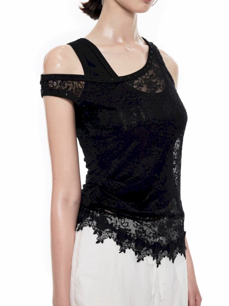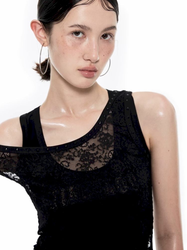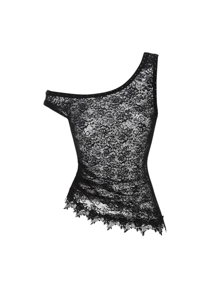 Slant Shoulder Asymmetric Lace See Through Overlay Vest【s0000009708】