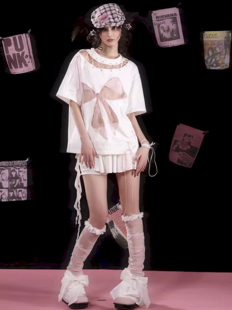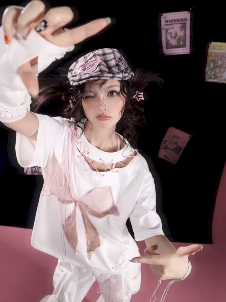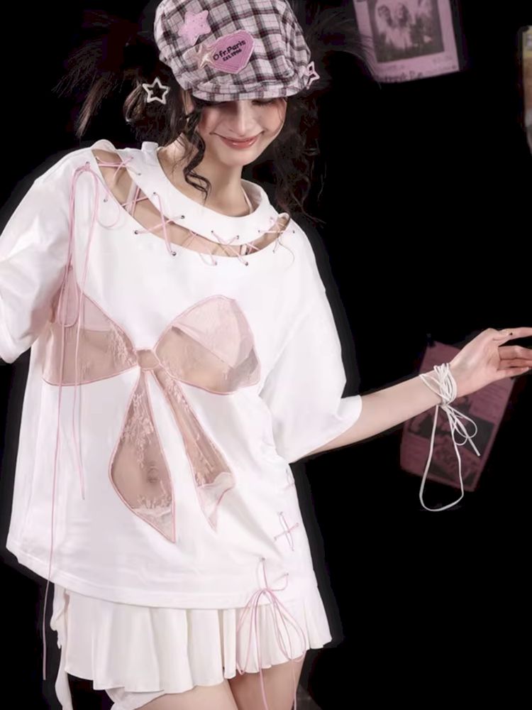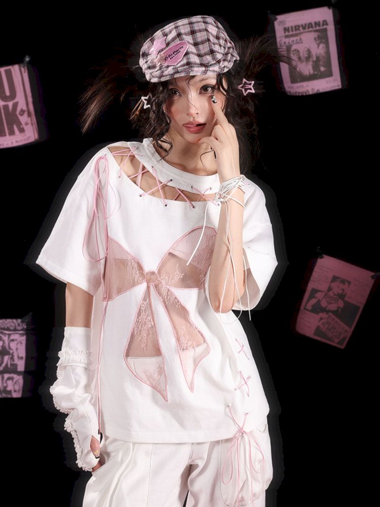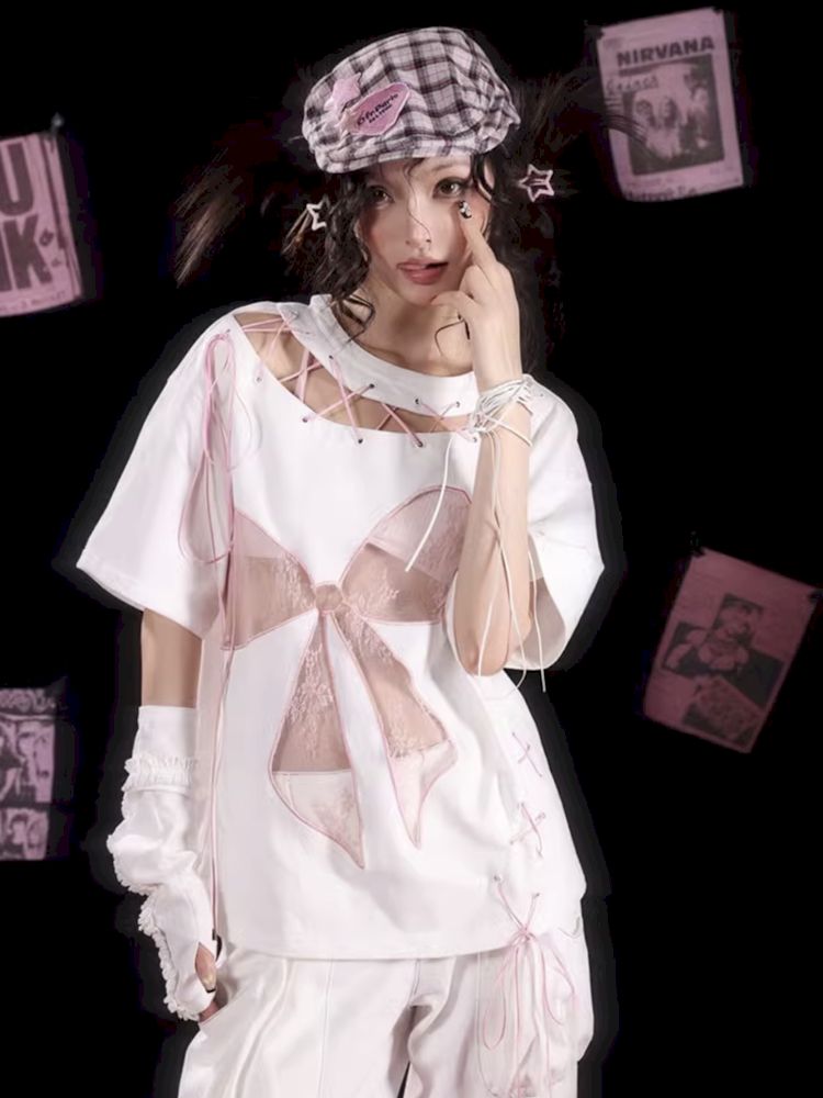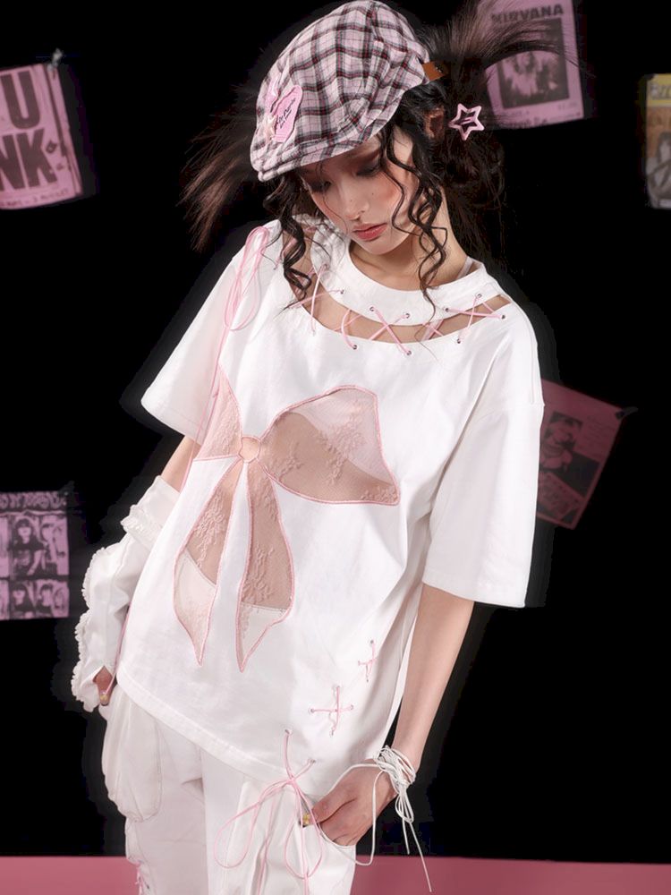 Hollow Out Tie Design White T-Shirt【s0000009740】