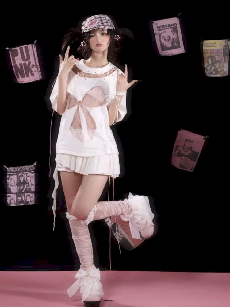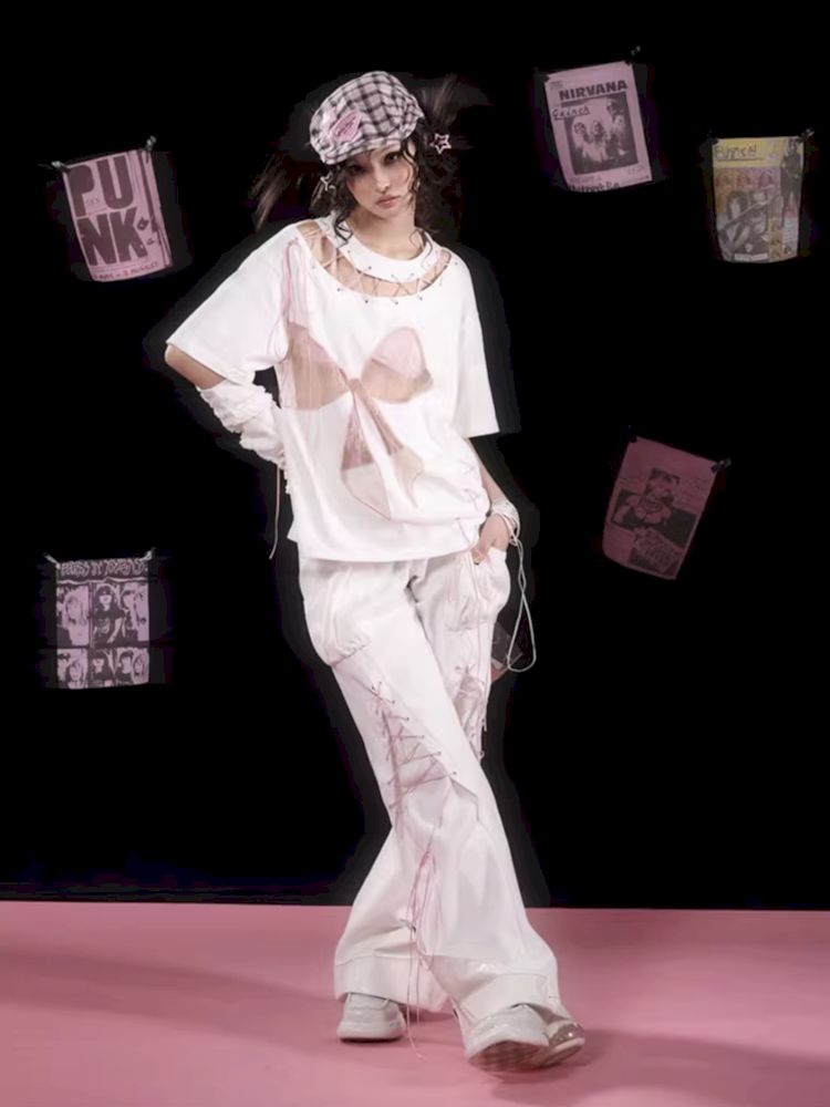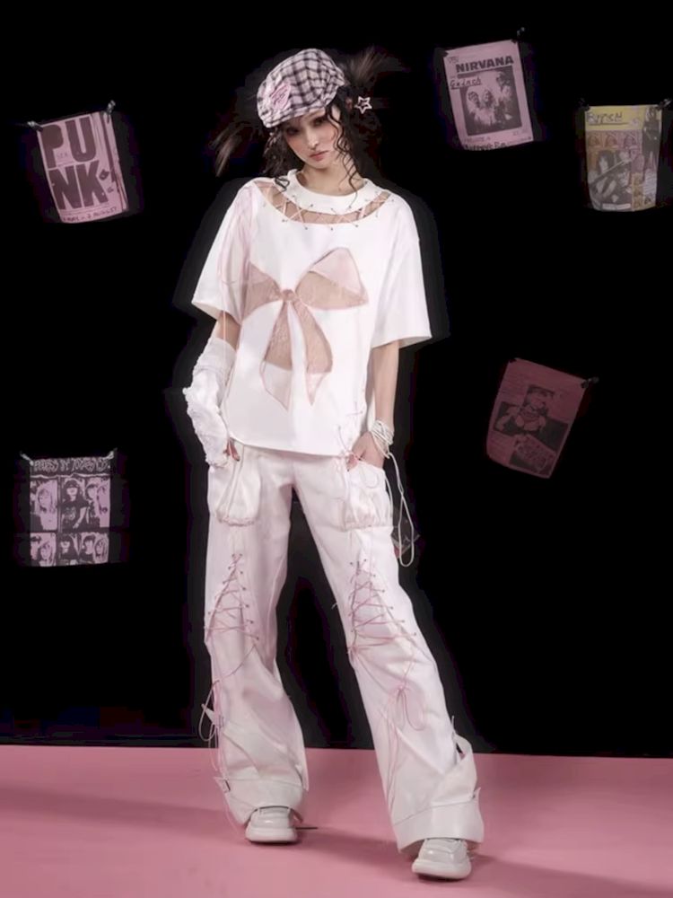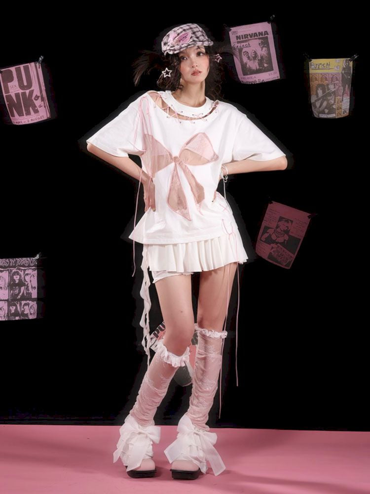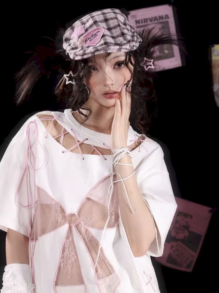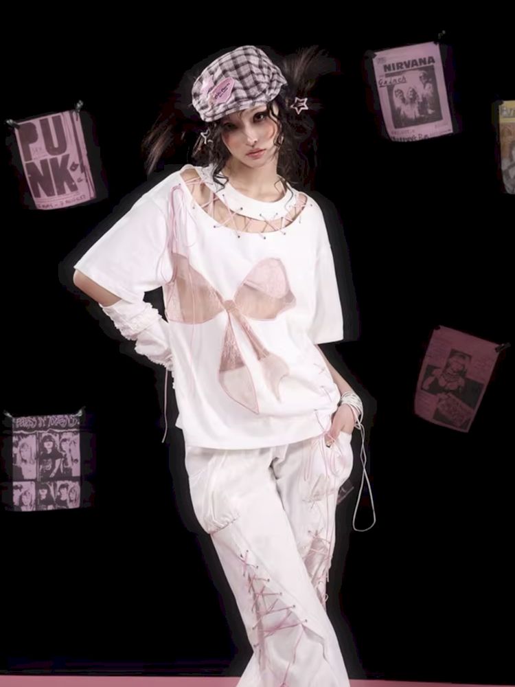 Hollow Out Tie Design White T-Shirt【s0000009740】