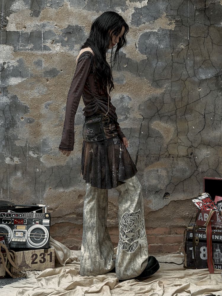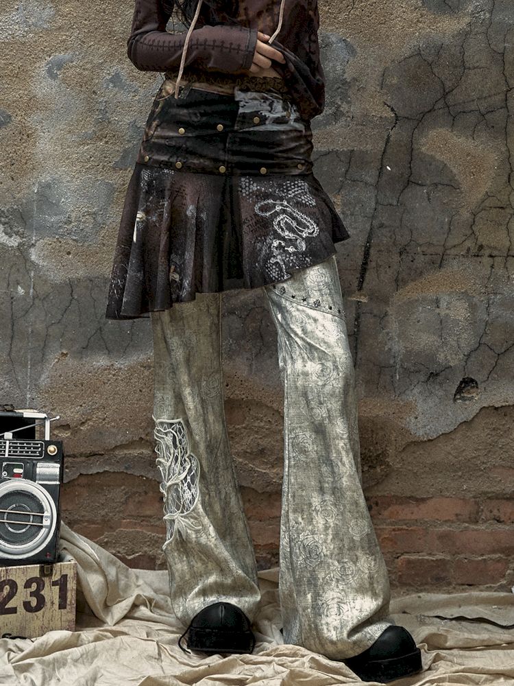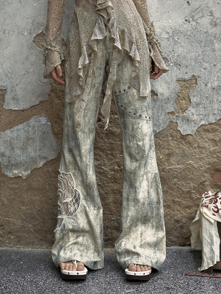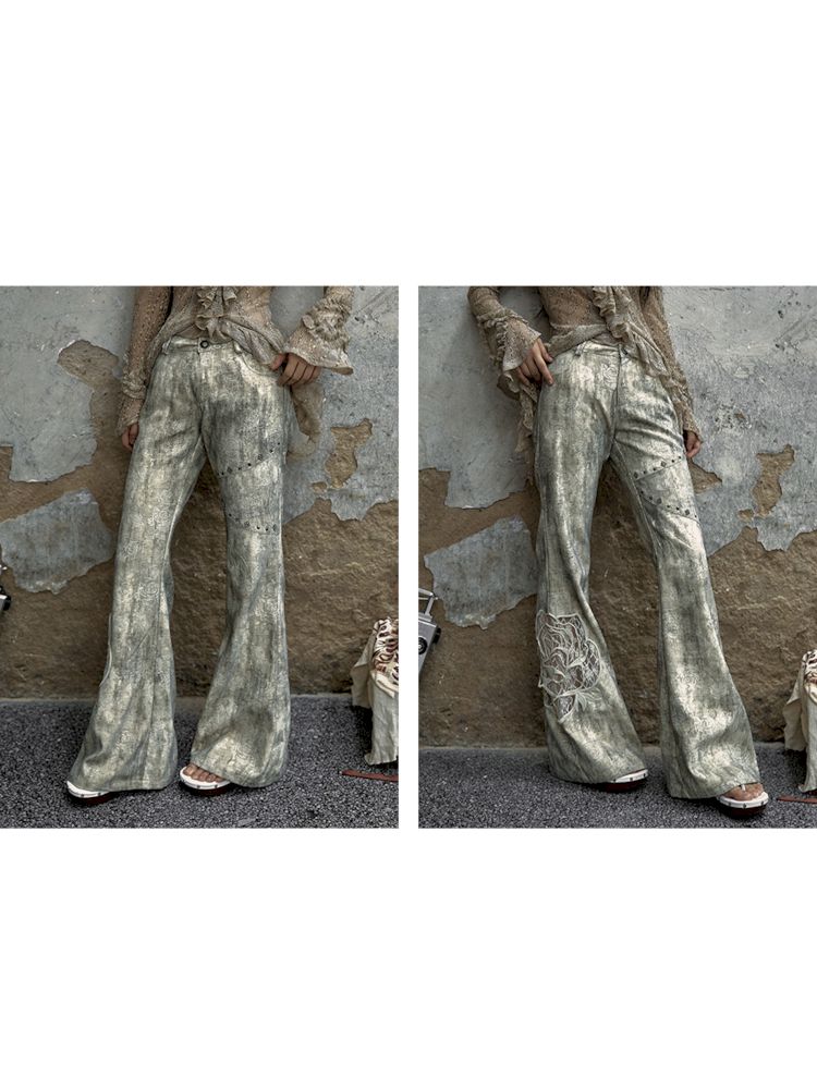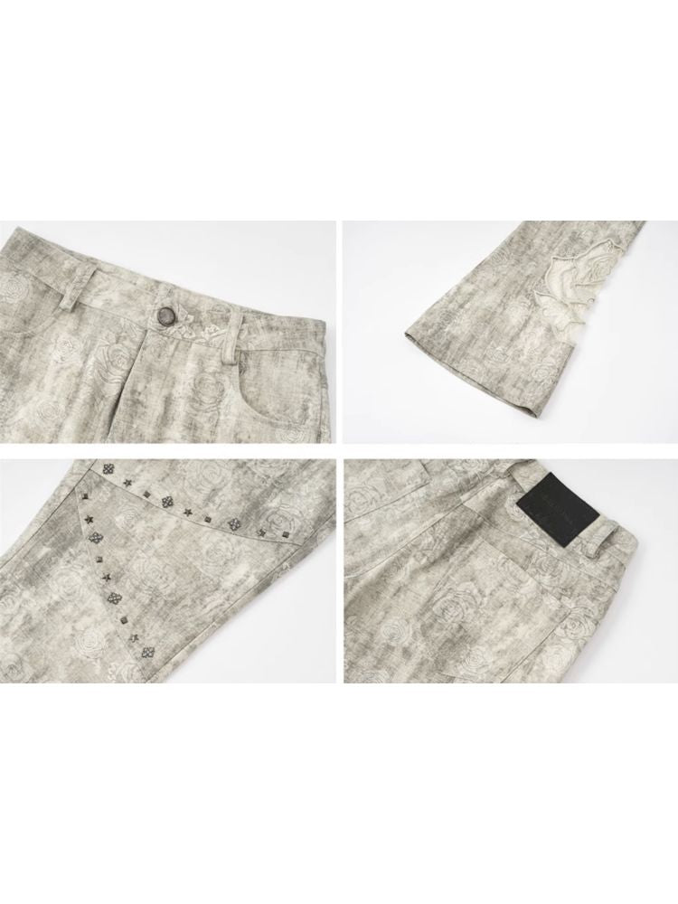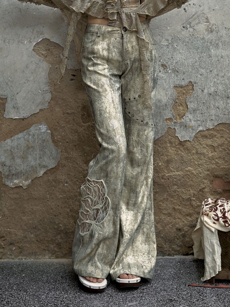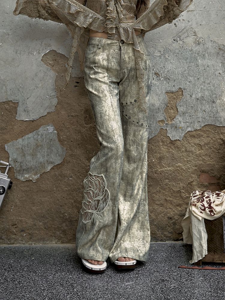 Embroidered Rose Straight Micro Flared Pants【s0000009743】