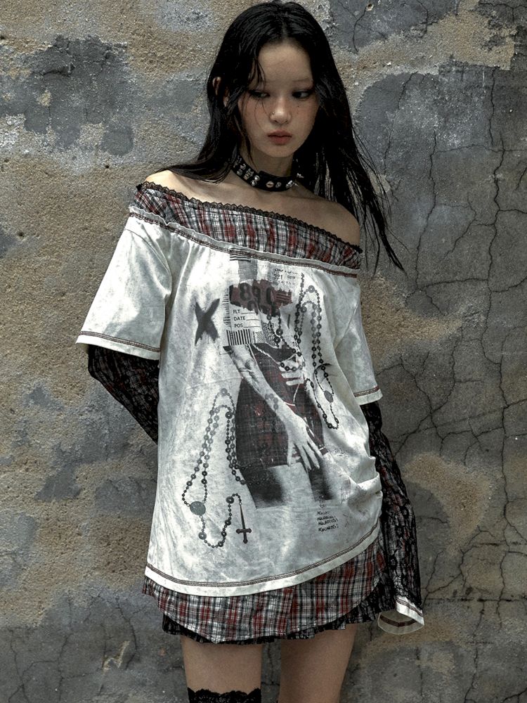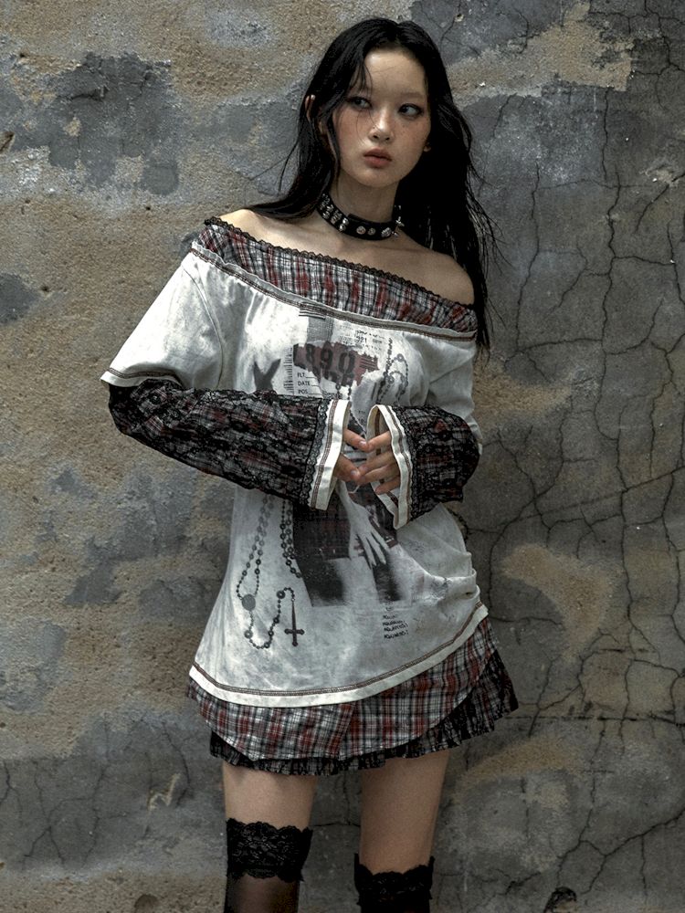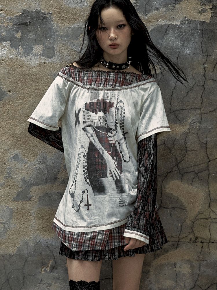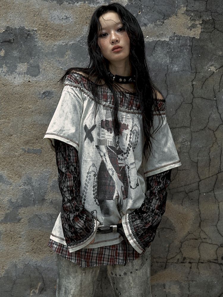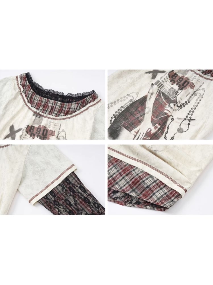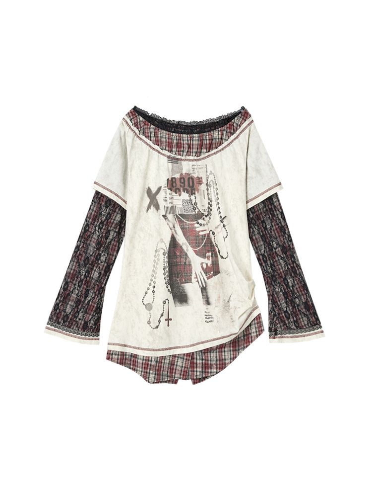 Fake Two Loose Plaid Lace Top【s0000009750】