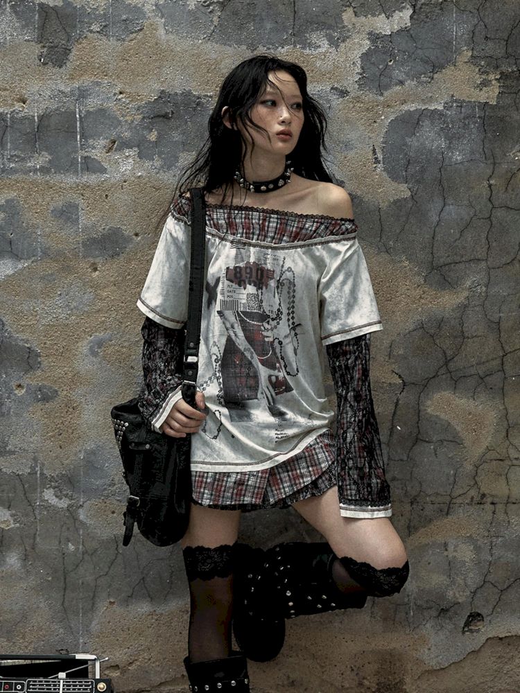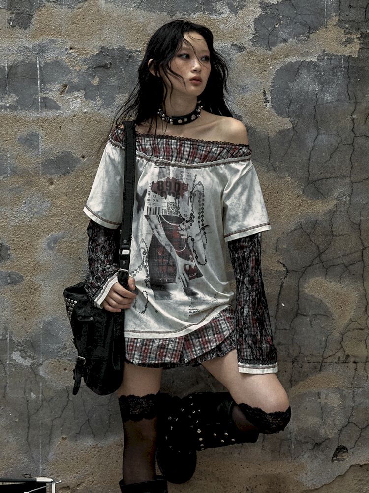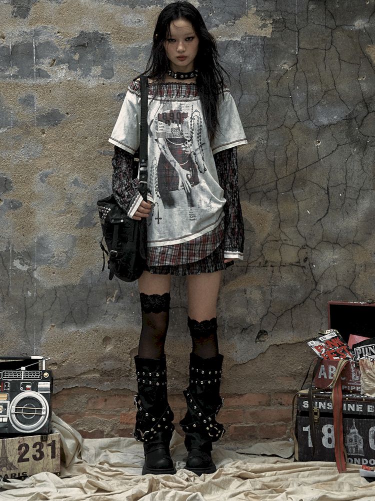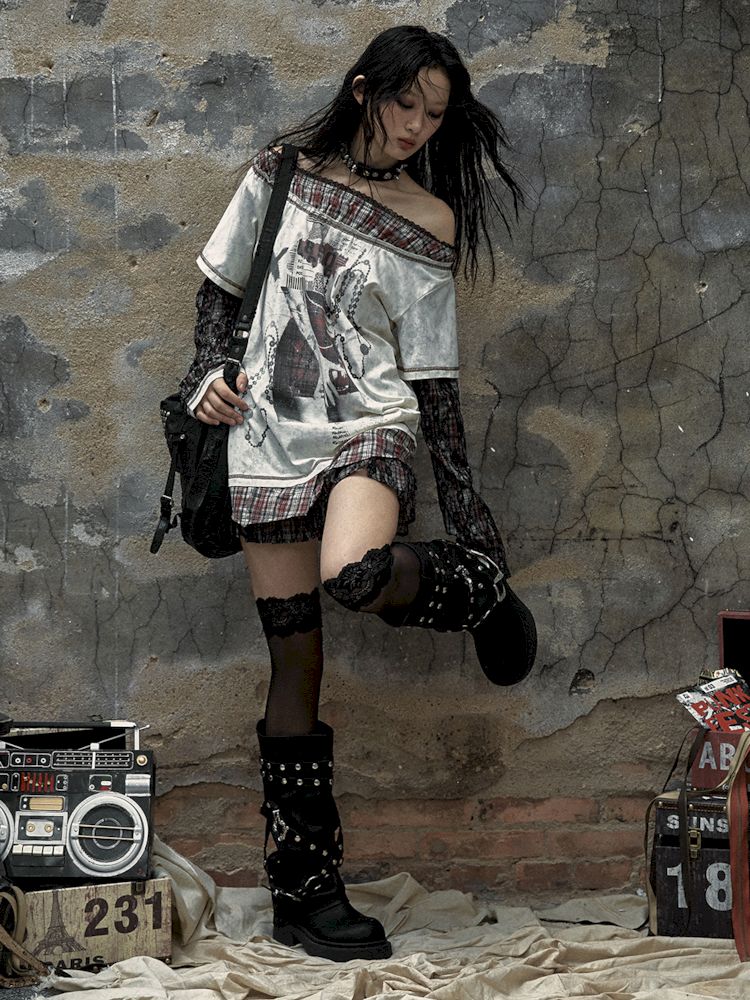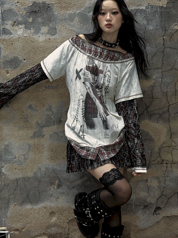 Fake Two Loose Plaid Lace Top【s0000009750】