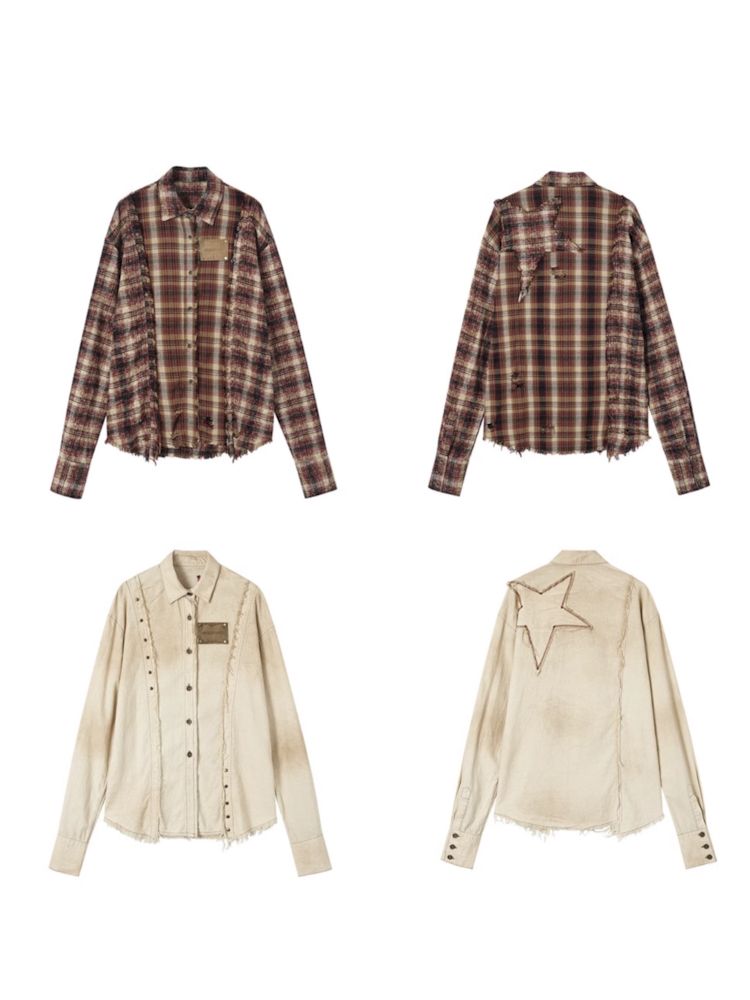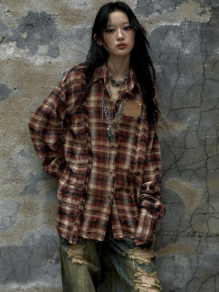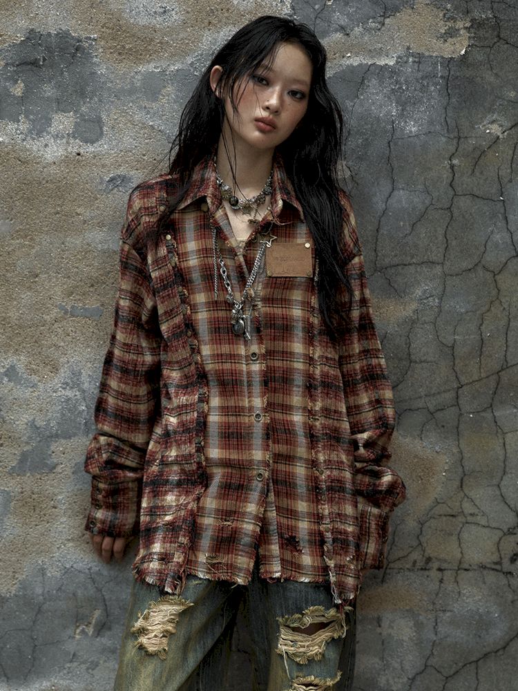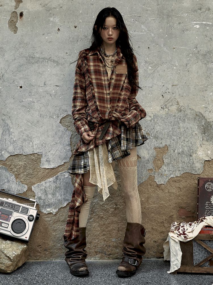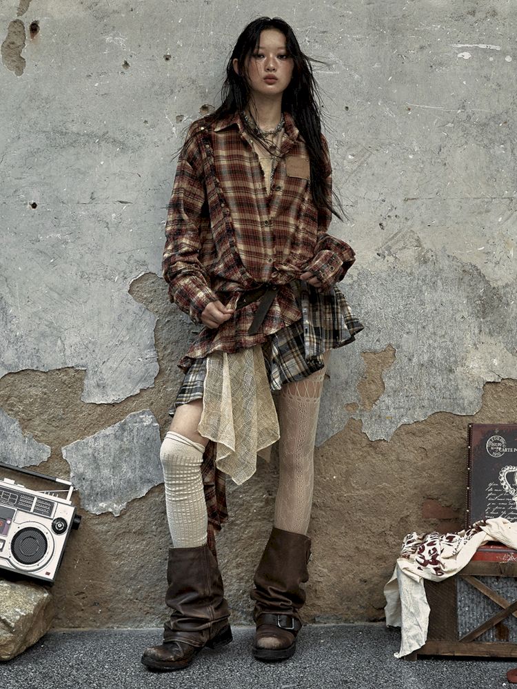 Old washed color collision plaid shirt【s0000009754】