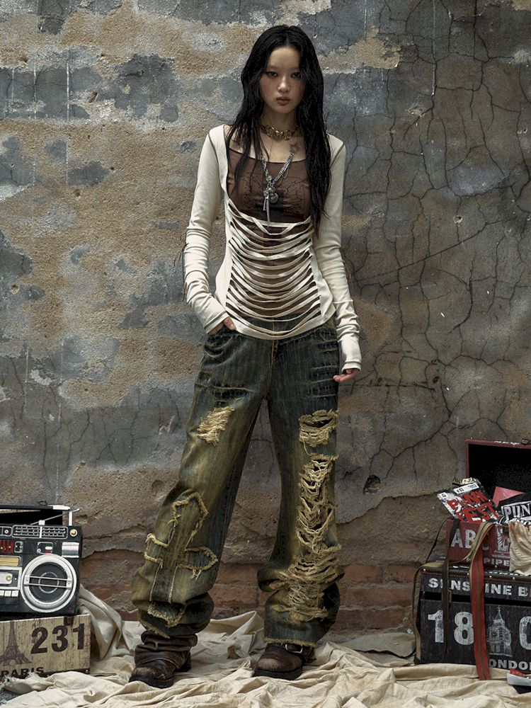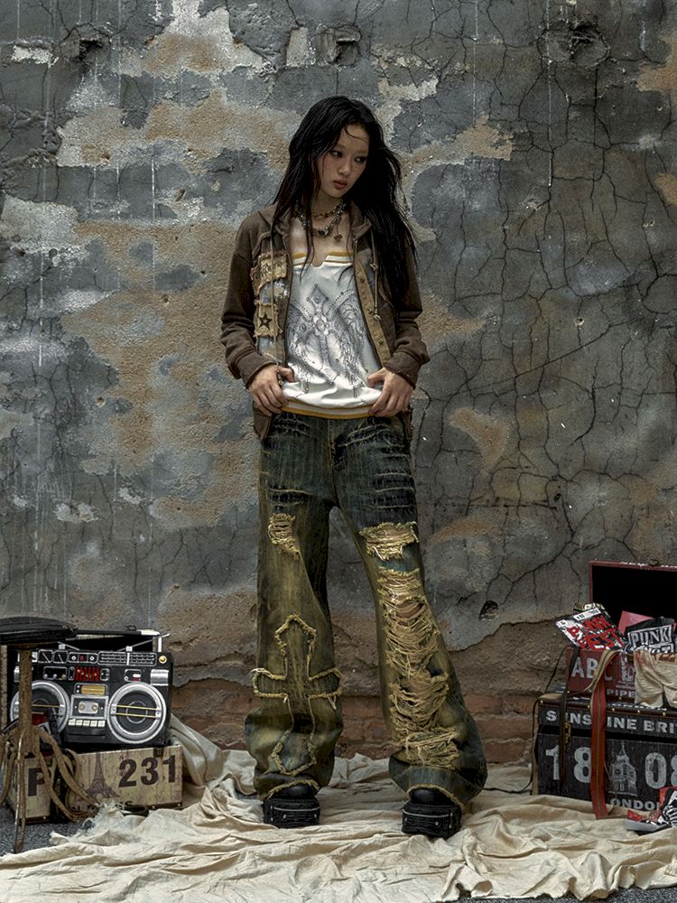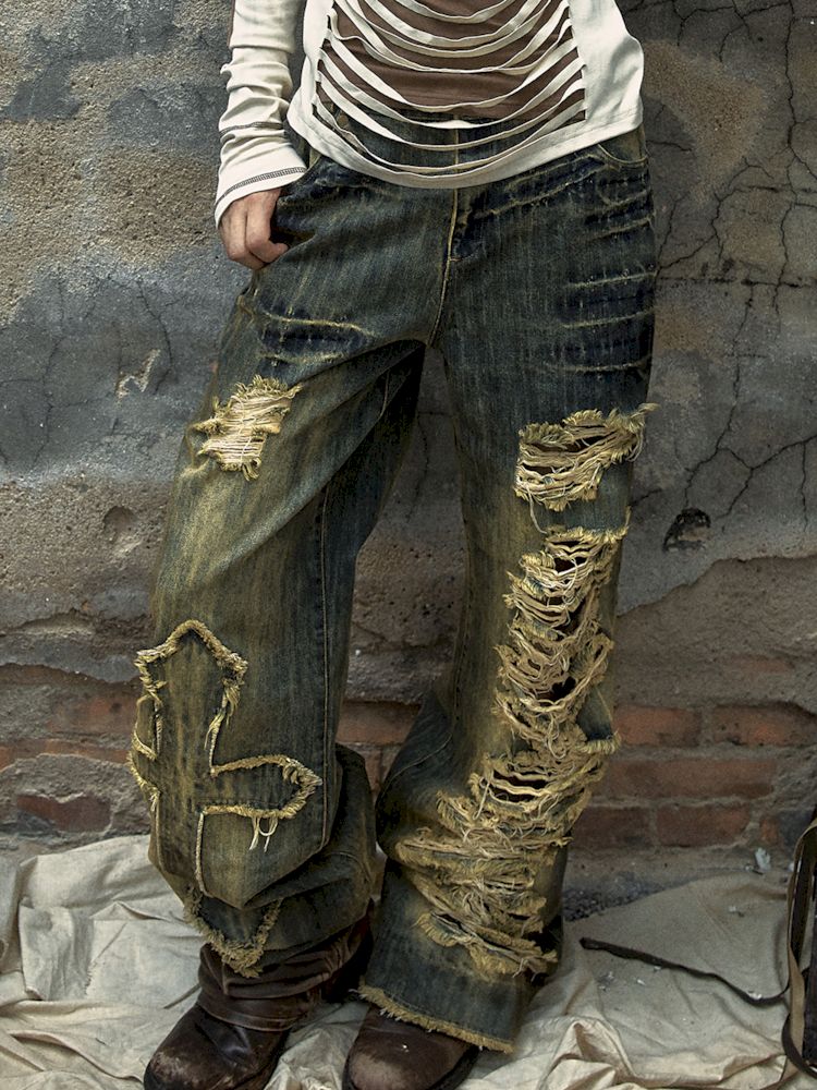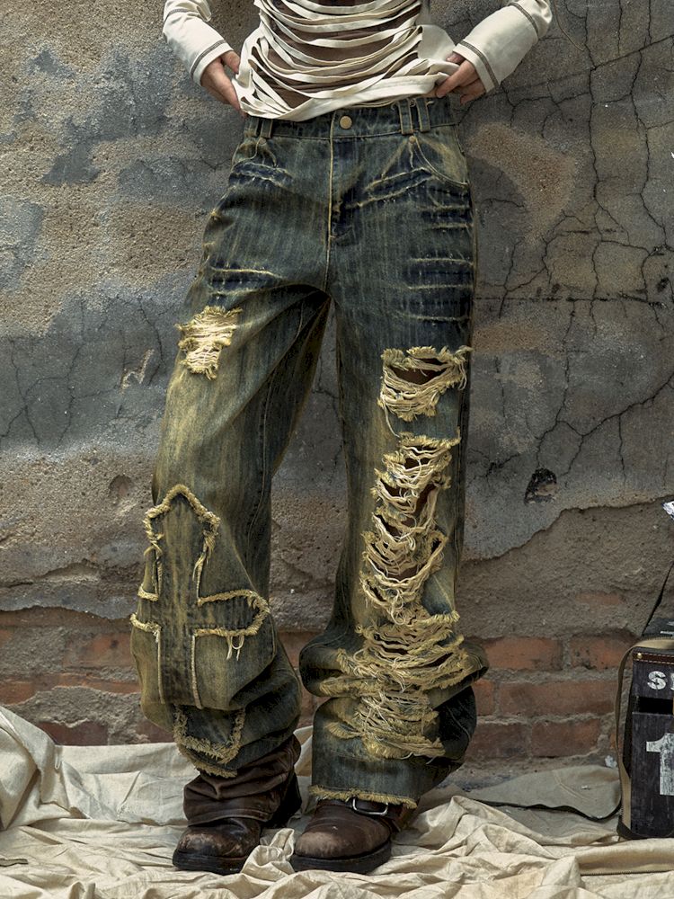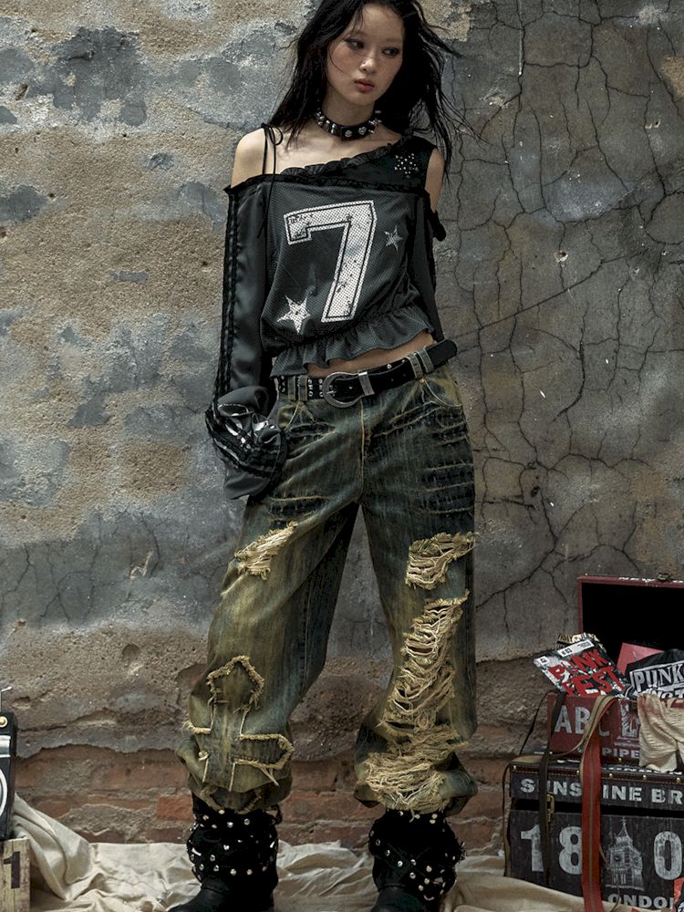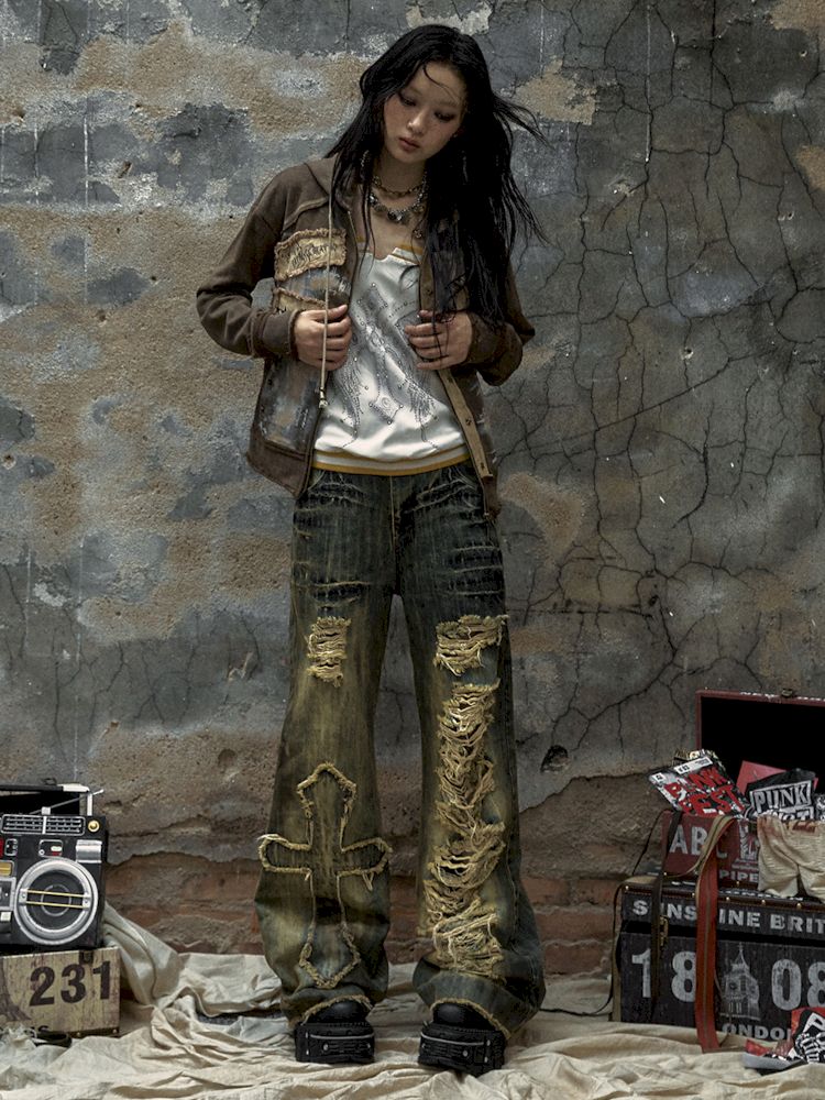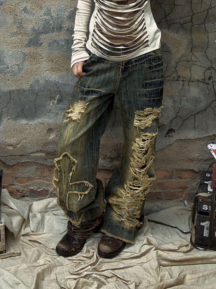 Washed ripped holes loose wide leg jeans【s0000009756】