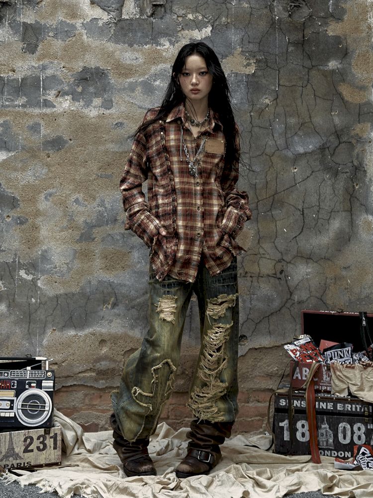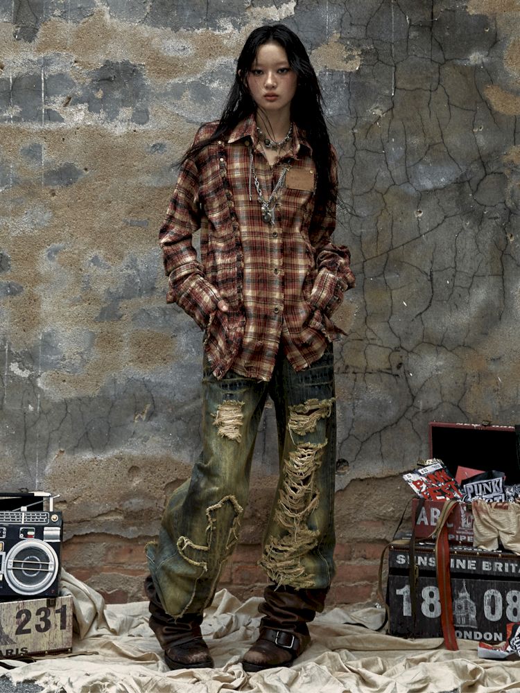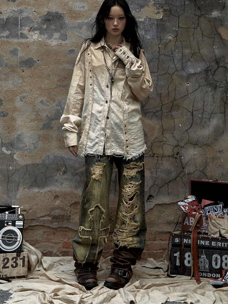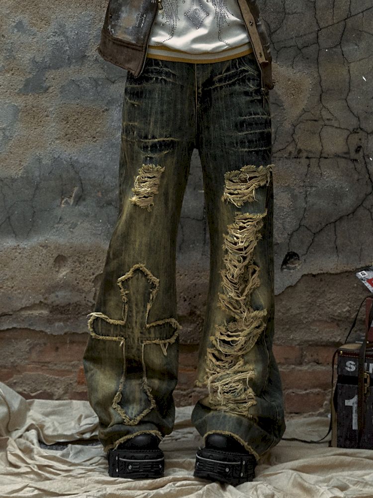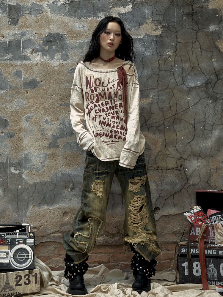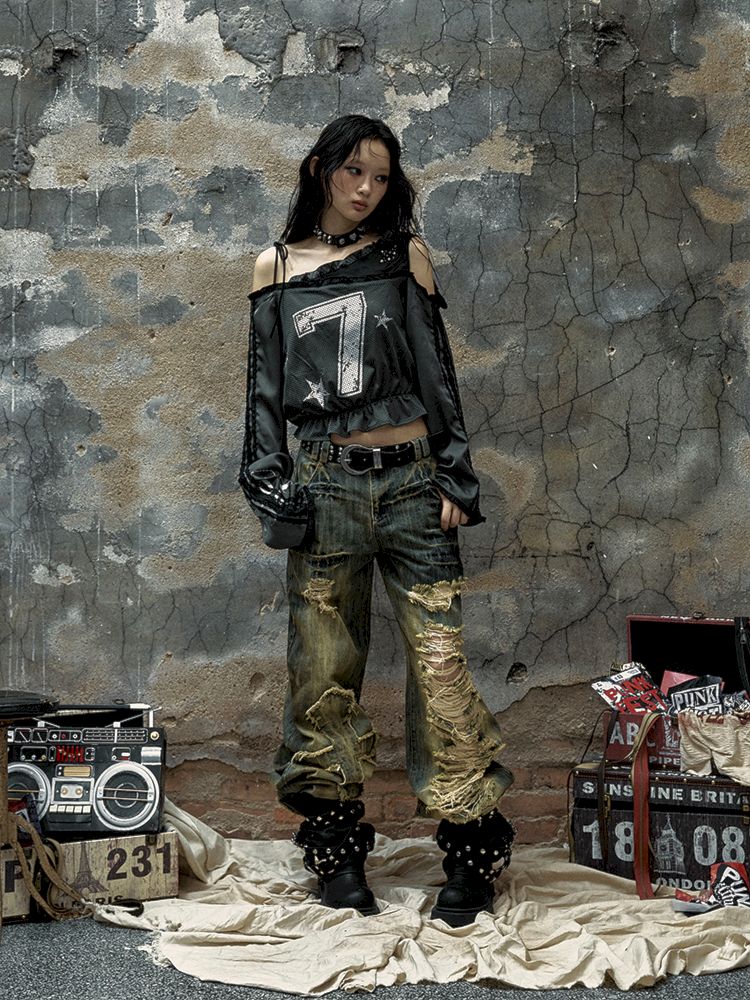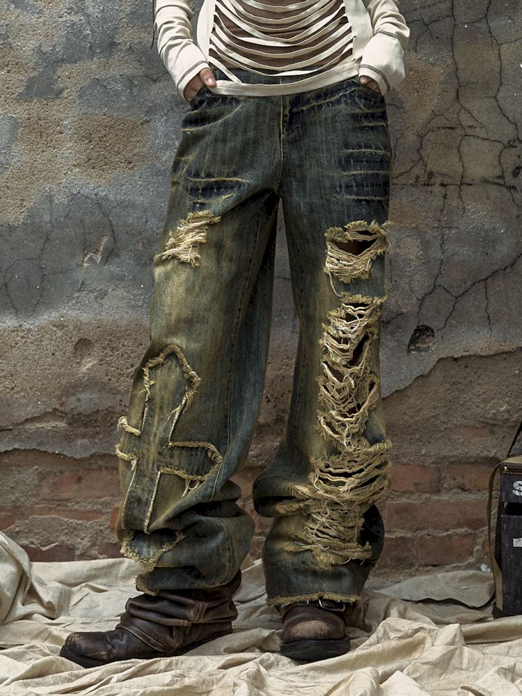 Washed ripped holes loose wide leg jeans【s0000009756】