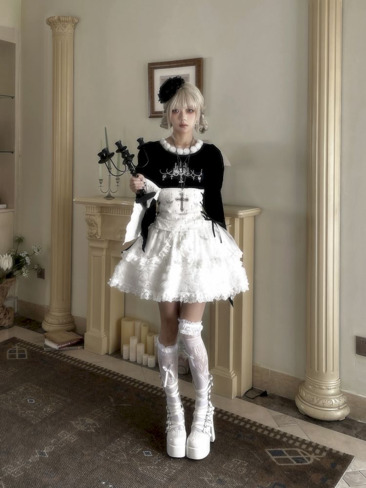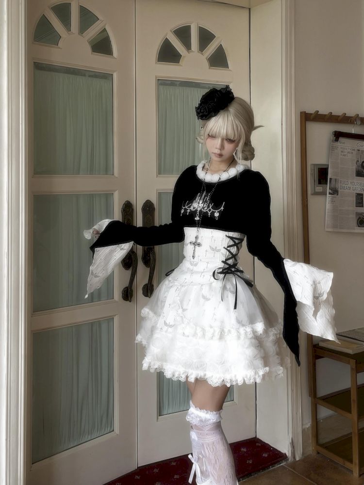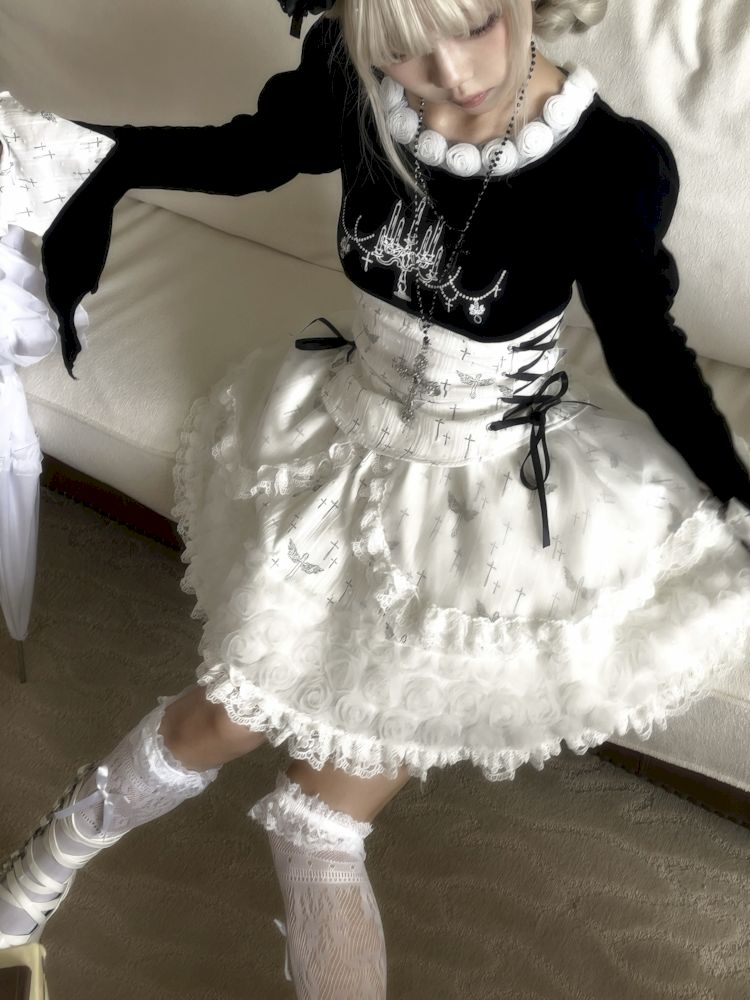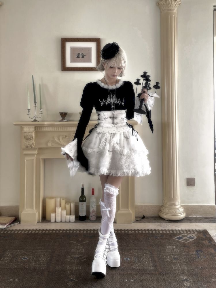 Candlestick Cross Print Flared Sleeve Tee Top【s0000009992】