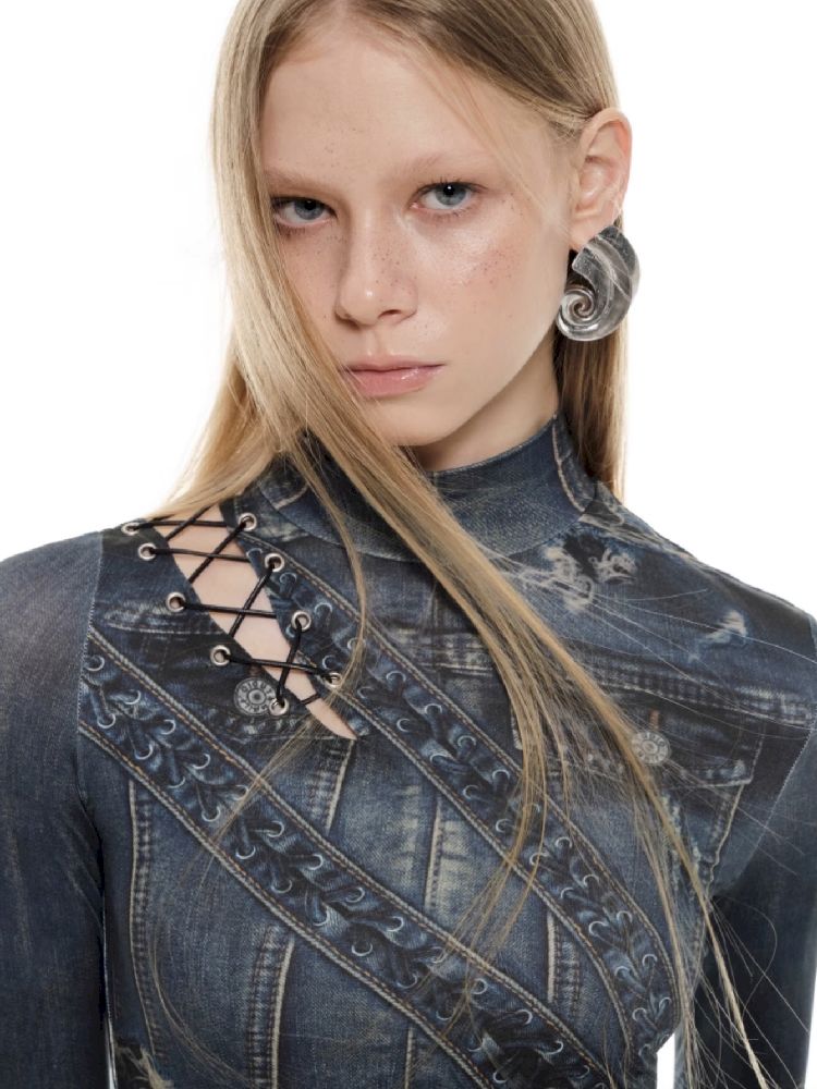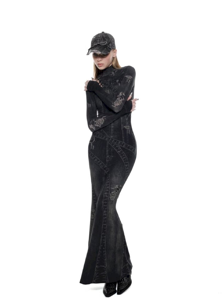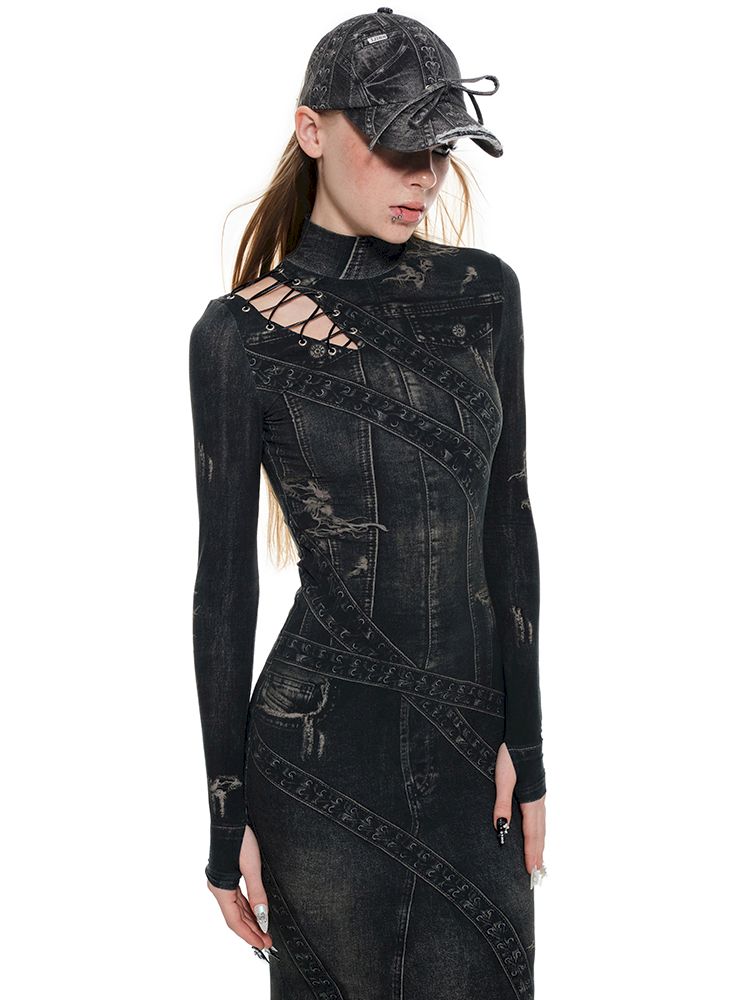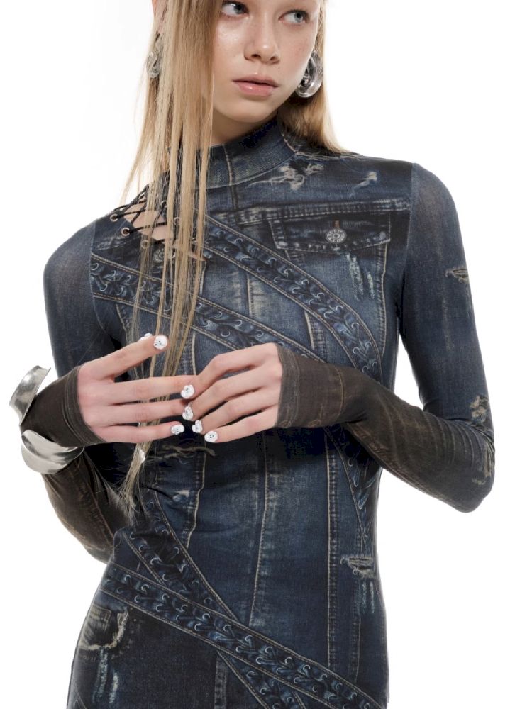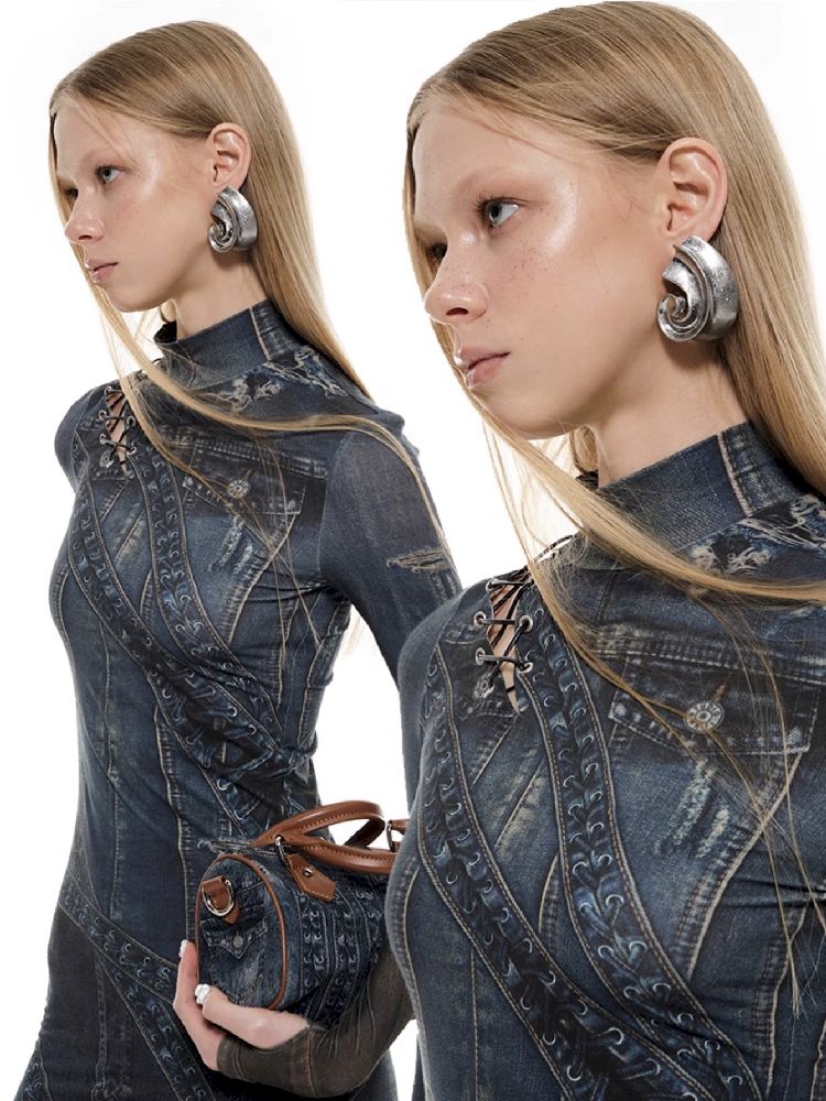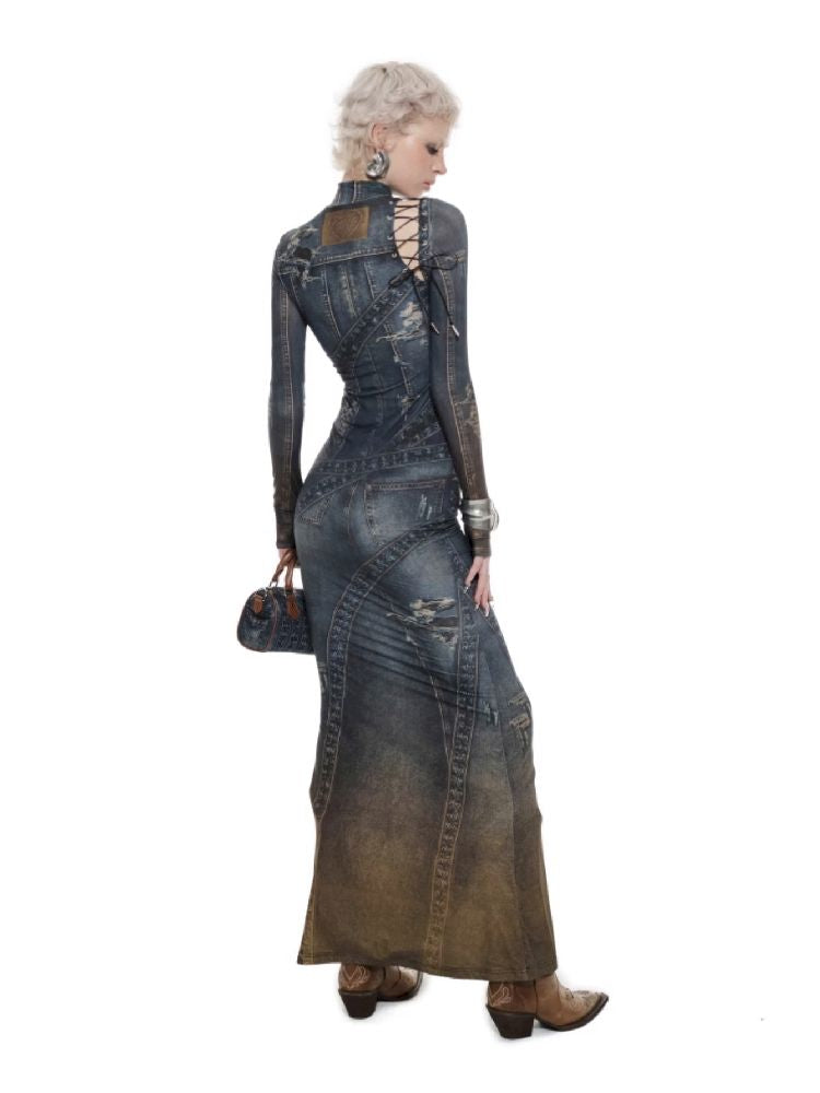 Denim Printed Long High Neck Dress【s0000010195】