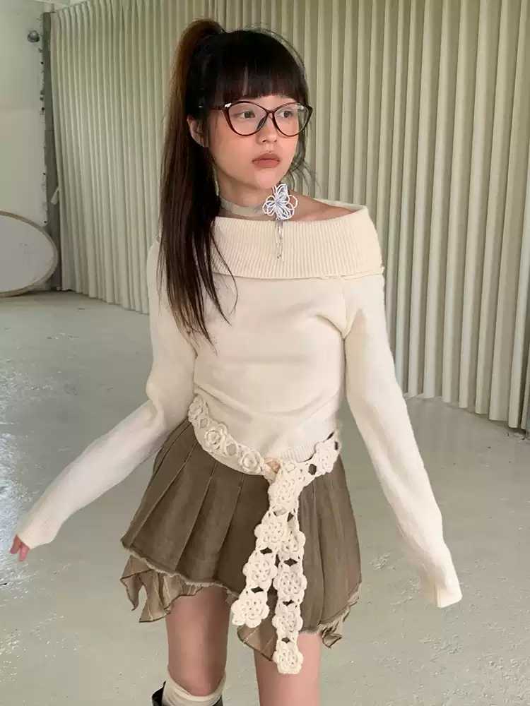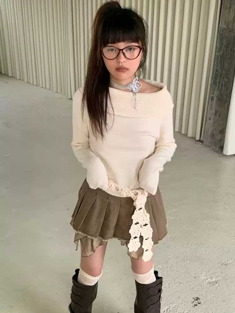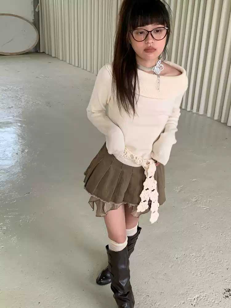 Beige one-shoulder sweater【s0000010575】