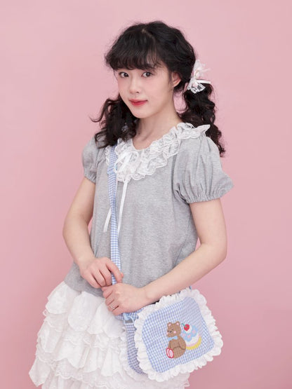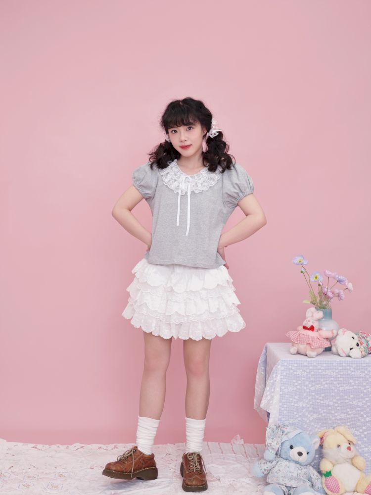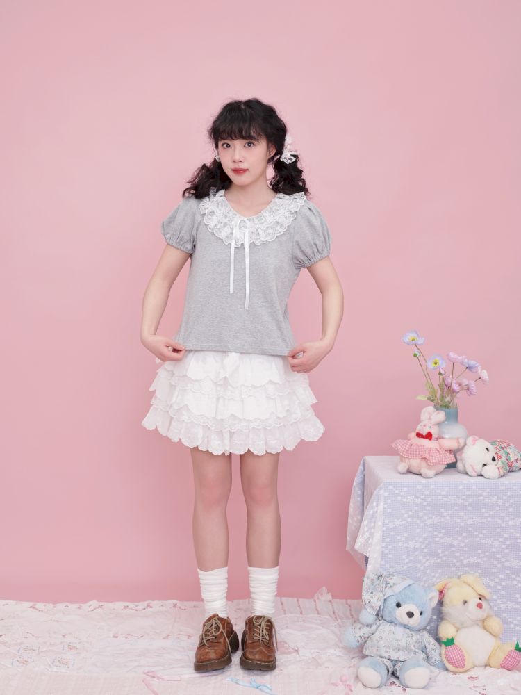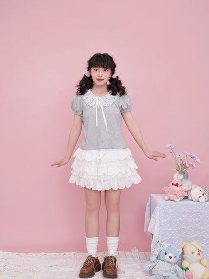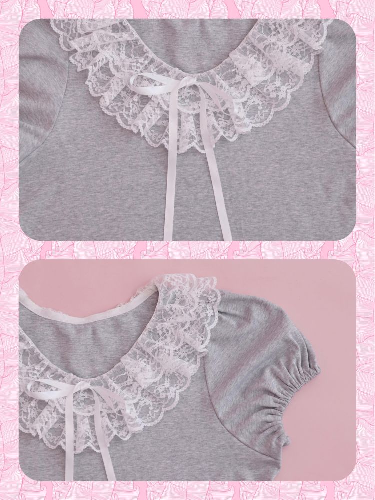 Lace Collar Bow Bubble Sleeve Gray T-Shirt【s0000012386】
