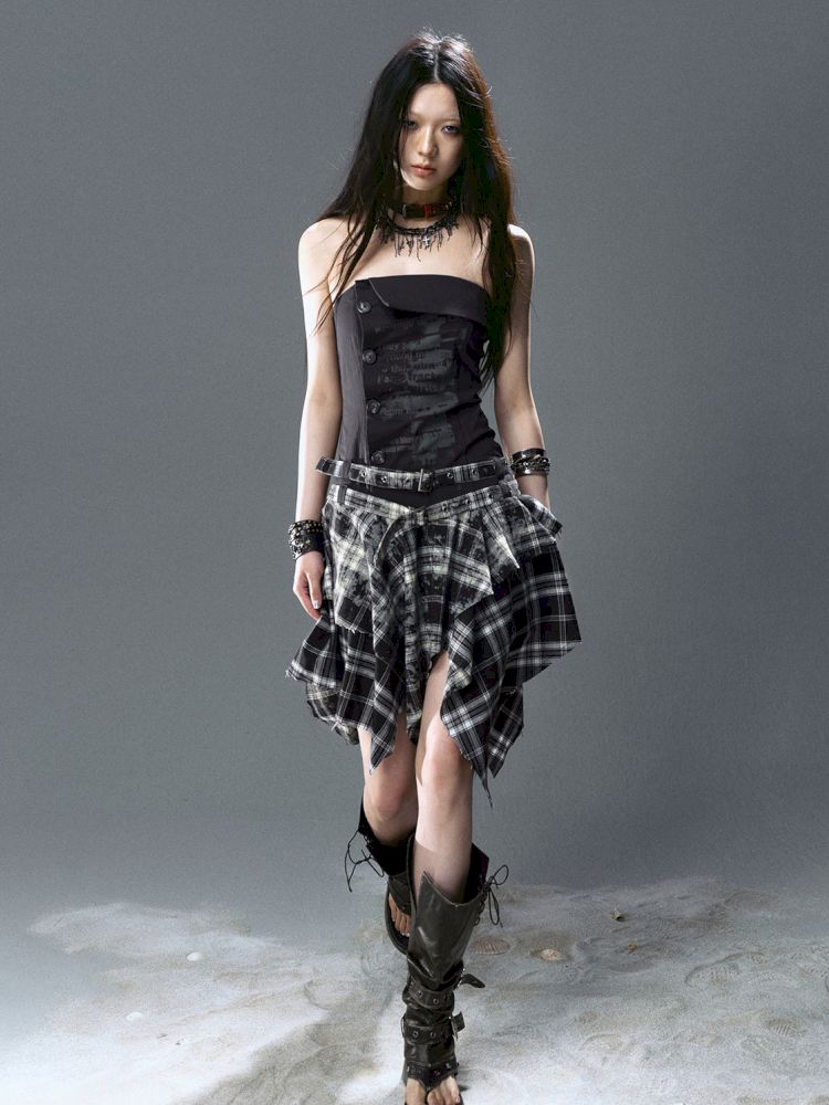 Asymmetrical patchwork plaid strapless dress【s0000012808】