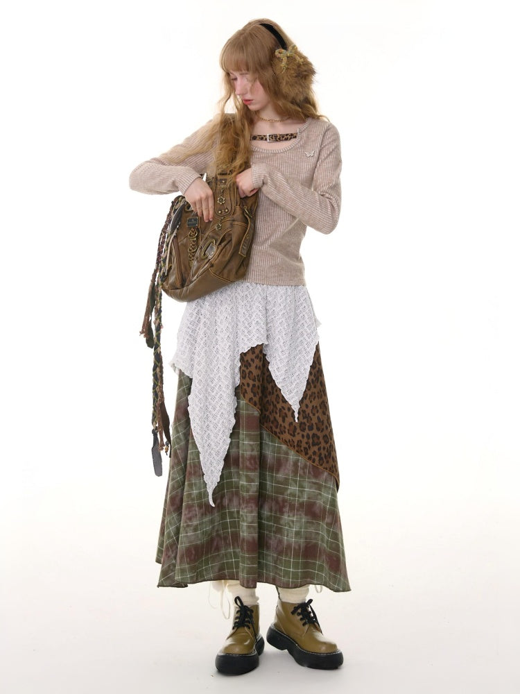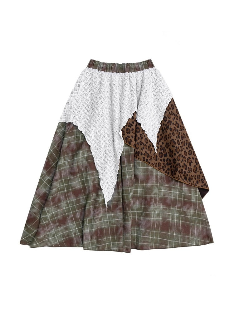 High Waist Slimming Irregular Plaid Splicing Leopard Print Midi Skirt【s0000014786】
